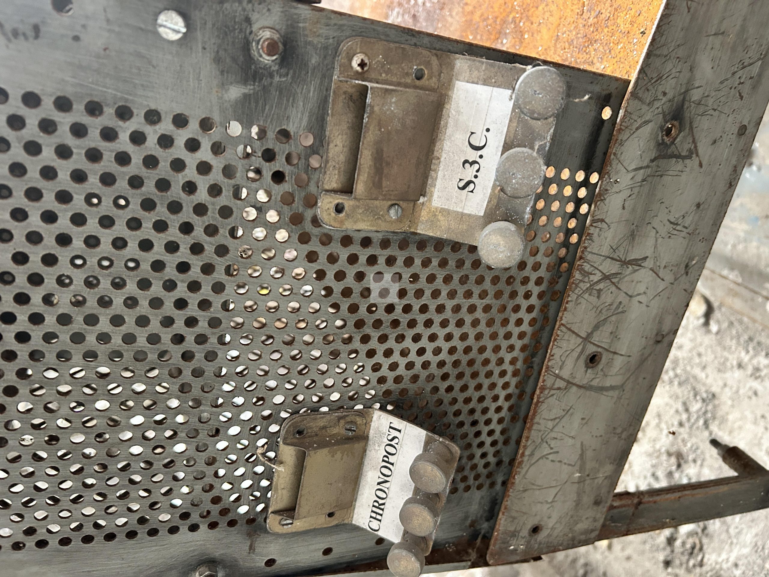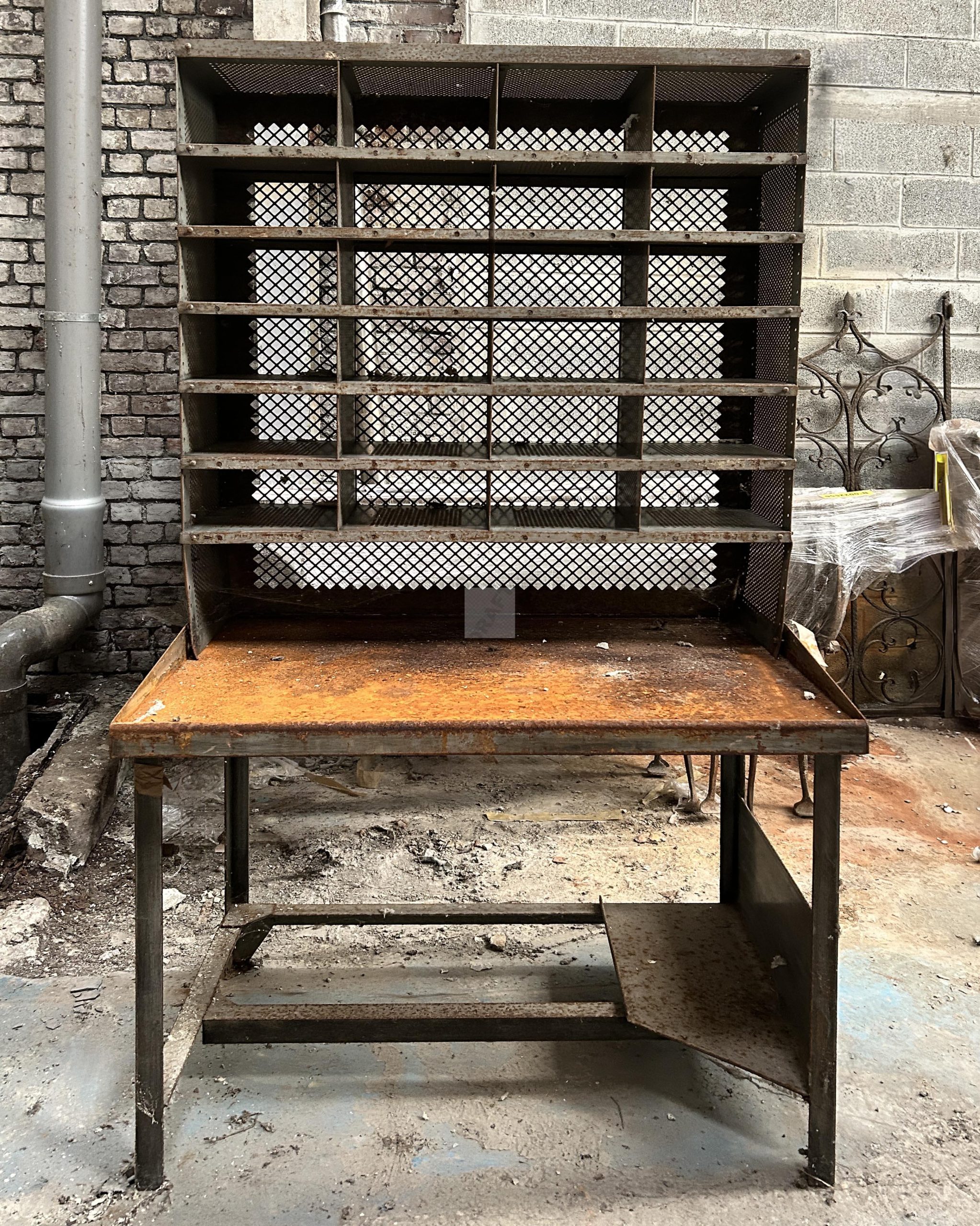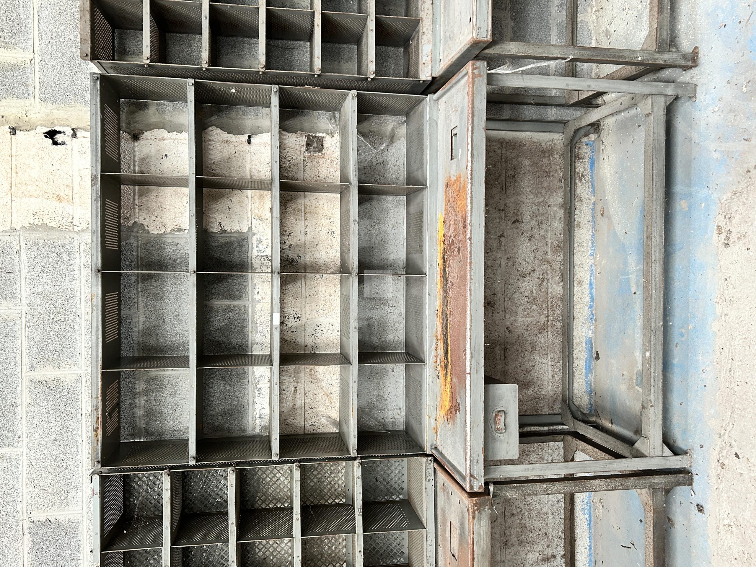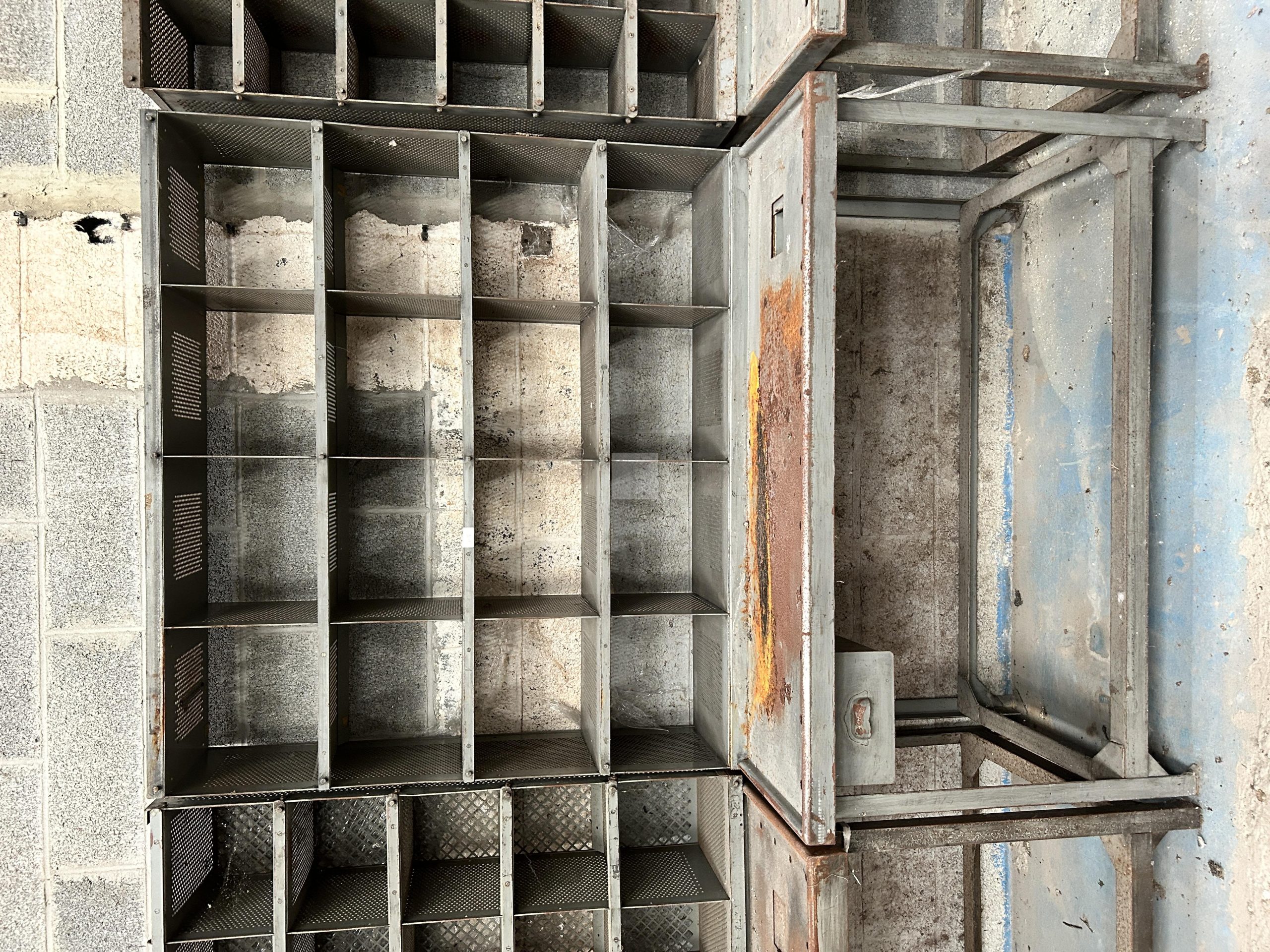 71 Suite de 6 meubles de tris à courriers, l’un double avec assise pivotante, présentant une table de tri en partie basse surmontée de casiers en métal perforé. Usures, rouille, Env. 193×125(105 pour l’un d’eux)x71 cm