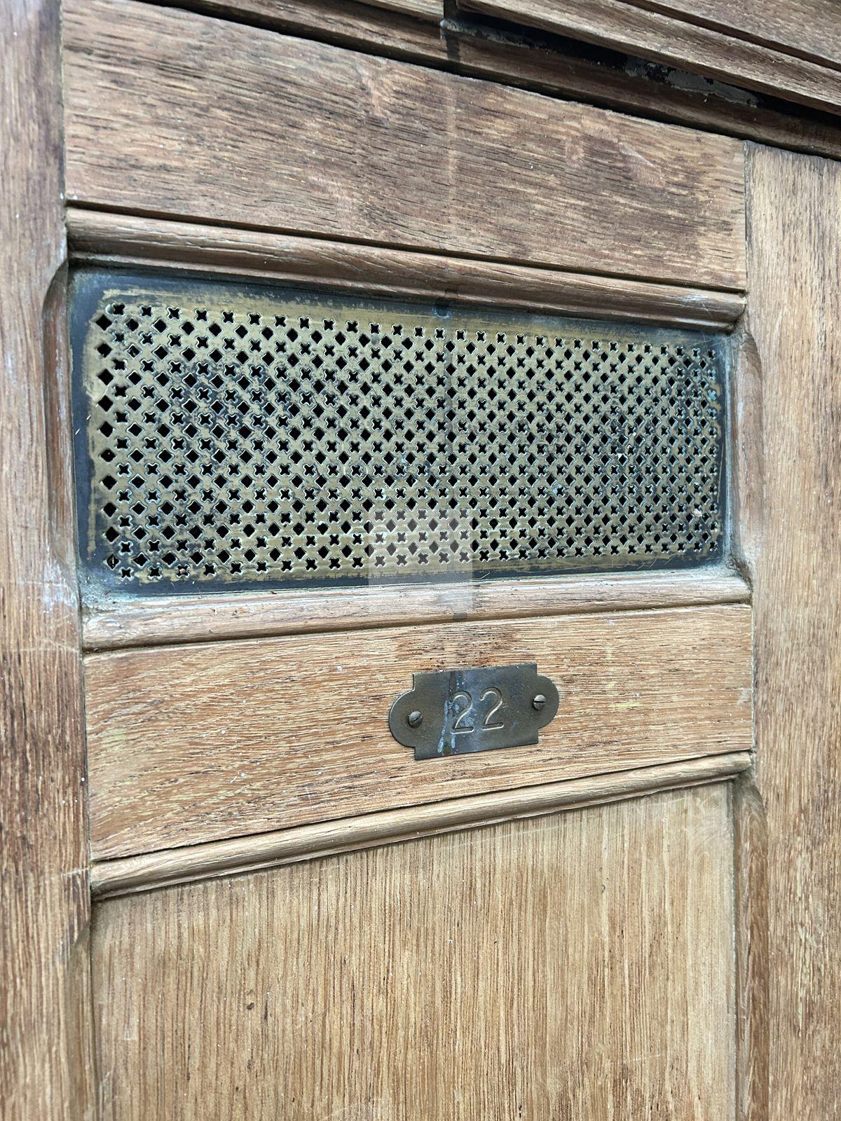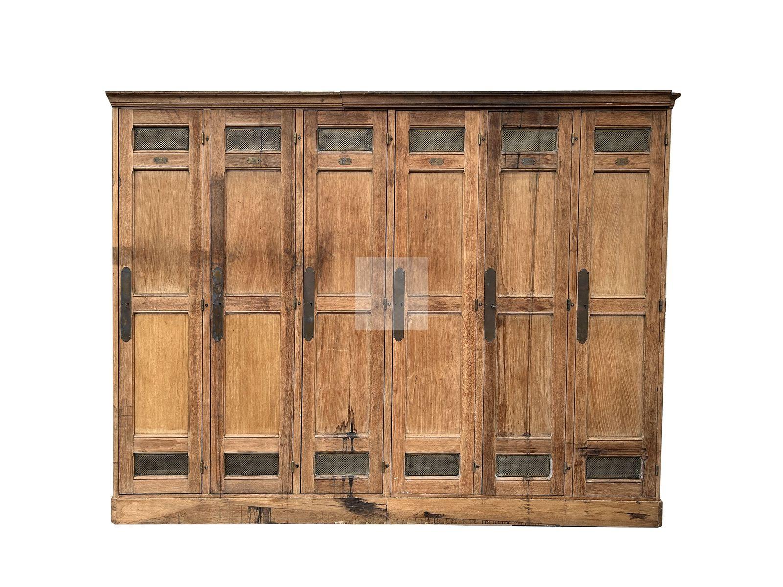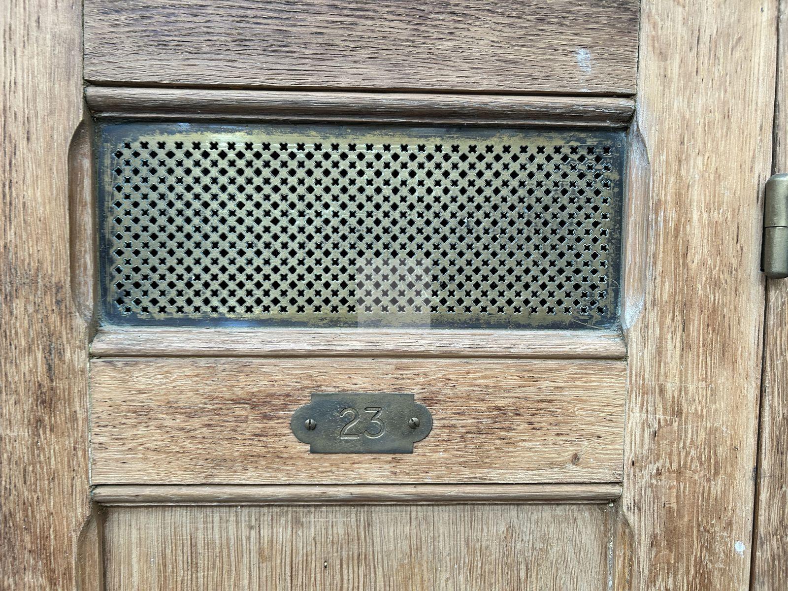 Lot n°74 - 74 Vestiaire en chêne et laiton ouvrant par six vantaux, usures, 202x273x50 cm