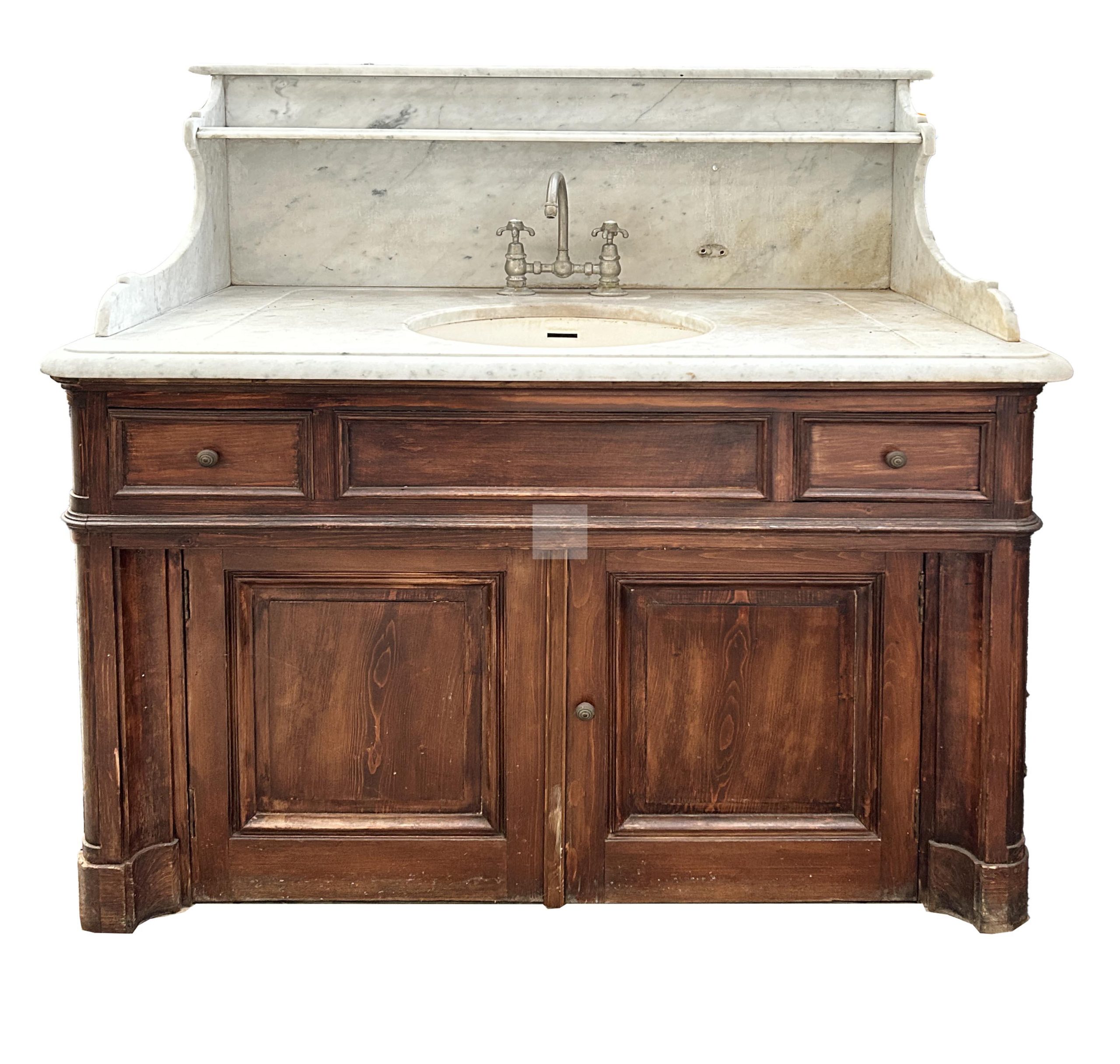 82 Meuble lavabo en bois naturel ouvrant à deux tiroirs et deux vantaux, plateau de marbre à gradin (manque certains accessoires) 124x120x67.5 cm