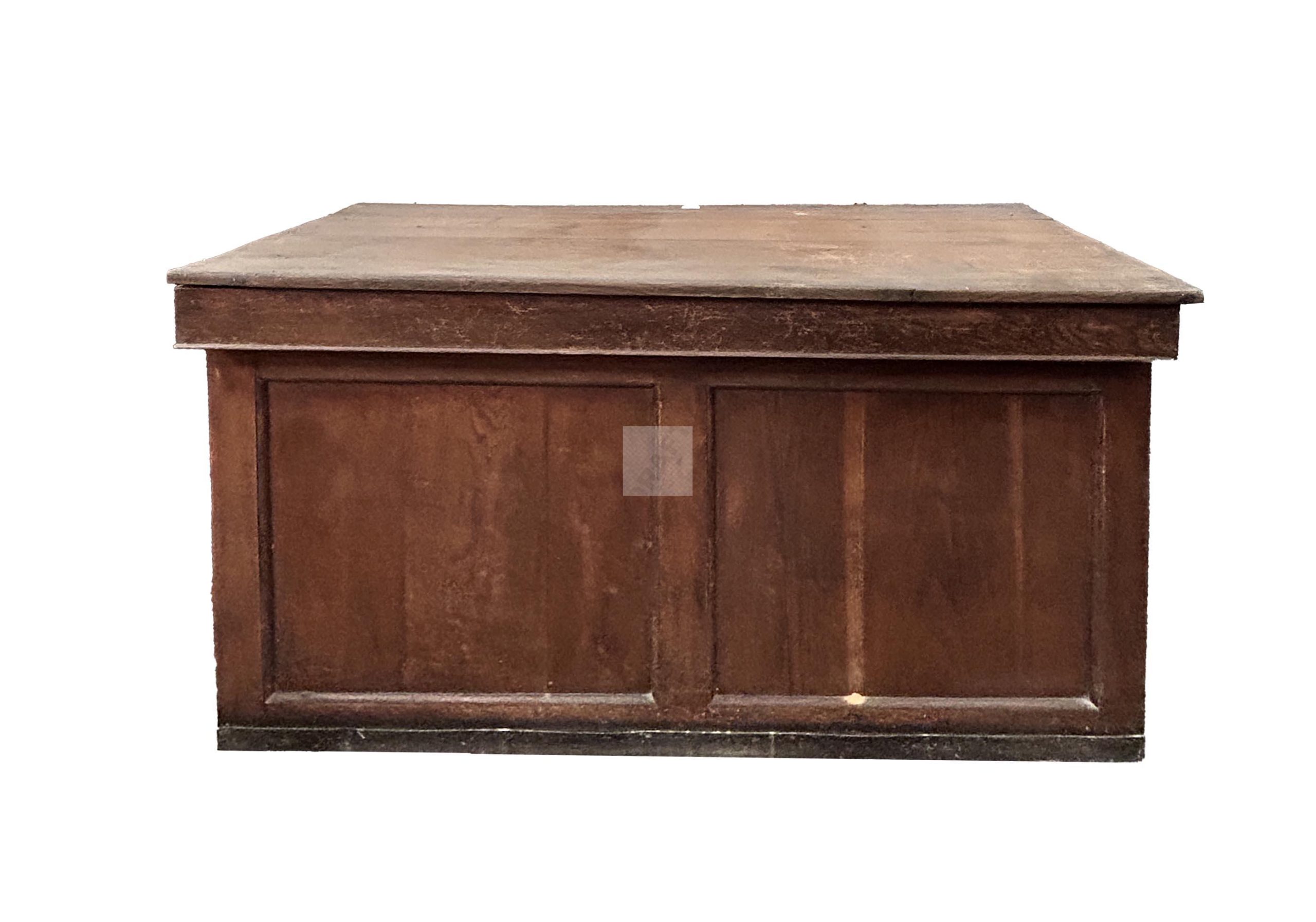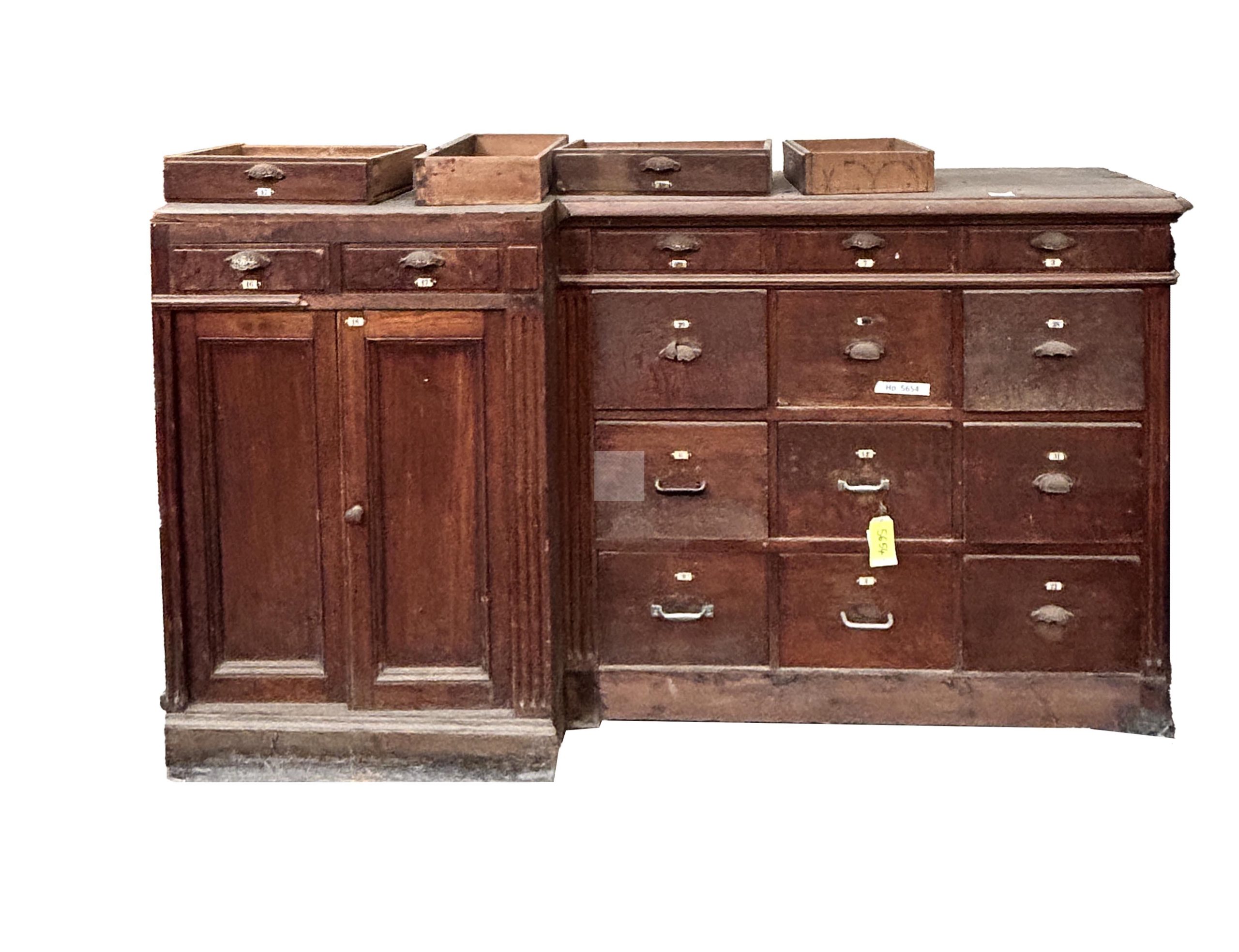 84 Lot de trois meubles de magasin dont un comptoir à gradin ouvrant à cinq tiroirs 97x116x74 cm, un élément de comptoir de quincailler ouvrant à de nombreux tiroirs et vantaux 88x168x43cm, un comptoir (manque le tiroir en façade) 83x147x66cm