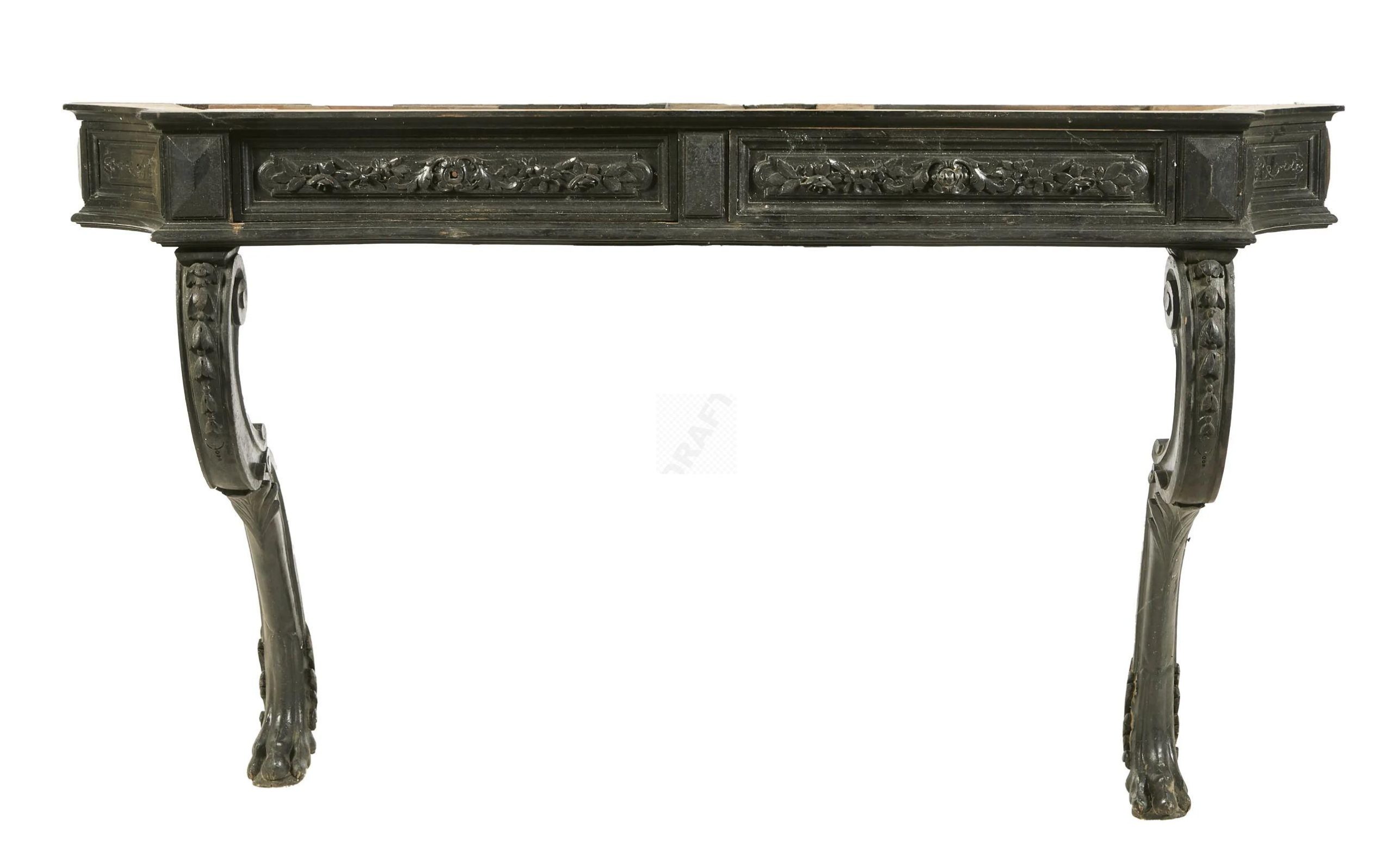 85 Console en bois noirci à décor de motifs stylisés, pieds en console à terminaison en griffe. Fin du XIXème siècle. Etat d’usage, manque le marbre 84x146x40 cm