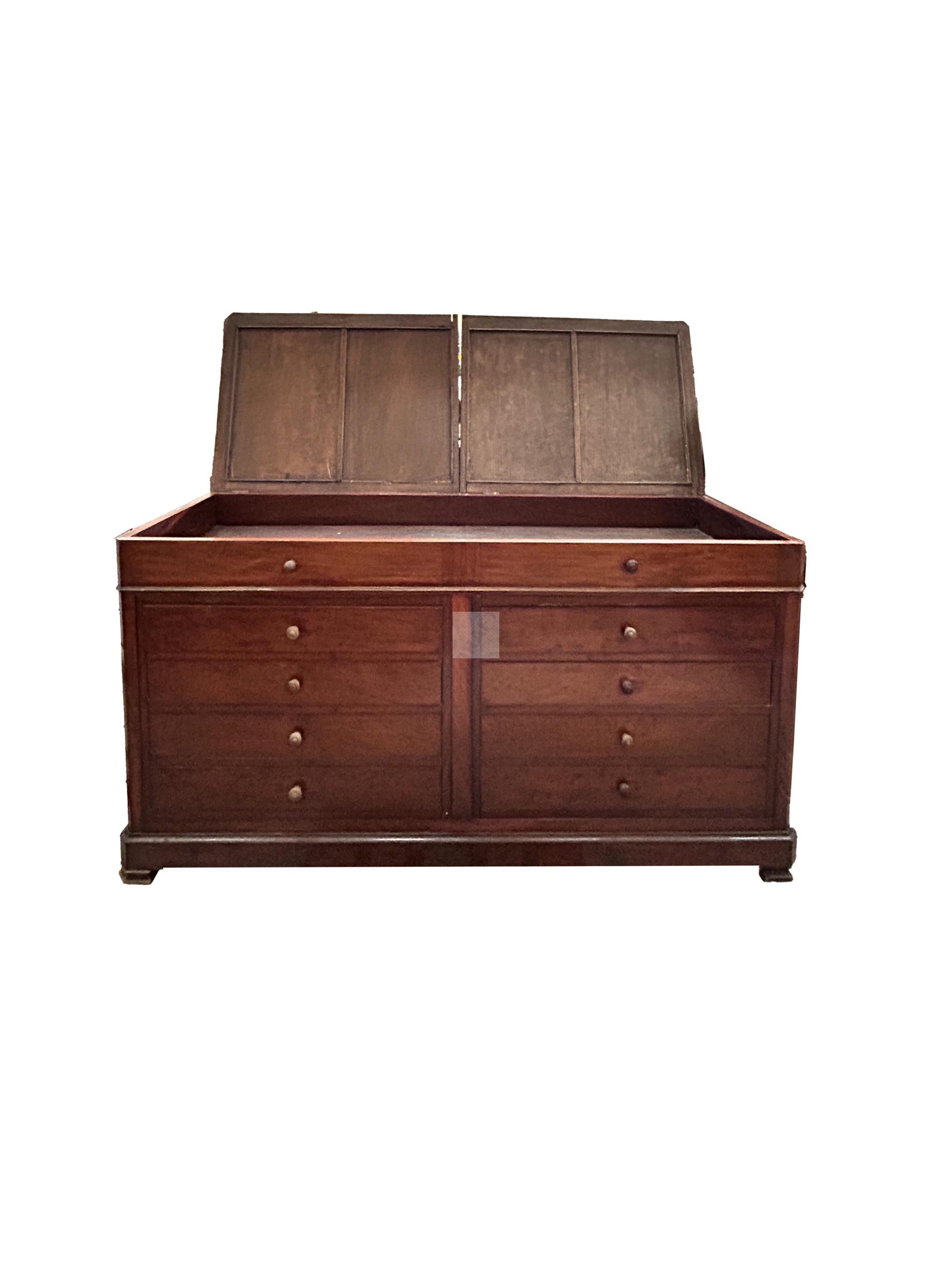 89 Meuble de collectionneur à hauteur d’appui en acajou et placage d’acajou ouvrant en partie haute par deux vantaux, huit tiroirs en façade, montants à pans coupés. Epoque Restauration (état moyen) 90x189x69.5cm