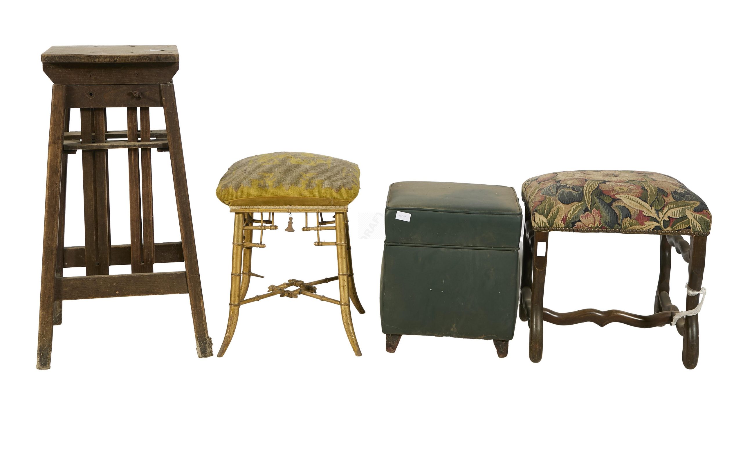 153 Lot composé d’un tabouret en bois naturel à hauteur réglable vers 1930, un tabouret de style Louis XIII, un tabouret à piétement en bois doré à l’imitation du bambou (accidents) et un tabouret vers 1950-60 garni de skaï.