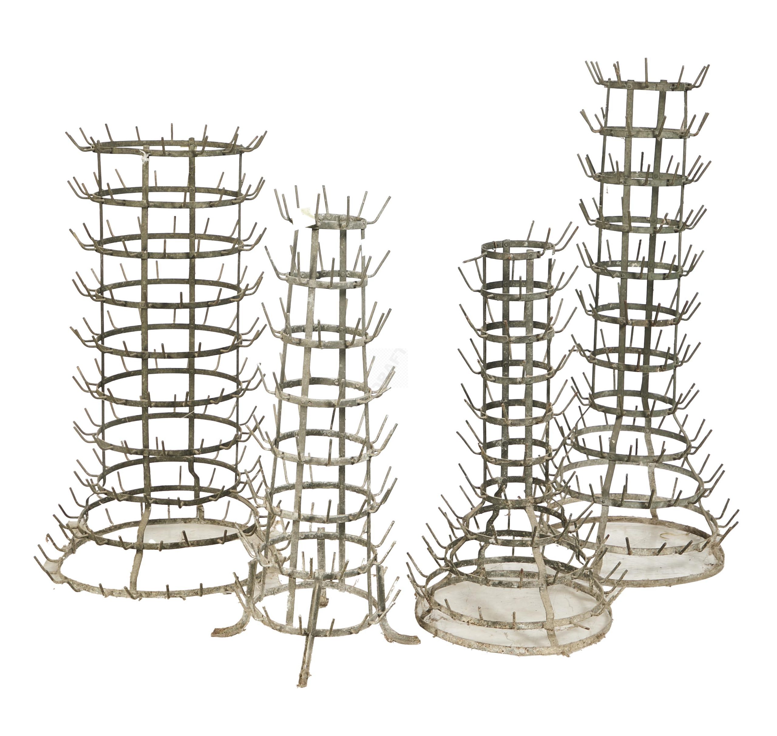 171 Quatre séchoirs à bouteilles en métal, hauteur : 103 à 138 cm. L’un un peu accidenté.