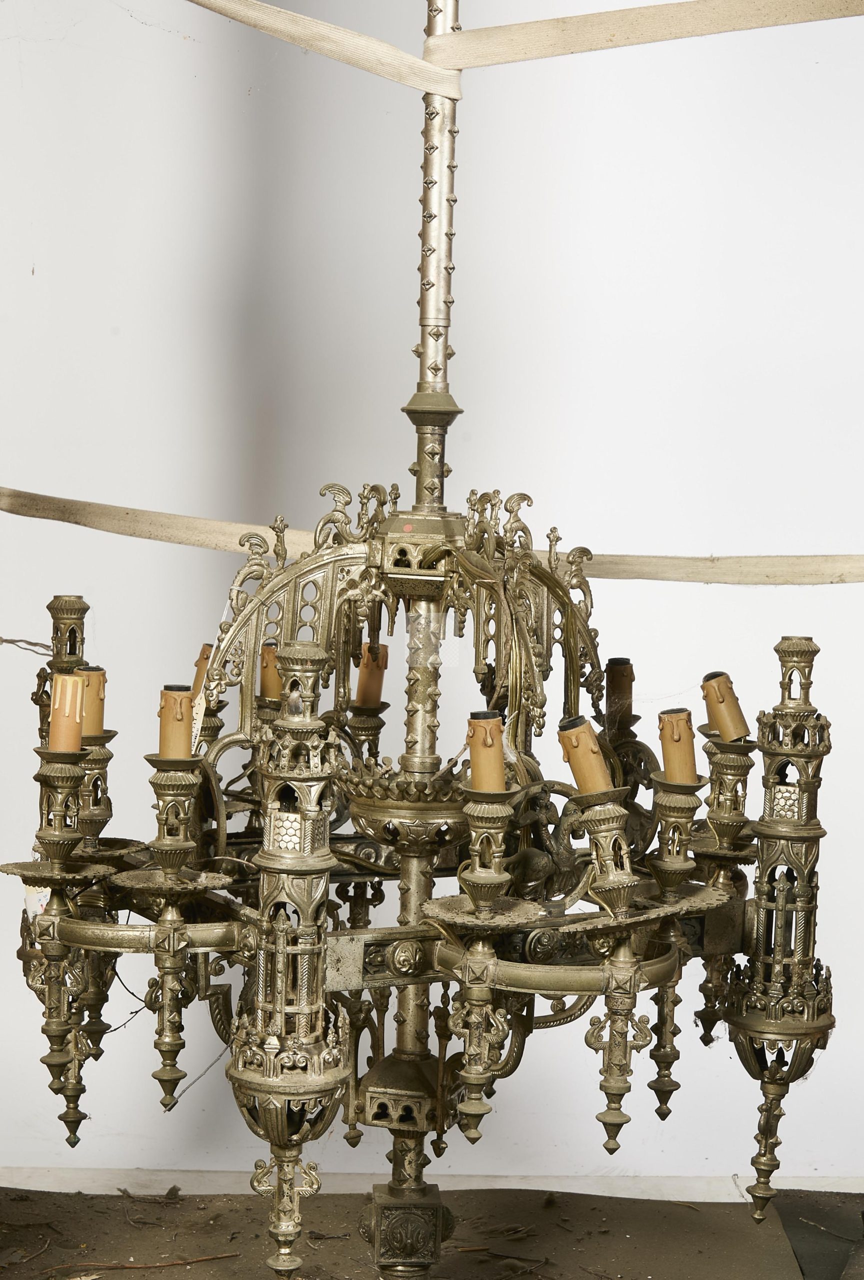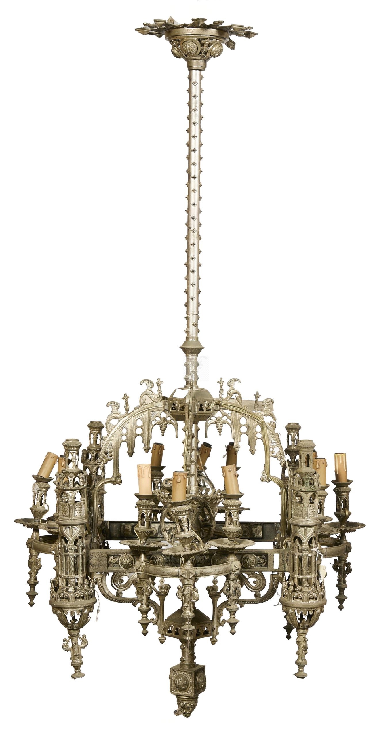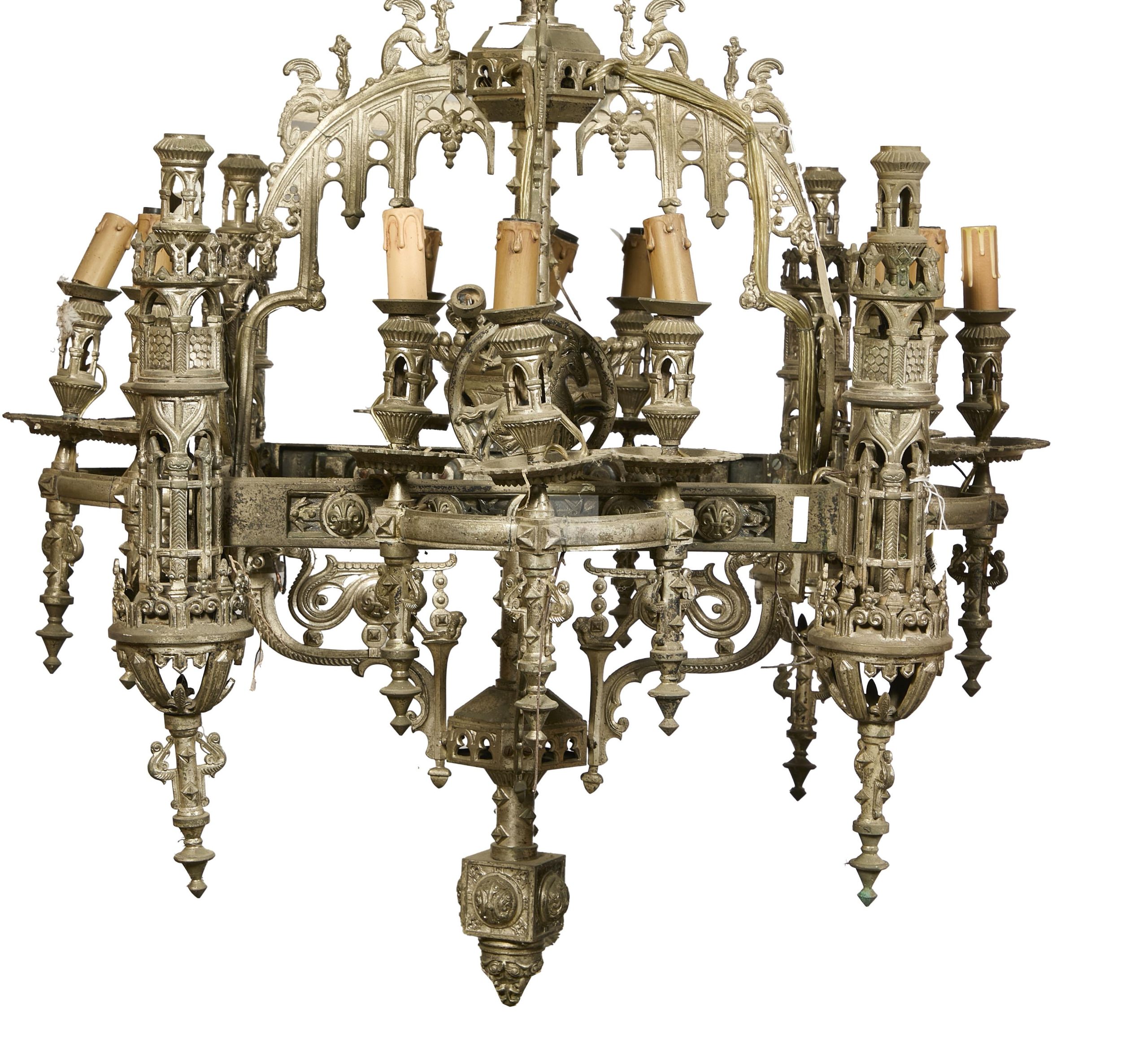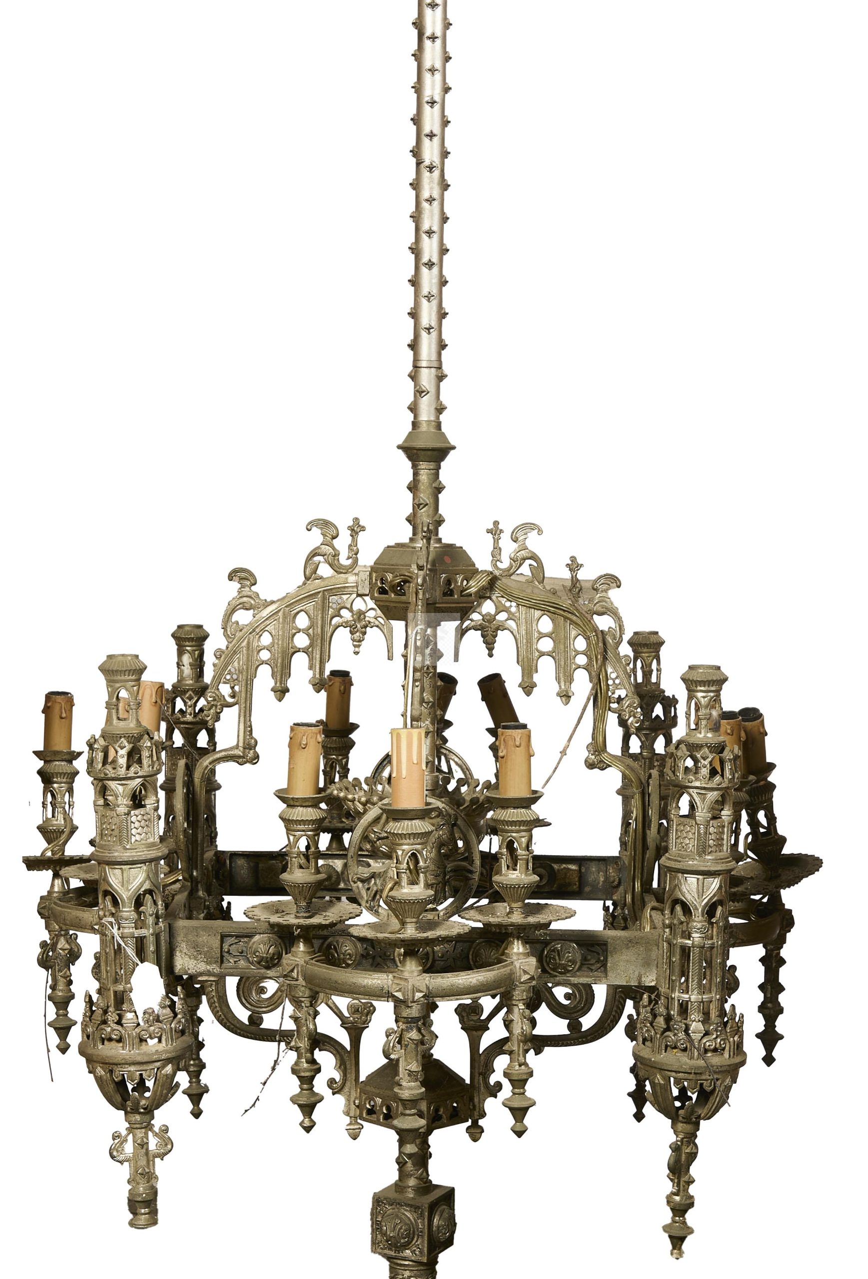 204 Lustre en bronze à patine argenté agrémenté de quatorze bras de lumière, décor néogothique de fenestrage, fleurs de lys, chimère et chevalier dans des médaillons. Epoque 1880 (état d’usage) Environ 160x81cm