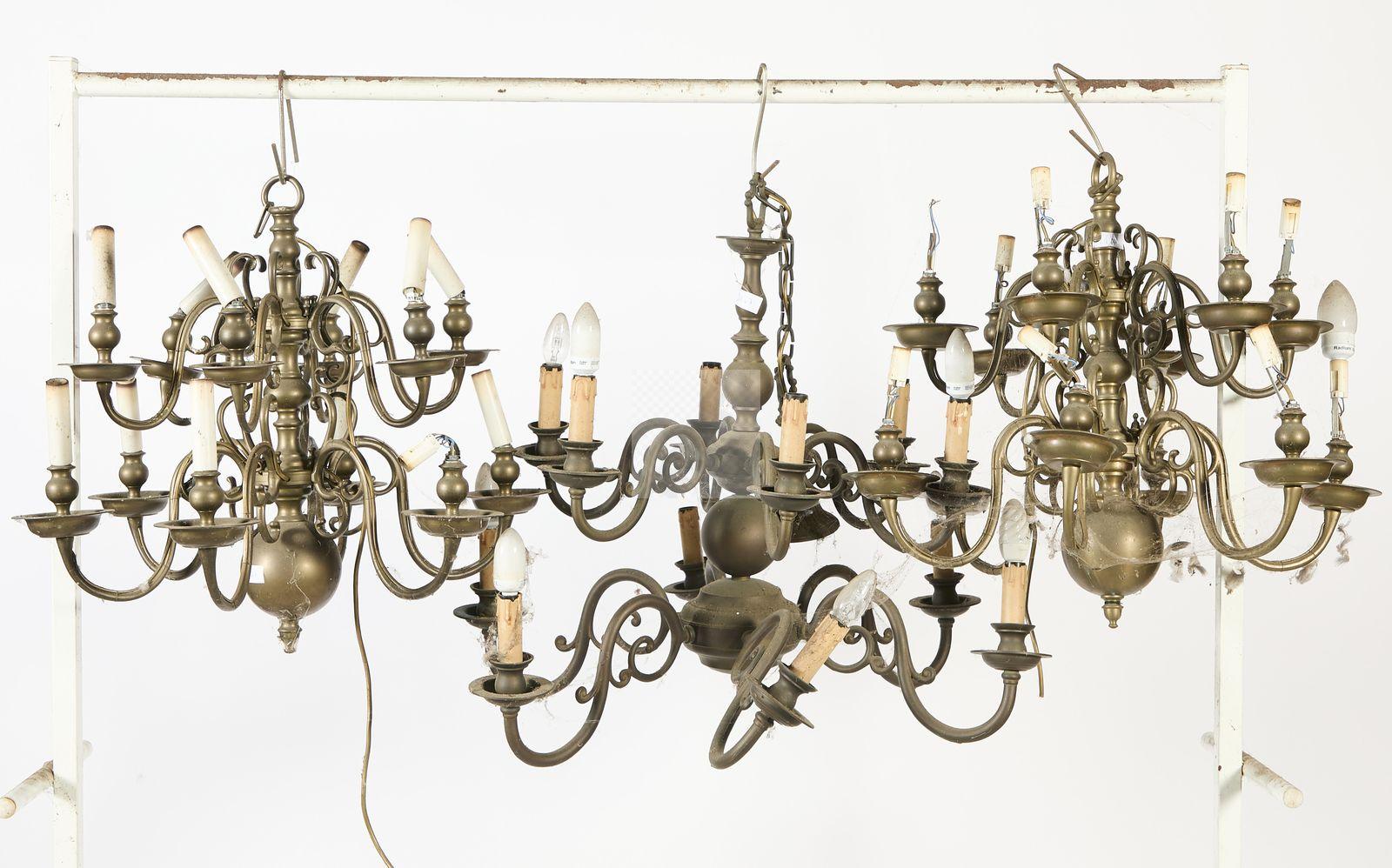 211 Sept lustres de style hollandais ou austro-hongrois en laiton. Dim de 62×66 à 90x80cm (quelques accidents et manques)