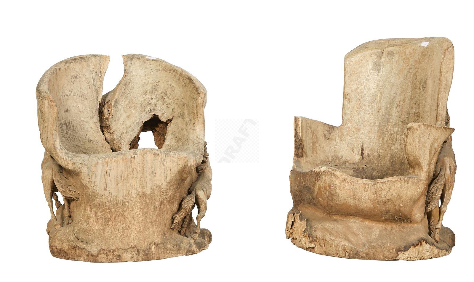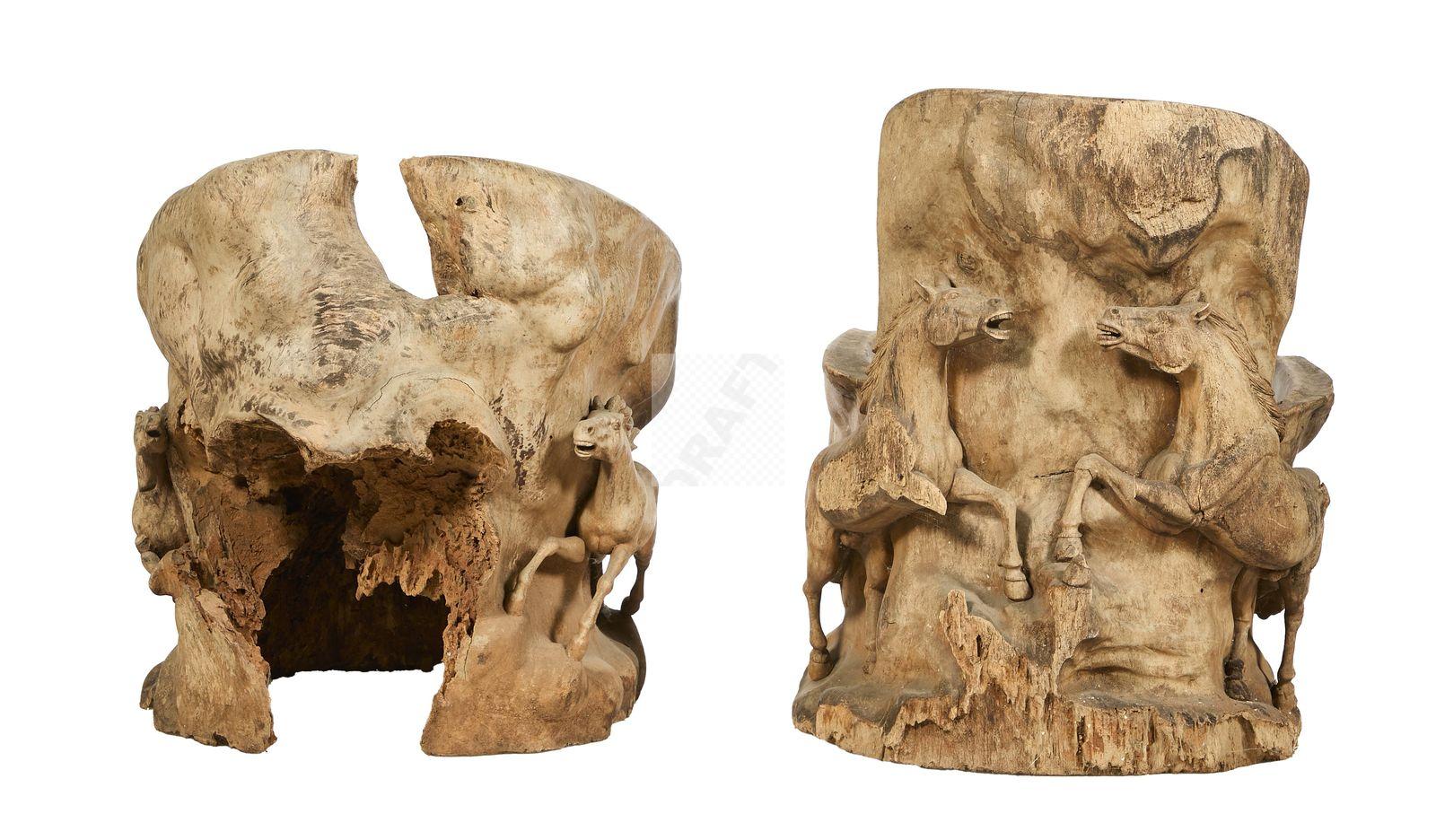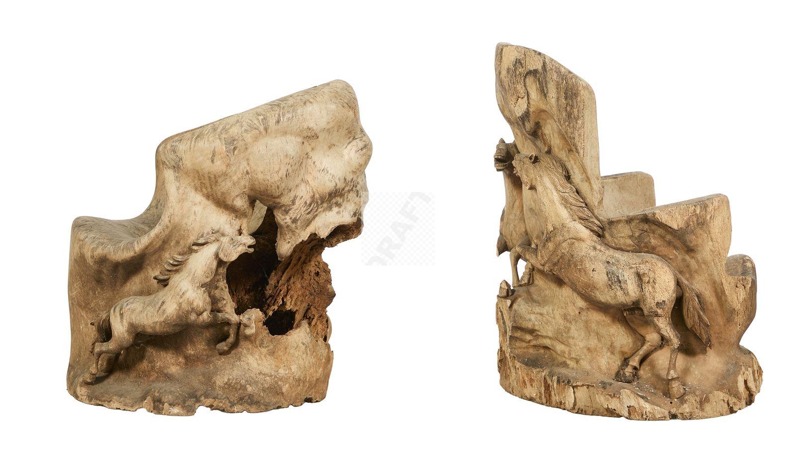 Lot n°253 - 253 Deux fauteuils en bois sculpté à décor en haut relief de chevaux (accidents)