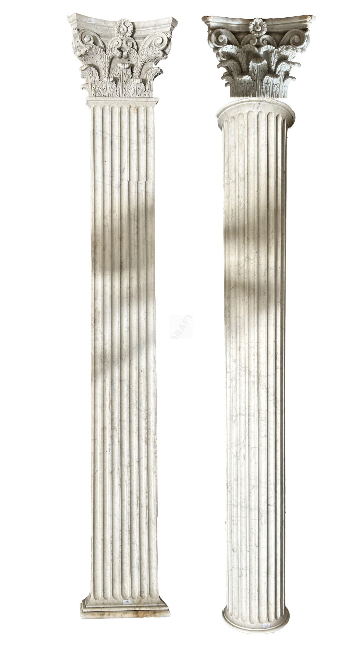 260 Suite de deux colonnes et deux pilastres d’applique à chapiteau corinthien en marbre sculpté, un pilastre cassé en trois morceaux (accidents et manques) H des colonnes 291cm, H des pilastres environ 295 cm