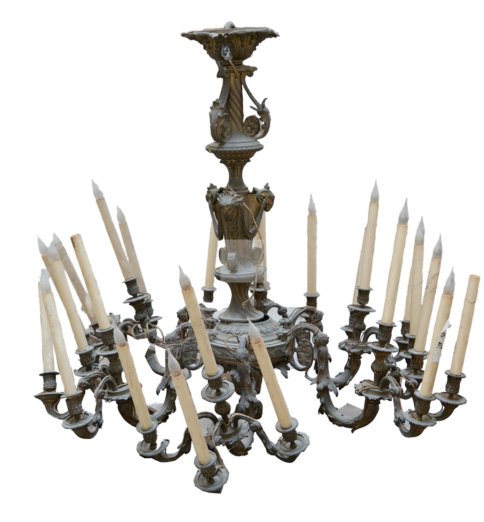 Lot n°277 - 277 Important lustre en bronze ciselé et doré à 24 bras de lumière à décor de tê