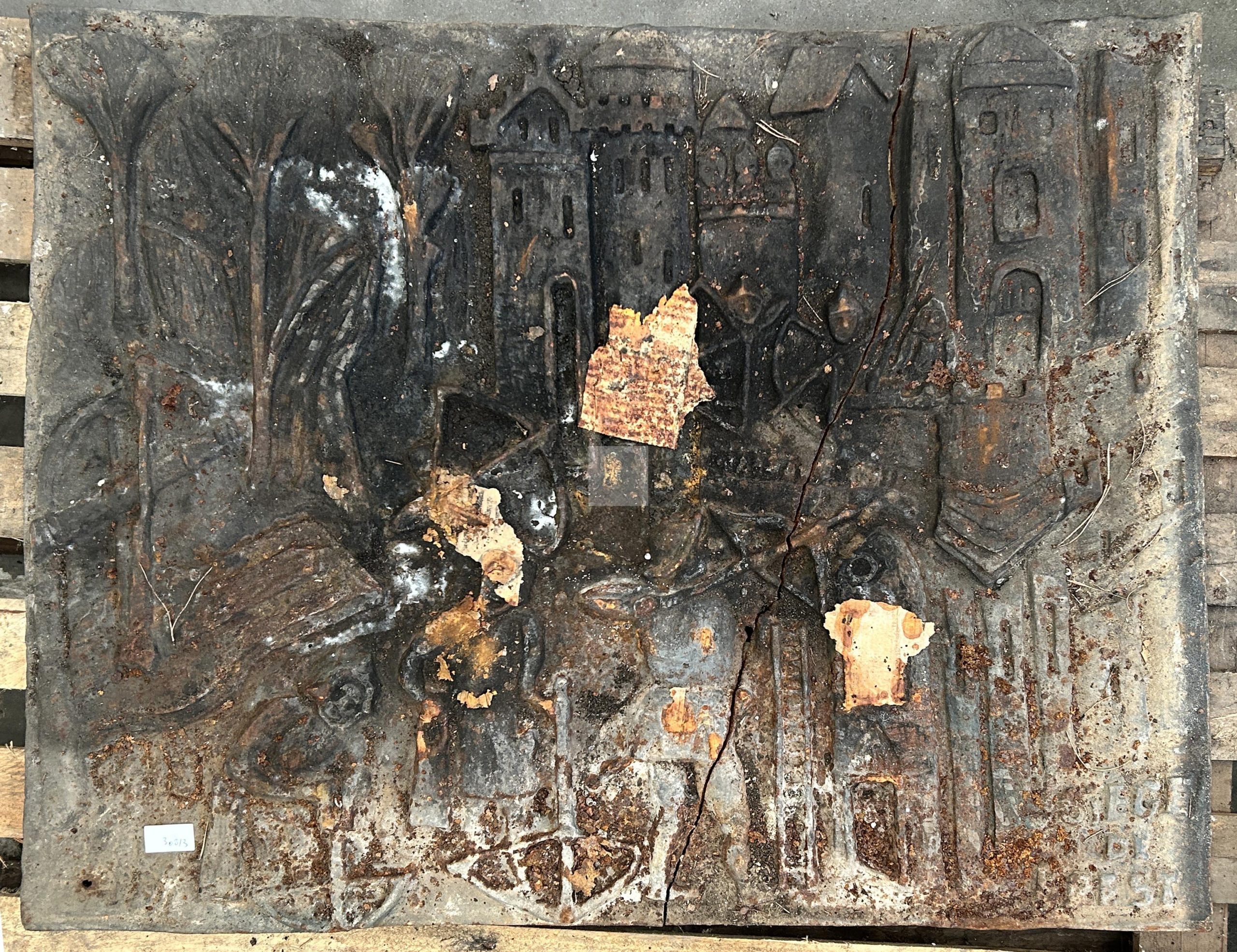 308 Lot de trois plaques de cheminée en fonte de fer, à décor de scènes mythologiques ou scènes d’attaque de château (Possiblement Siège de Brest de 1386), certaines fracturées. Usures (rouille). 80×94, 73.5×93.5 et 87×112.5 cm.