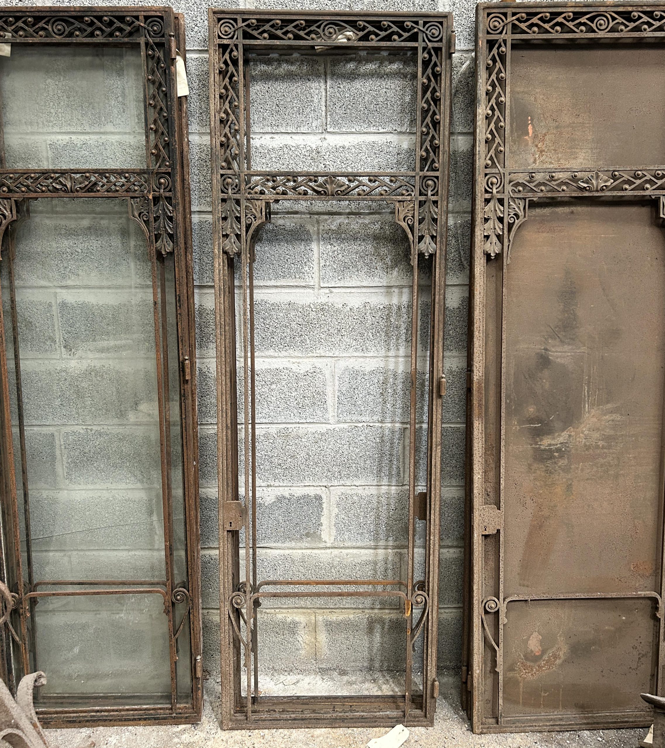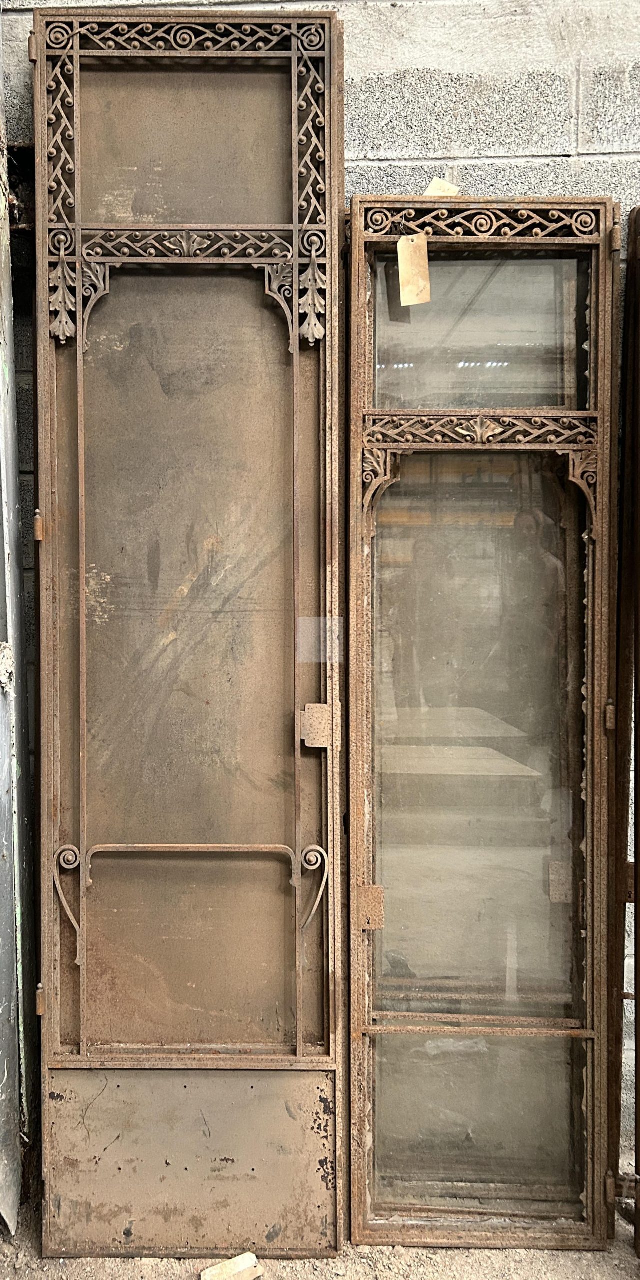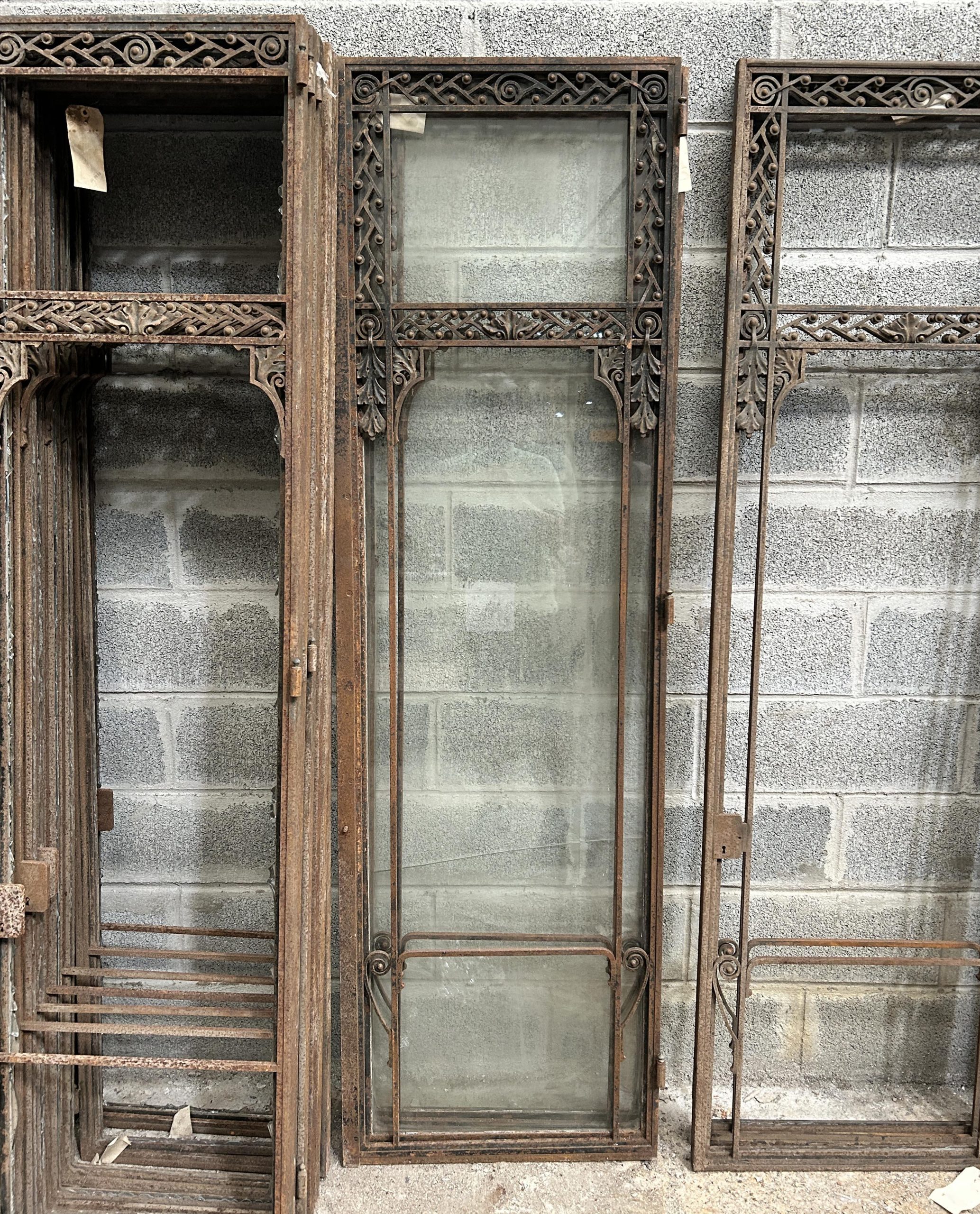 309 Lot comprenant 21 structures de portes en fer forgé anciennement patiné et doré, certaines vitrées, ornées de frises de motifs géométriques stylisés et feuilles d’acanthes, Dimensions : Hauteurs : 191 cm (pour 18 d’entre elles), et 225 cm (pour deux d’entre elles). Largeurs : 47 cm (pour 11 d’entre elles), 57 cm (pour deux d’entre elles), 59.5 cm (pour cinq d’entre elles), 125 cm (pour deux d’entre elles). On joint une partie de grille d’un modèle proche (200×72 cm).