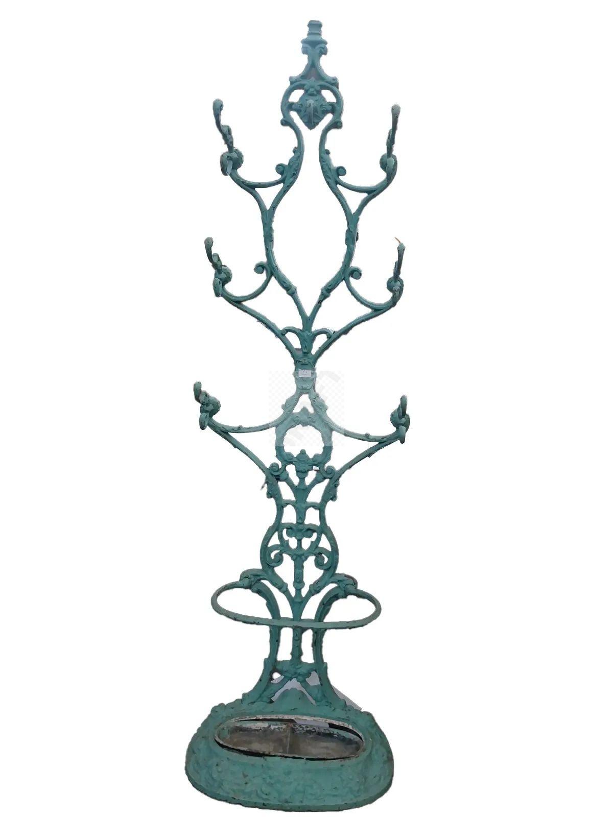 311 Vestiaire en fonte de fer laqué vert formant porte-parapluie à la base. Fin 19e-début 20e, Manque à l’amortissement, 205×62 cm