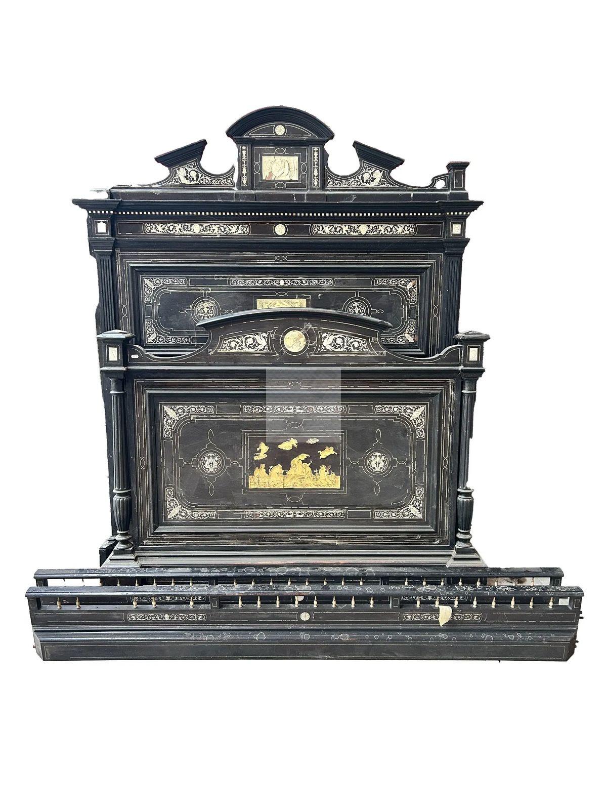 326 Partie de mobilier de chambre à coucher en bois noirci, placage d’ébène marqueté d’os à motifs de rinceaux et allégories dans le goût de la Renaissance, composé d’une armoire à glace biseautée ouvrant à trois vantaux, et un lit 254x203x52 cm (armoire), tête de lit : 195×152 cm. Fin 19e siècle, nombreux accidents et manques