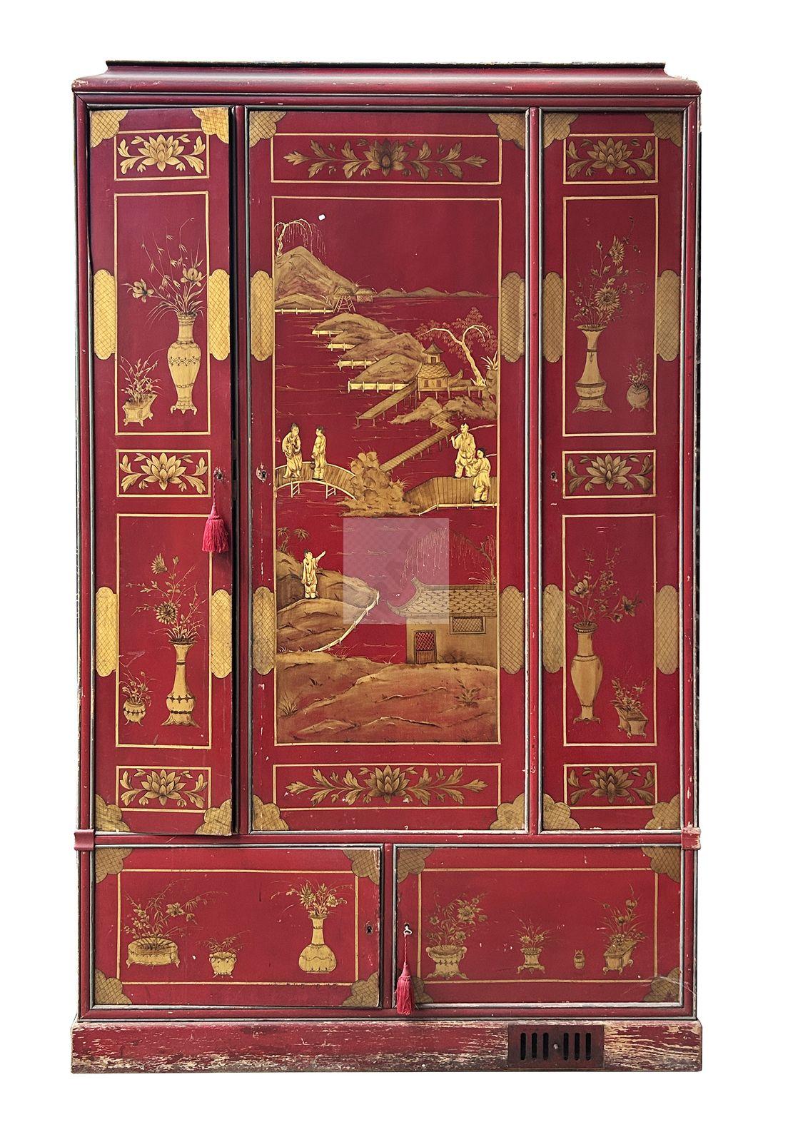 327 Grand cabinet en bois laqué, à décor doré sur fond rouge de motifs végétaux et motifs sans fond d’objets décoratifs et paysage à la pagode. Ouvre par trois vantaux en partie haute et deux en partie basse. Accidents et éclats, 244x145x36 cm