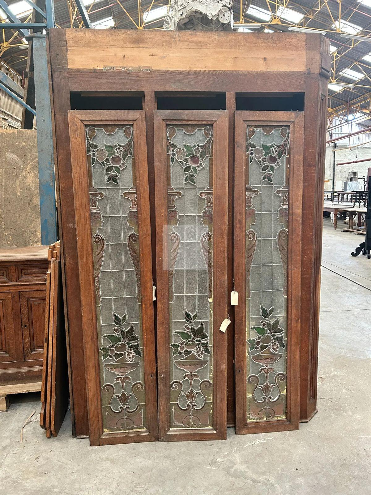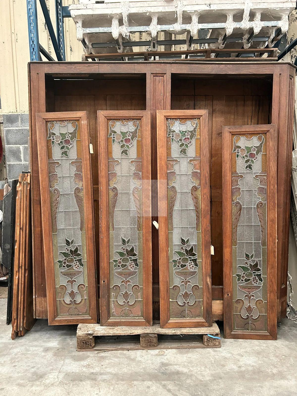 Suite d’éléments formant meuble deux corps en chêne mouluré, sculpté, teinté, ouvre en partie basse par des tiroirs en ceinture et vantaux, en partie haute par des vantaux vitrés. Les vitraux (démontés) à décor architecturés de cariatides dans un entourage de fleurs épanouies et feuillages. Première moitié du 20e siècle. Accidents, manques, modules présentés démontés.