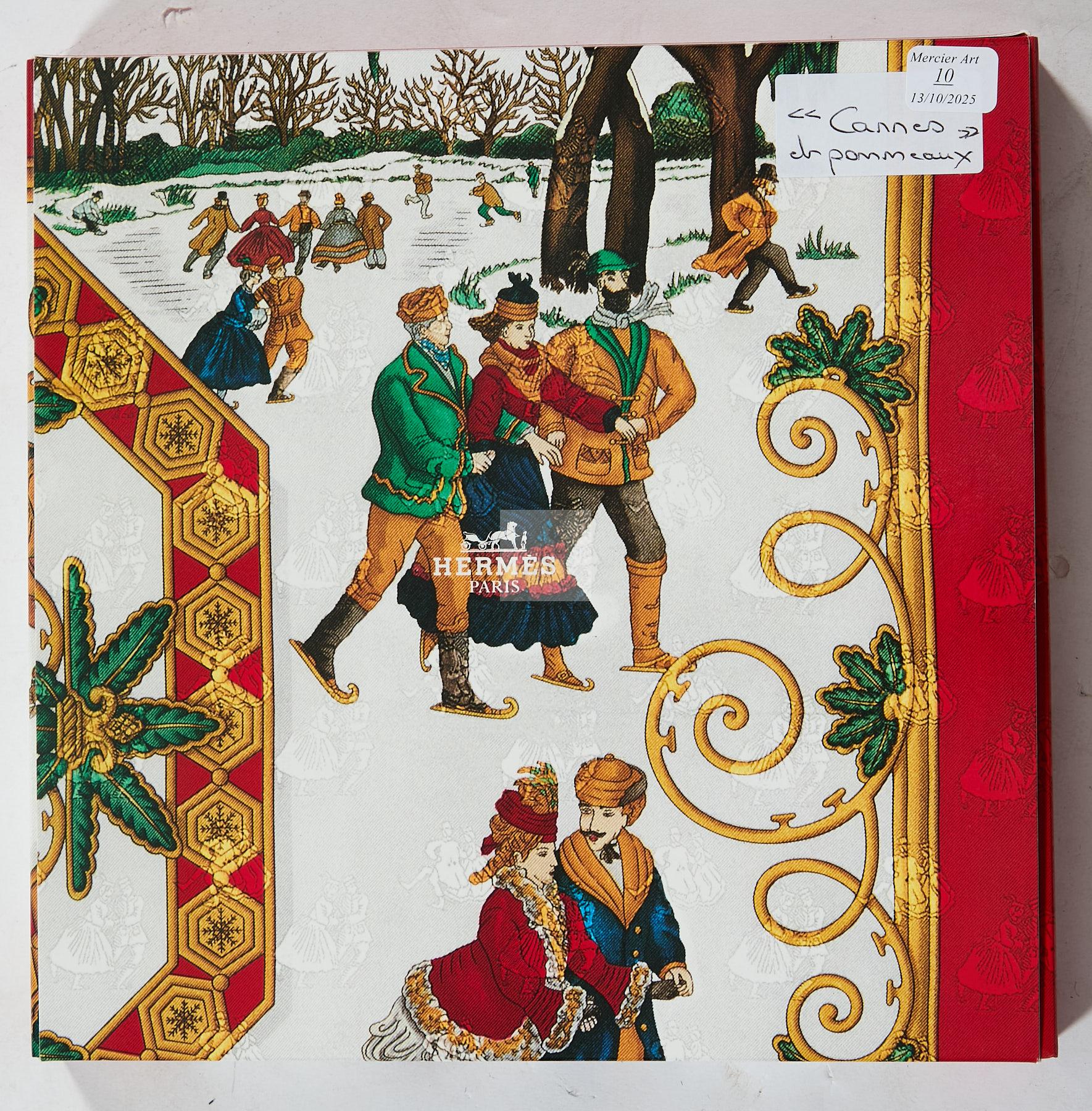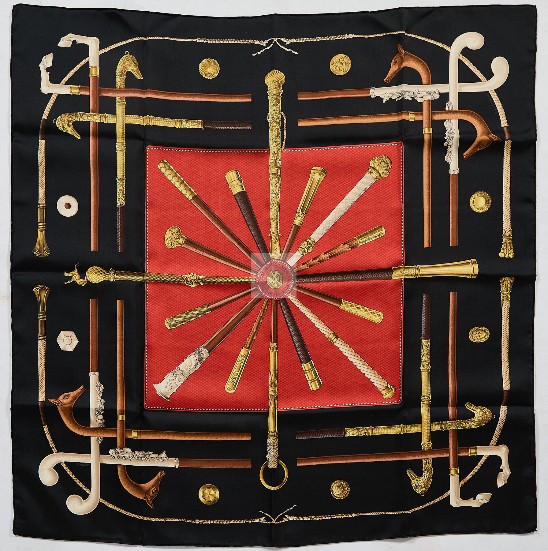 Lot n°10 - 10 HERMES, Paris, "Cannes et pommeaux", Carré de soie 90x90 cm Dans
