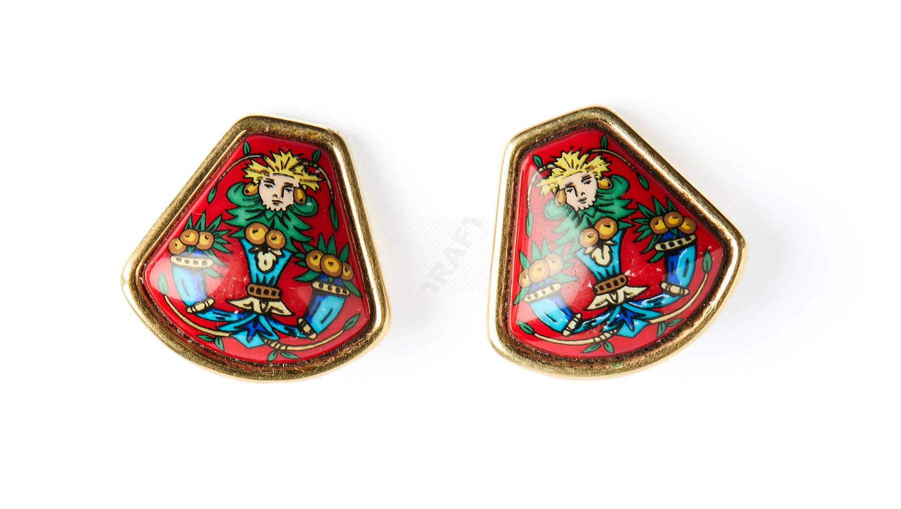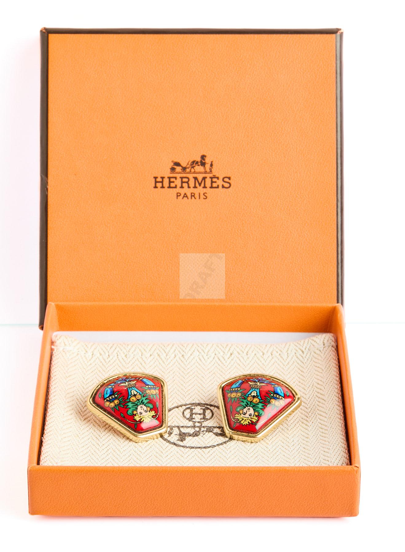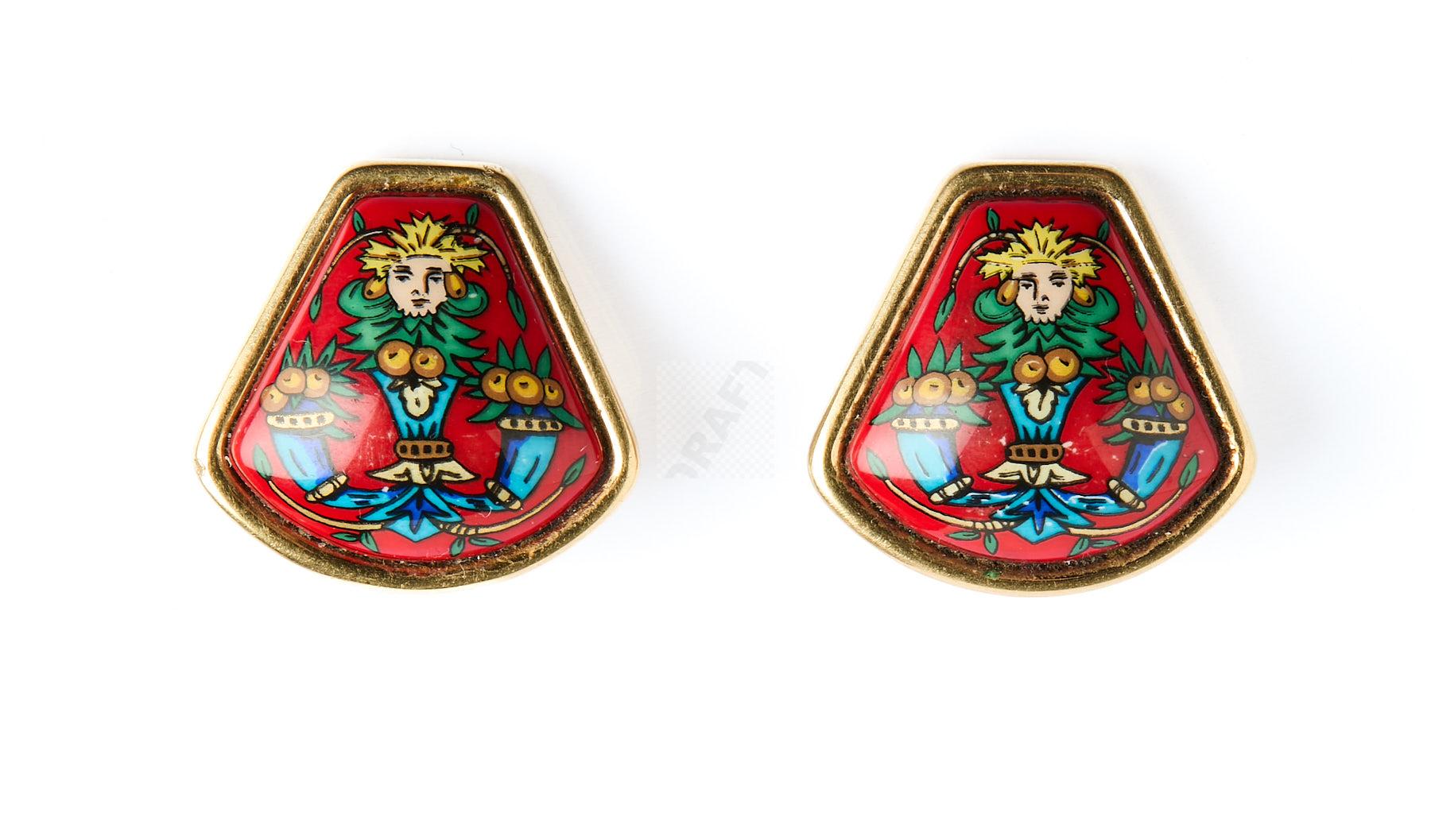 45 HERMES : Paire de clips d’oreilles à décor de faunes et cornes d’abondance , avec boite d’origine et pochette de voyage