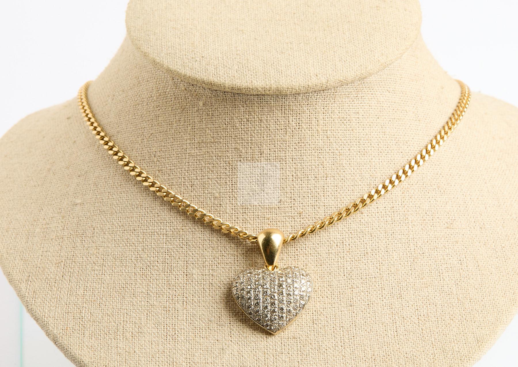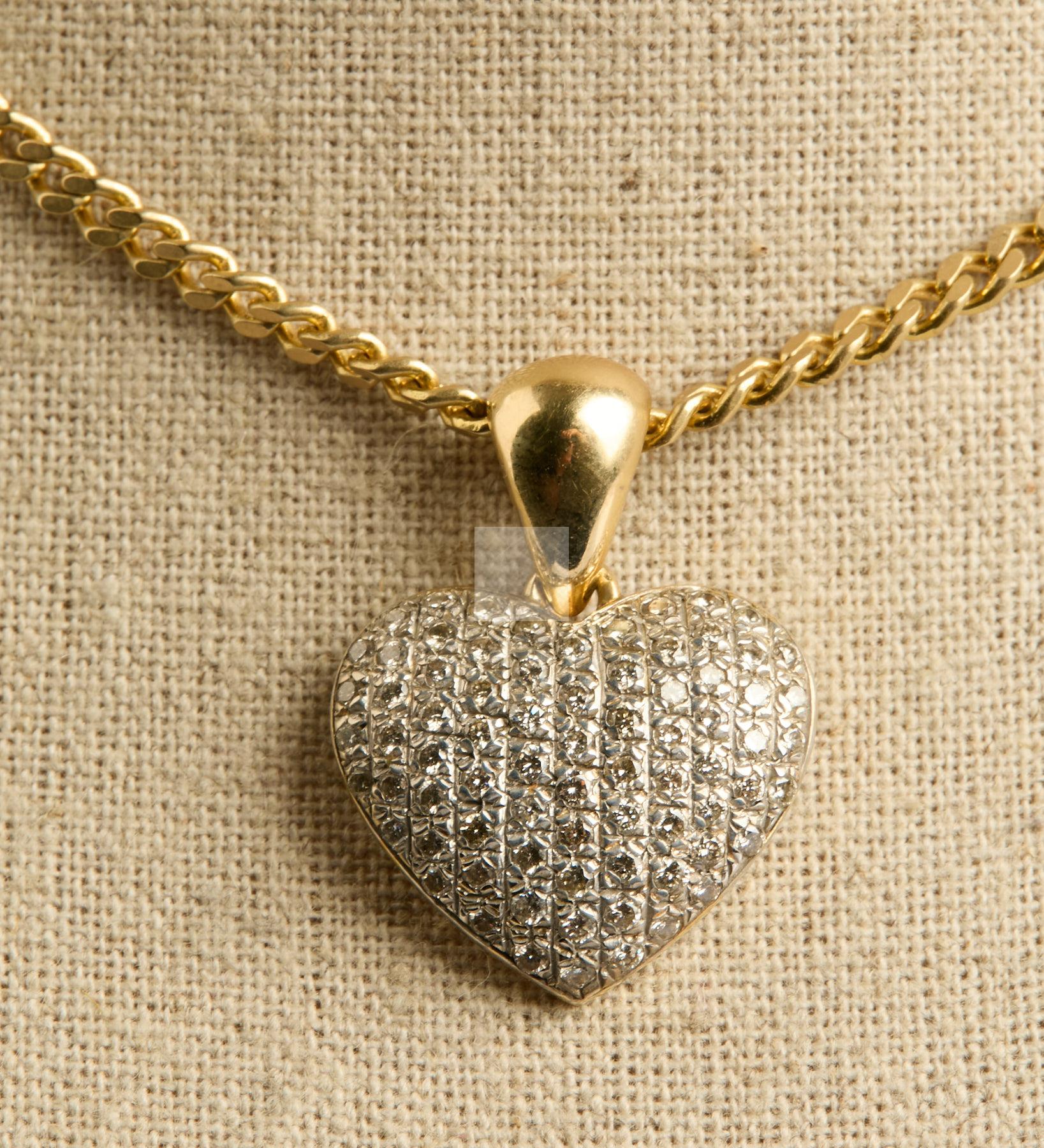 55 Collier en or jaune 750 ‰ à maille gourmette de 51 cm et son pendentif cœur en or jaune 750 ‰ pavé de diamants, poids 31,47 g