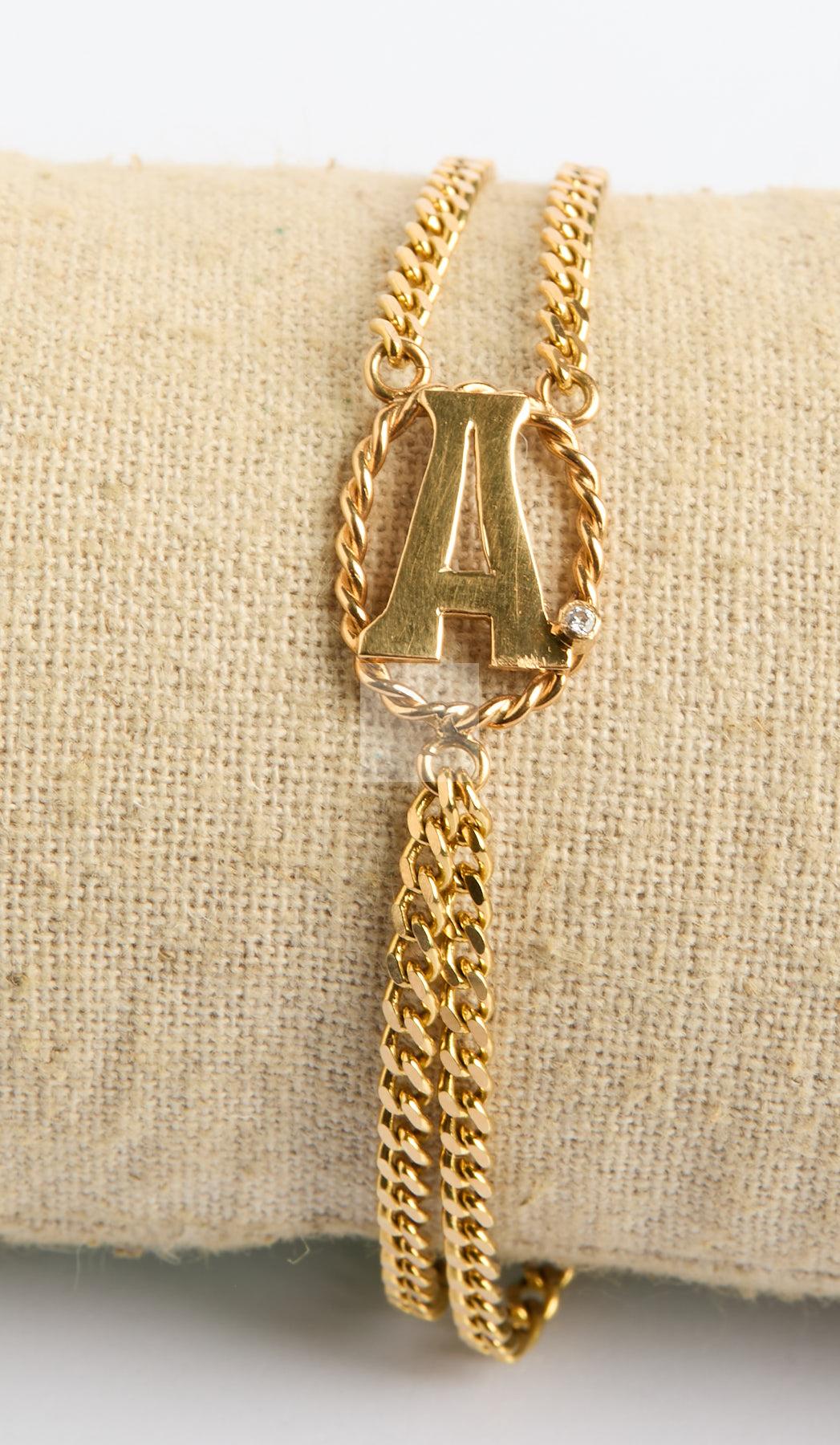72 Bracelet en or jaune 750 ‰ et pendentif A en or jaune et pierre blanche, chainette pampille, poids 10,65 g