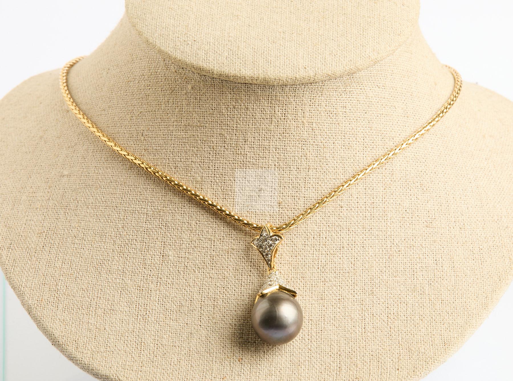 92 Pendentif en or jaune 750 ‰ et diamants orné d’une perle de culture de Tahiti de 14,8 mm, poids brut 9,54 g, on y joint une chaine de cou de 41,5 cm en or jaune 750 ‰ poids 5,7 g et un bracelet maille jaseron en or jaune 375 ‰, poids 2,12 g
