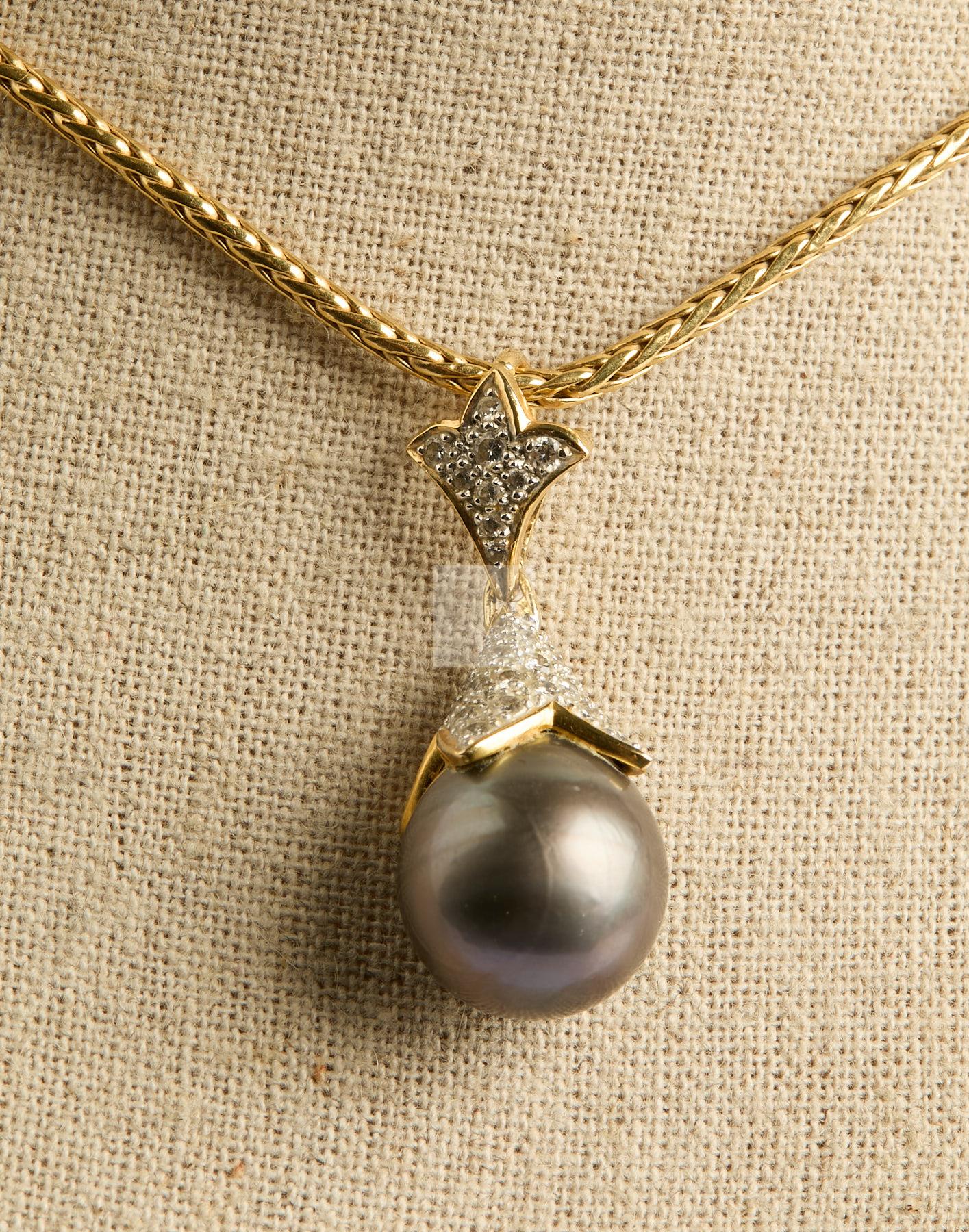 Lot n°92 - 92 Pendentif en or jaune 750 ‰ et diamants orné d’une perle de culture de Tahiti