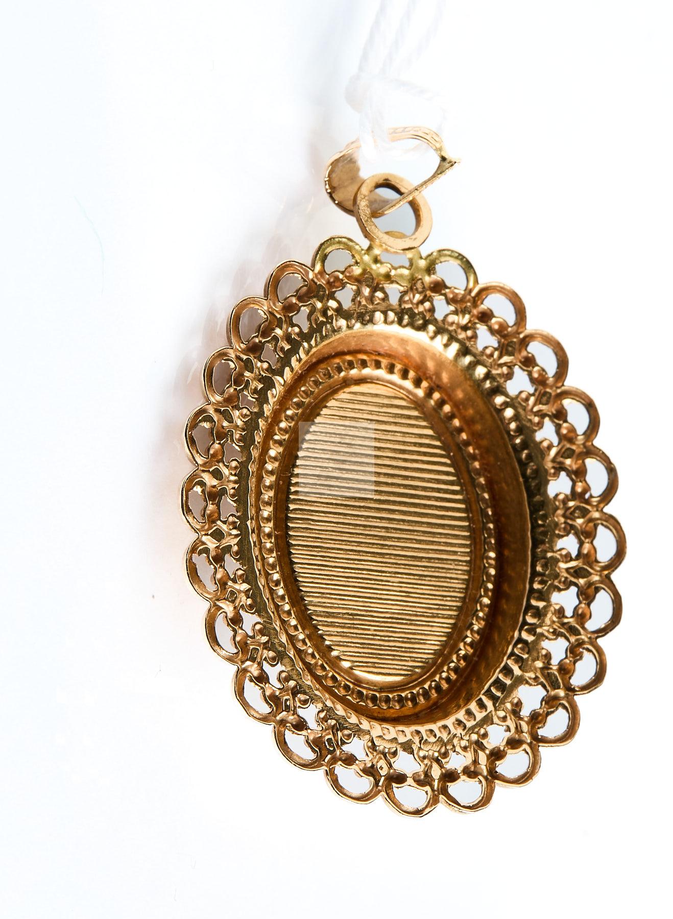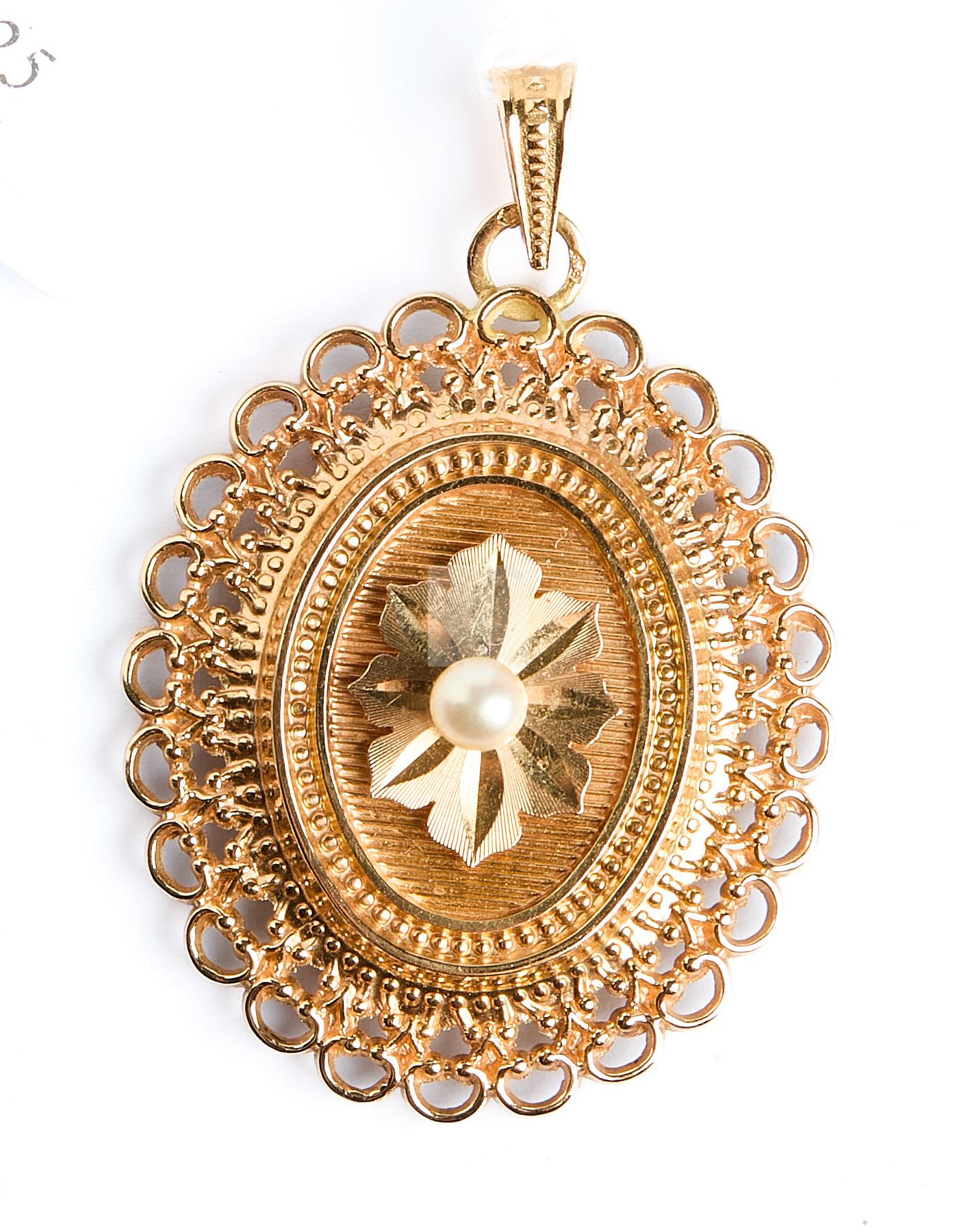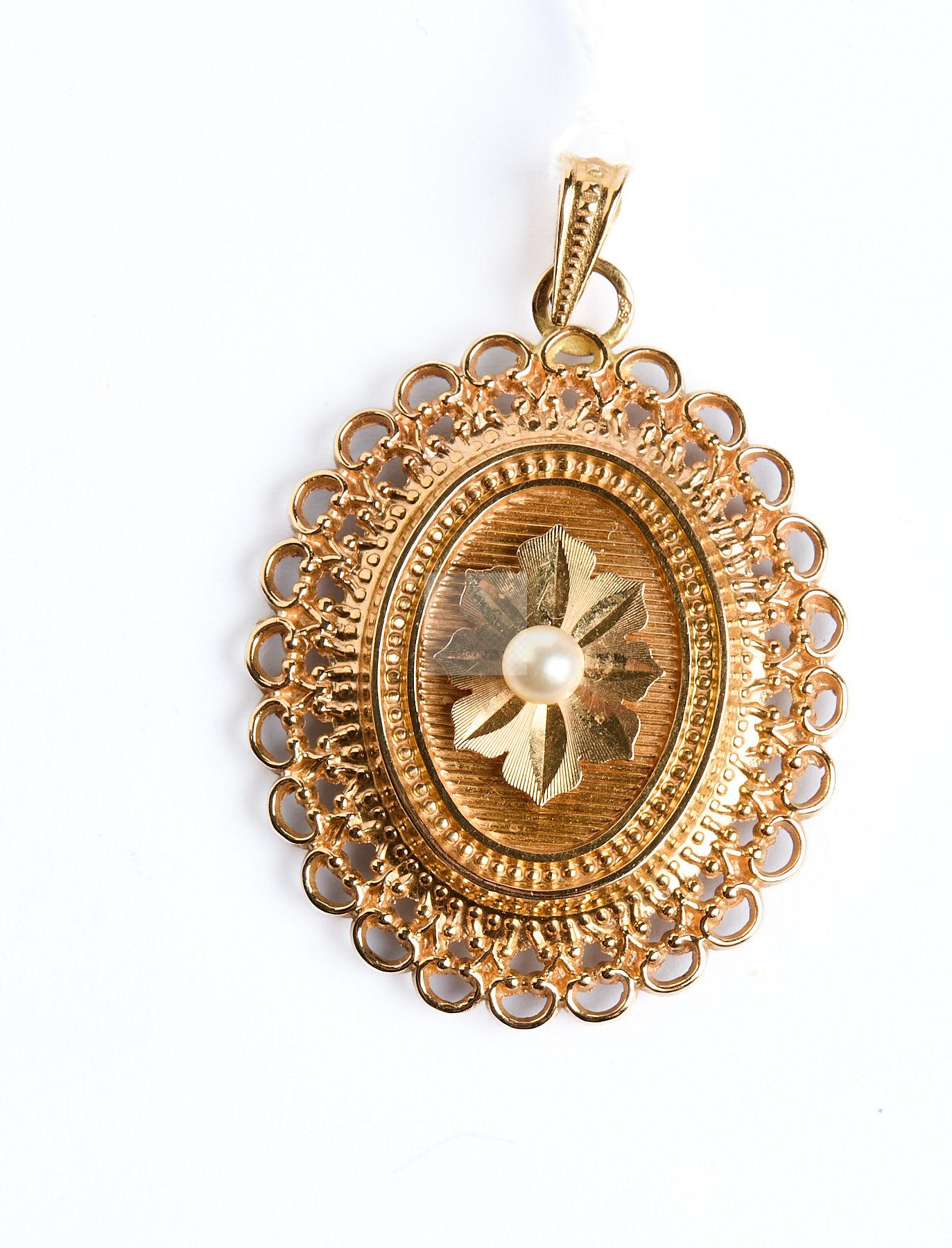 138 Pendentif ovale à bordure dentelée, or jaune 750 ‰ et petite perle de culture de 4 mm, poids 4,9 g