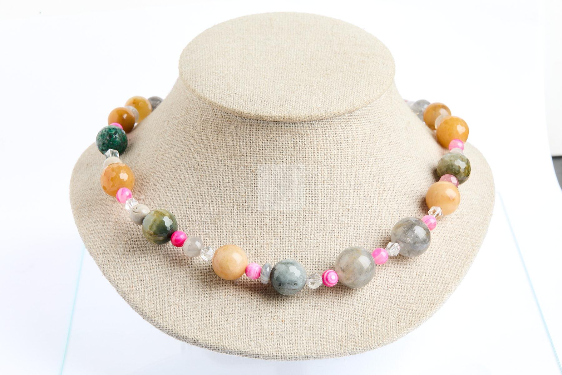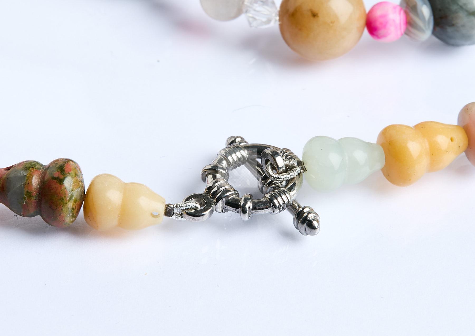 151 Collier de boules de pierre dures telles qu’agates, quartz rose, quartz fumé, nacre, jadéite et cristal, longueur 44 cm,