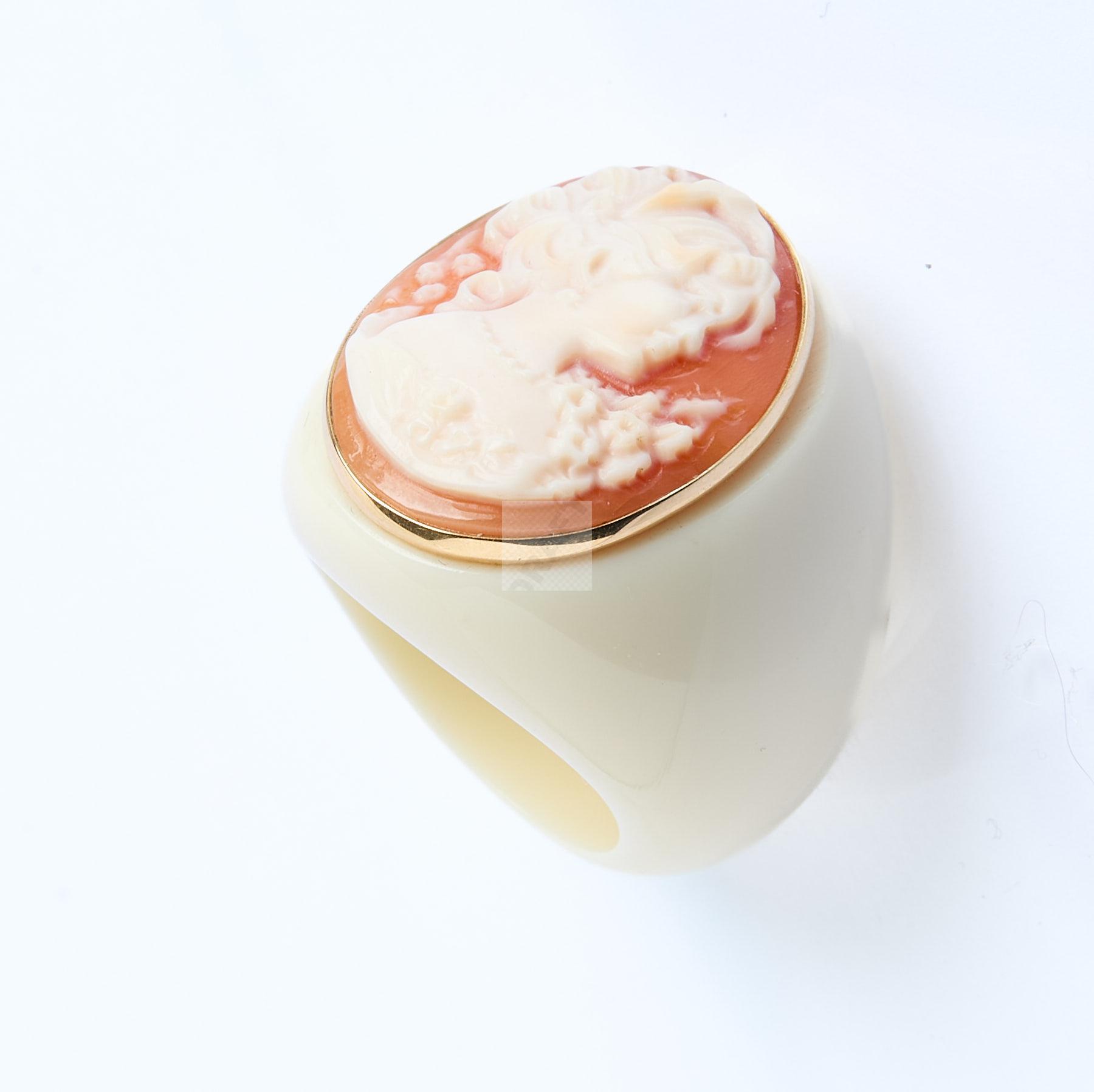 163 Bague en bakélite couleur ivoire ornée d’un camée coquille représentant une femme de profil, tour de doigt 58
