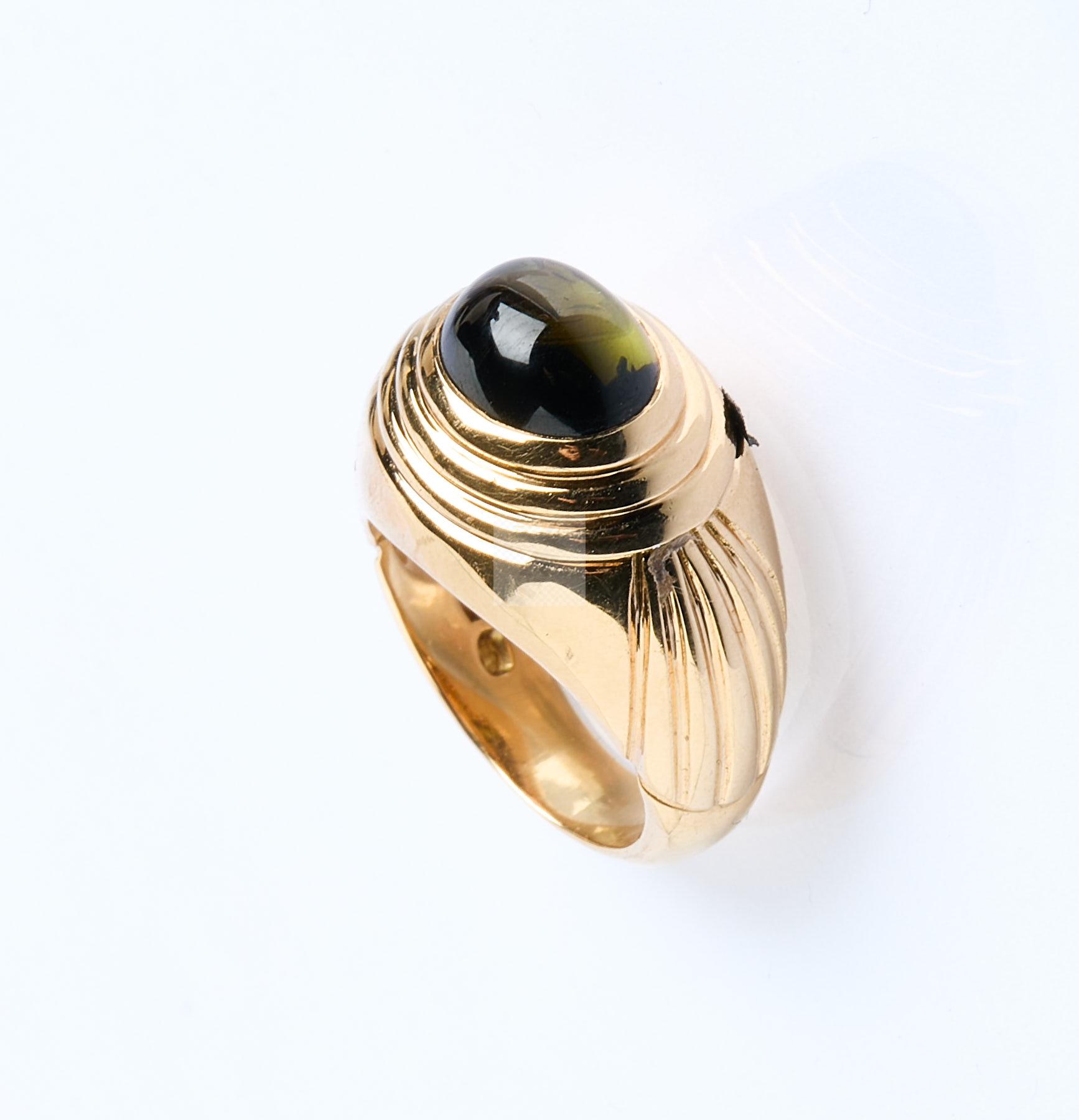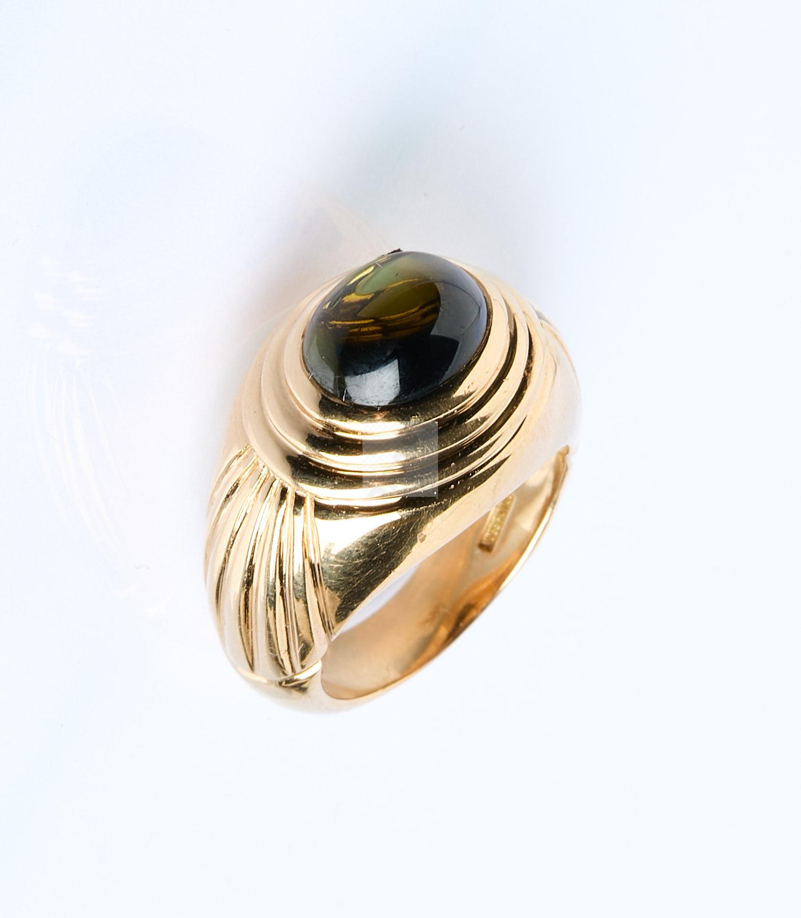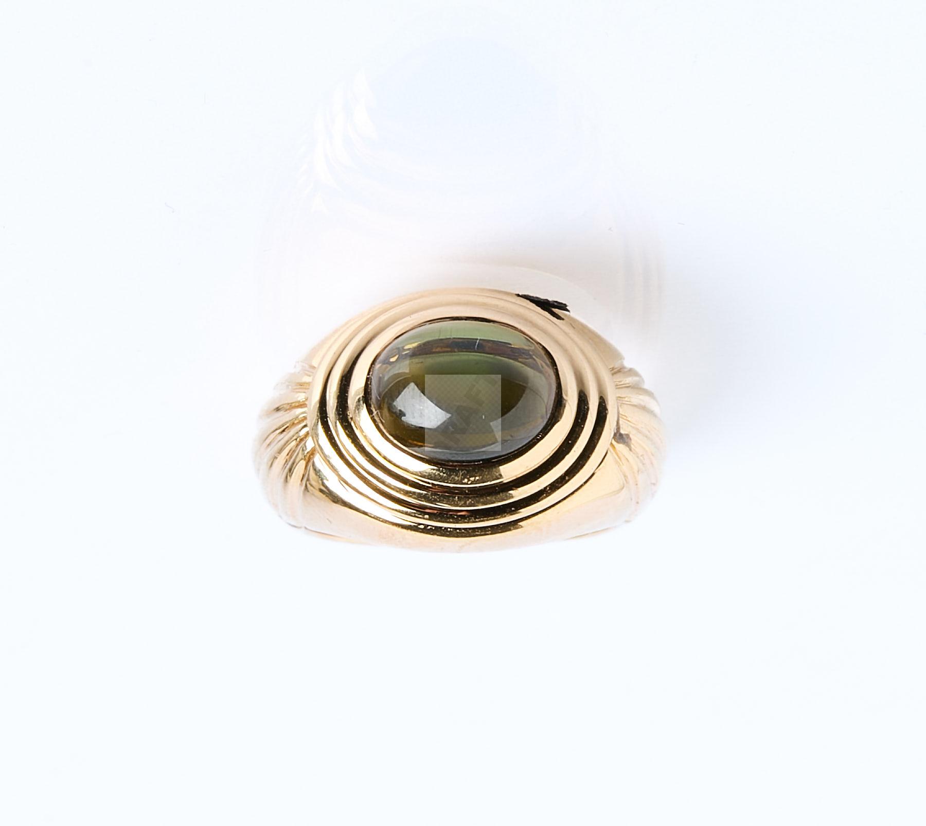 Lot n°171 - 171 BOUCHERON : Bague en or jaune sertie d’une pierre fine (Péridot) en cabochon