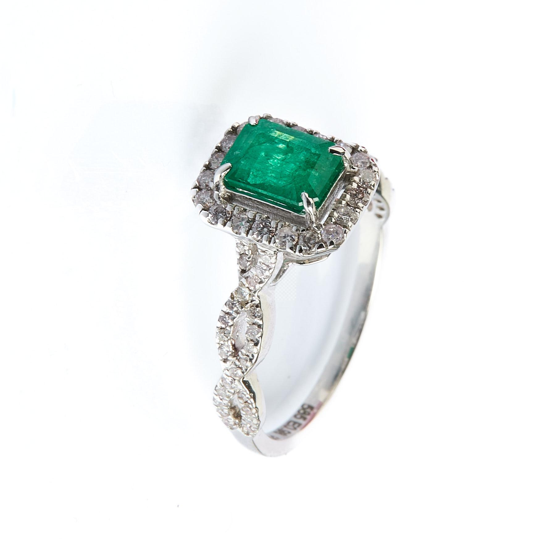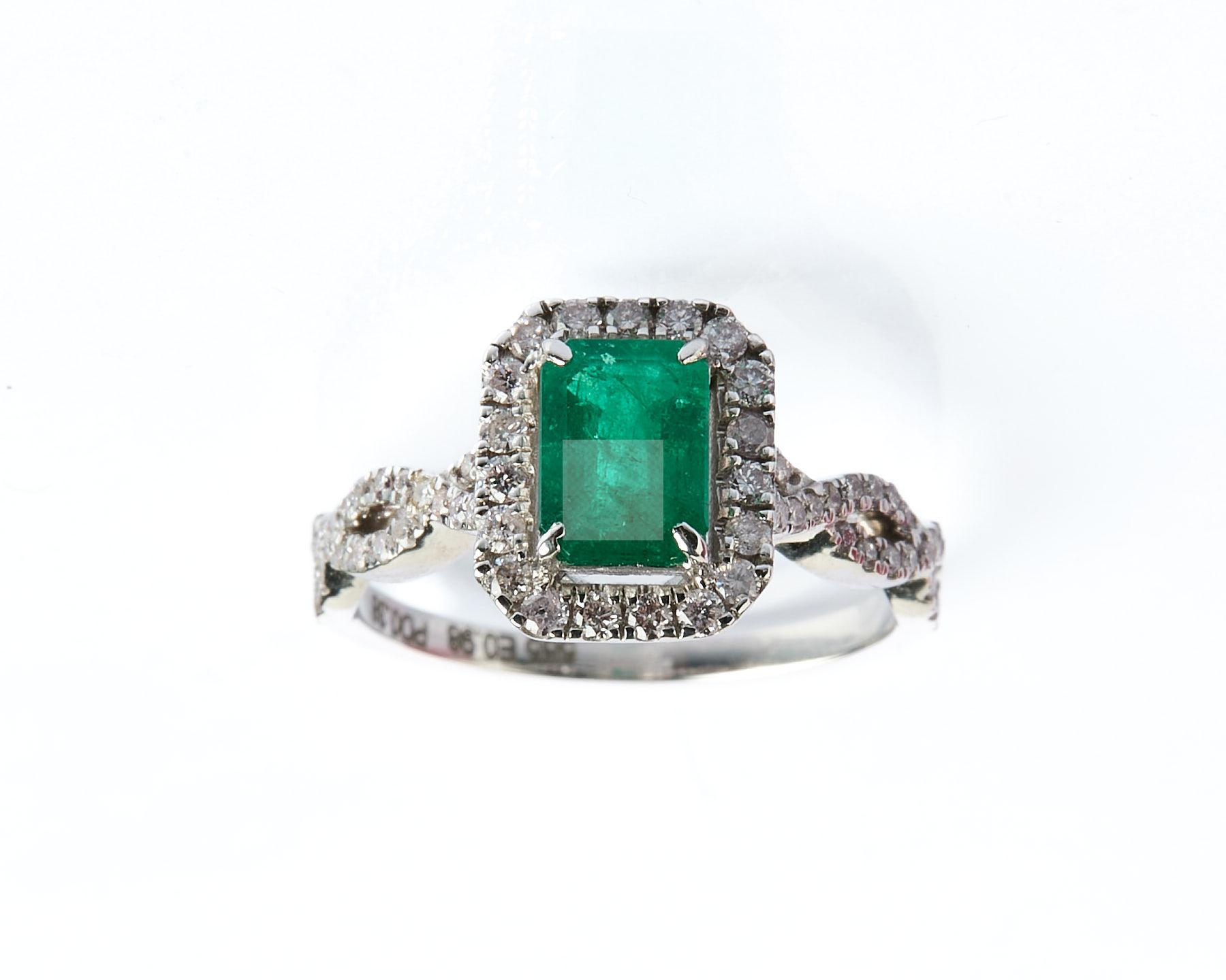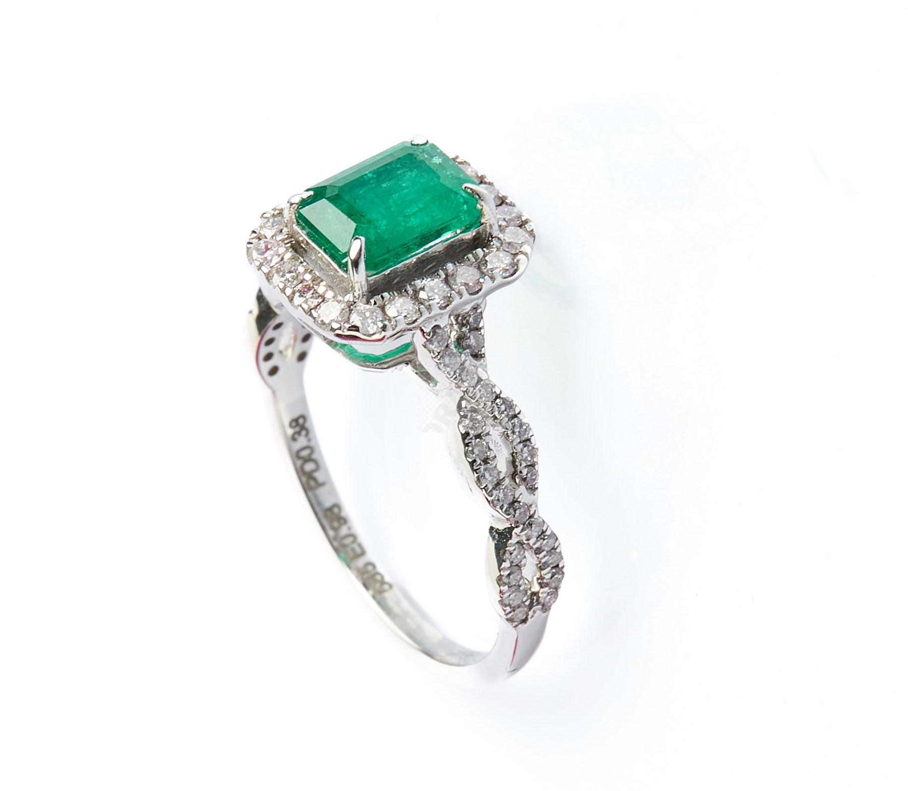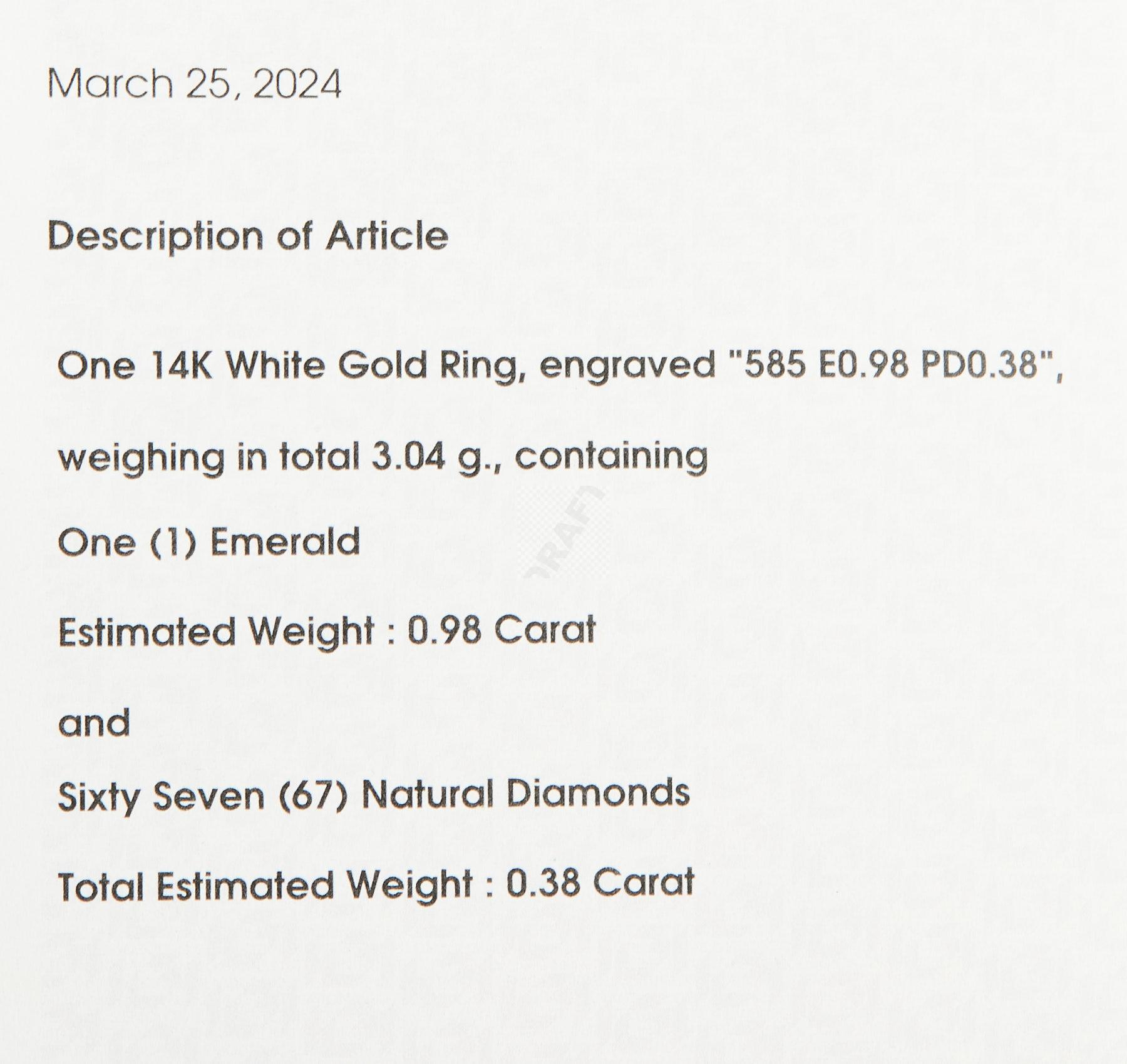 183 Bague en or gris 585 ‰ sertie d’une émeraude de taille émeraude, d’un poids estimé à 0,98 ct entouré et souligné de lignes de petits diamants (0,38 ct), accompagné de son certificat IGI, tour de doigt 53, poids 3,05 g