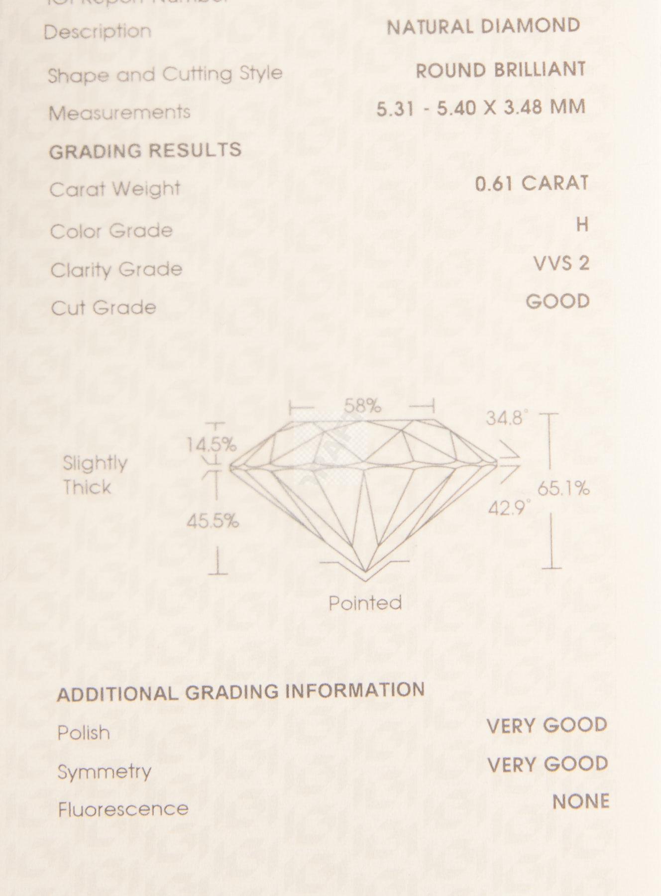 195 Diamant sous scellé d’un poids de 0,61 ct H VVS2, avec son rapport d’analyse du IGI.