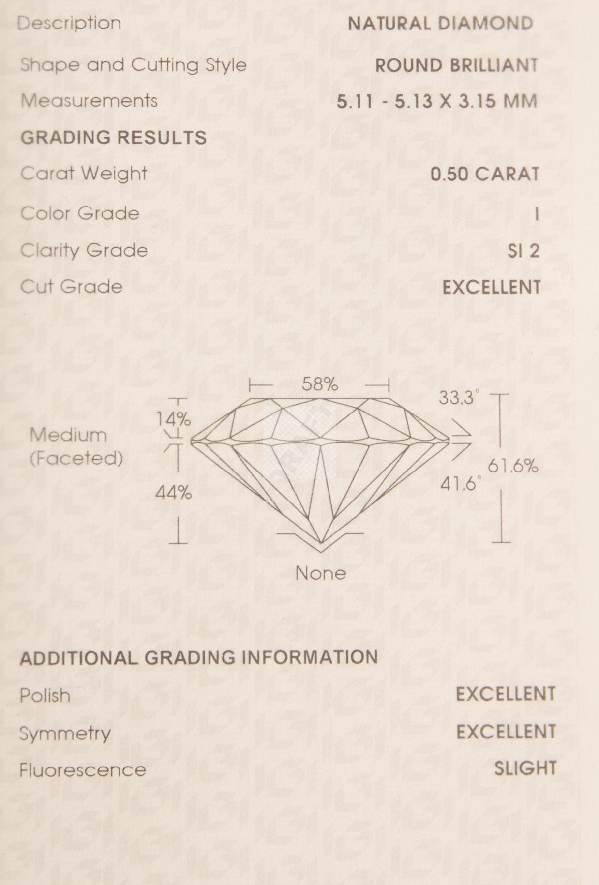 199 Diamant sous scellé d’un poids de 0,50 ct I SI2 , avec son rapport d’analyse du IGI.