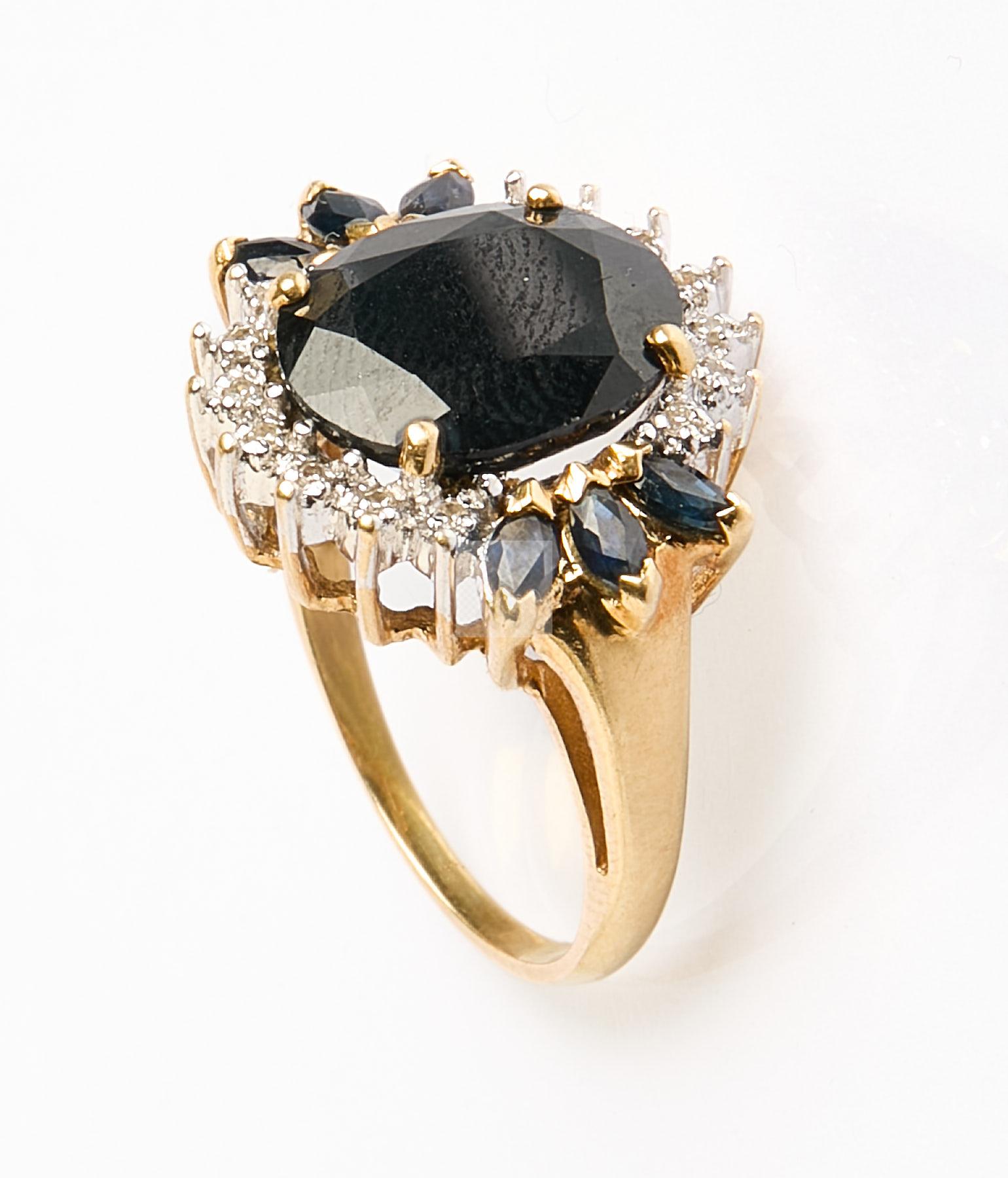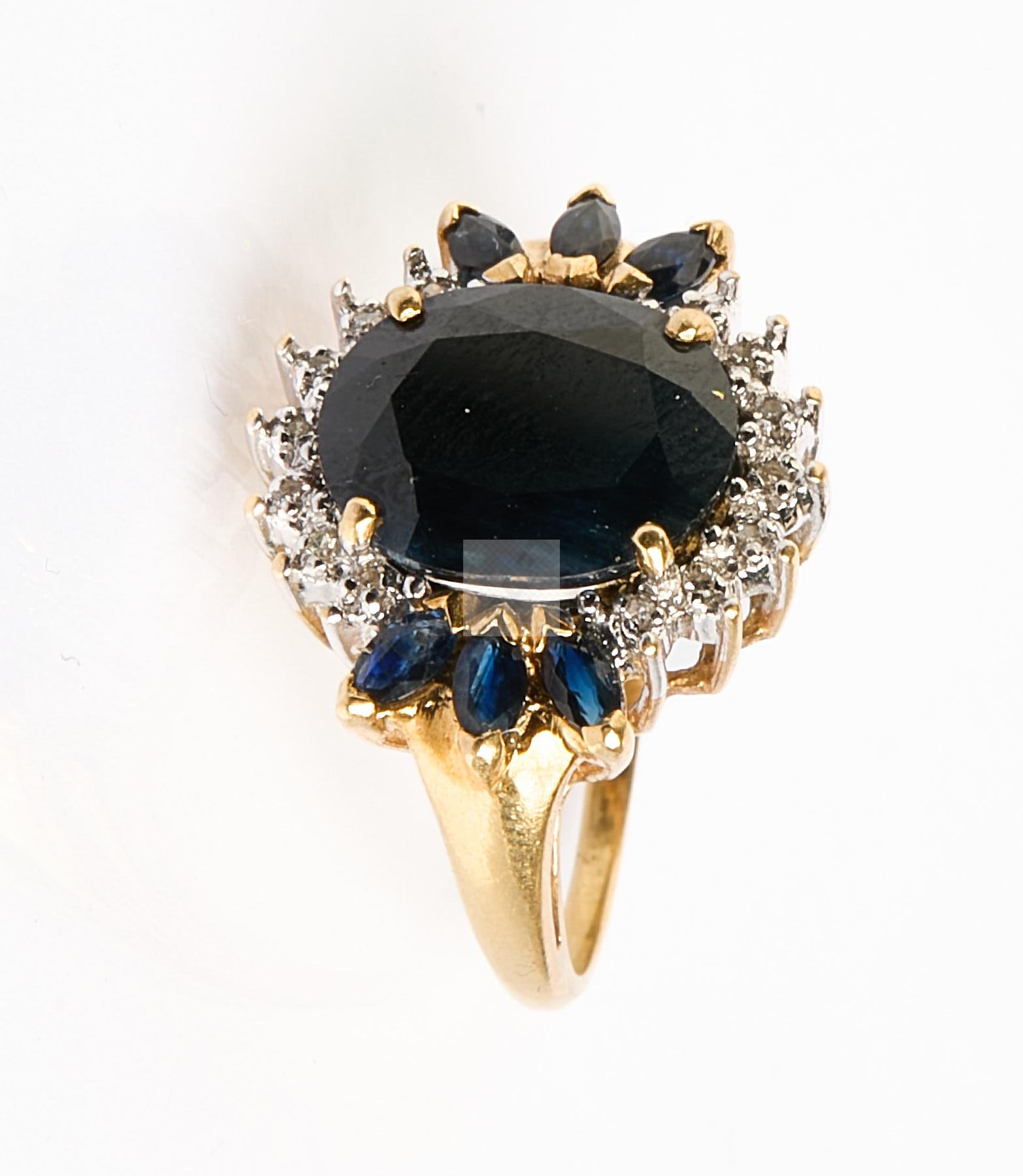 218 Bague en or jaune 750 ‰ ornée d’un saphir australien de 3 ct environ entouré de petits diamants et navettes de saphir, tour de doigt 53, poids 6,7 g