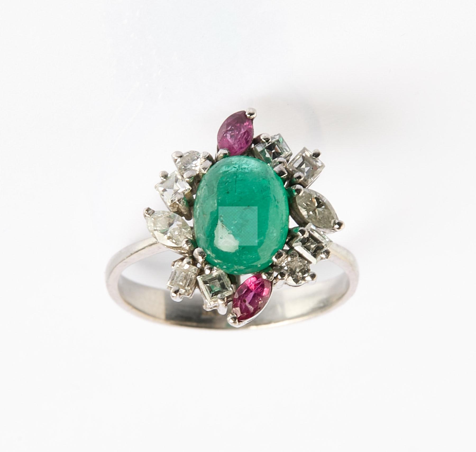 Lot n°219 - 219 Bague fleur en platine, un cabochon d’émeraude en cœur entouré de diamants c