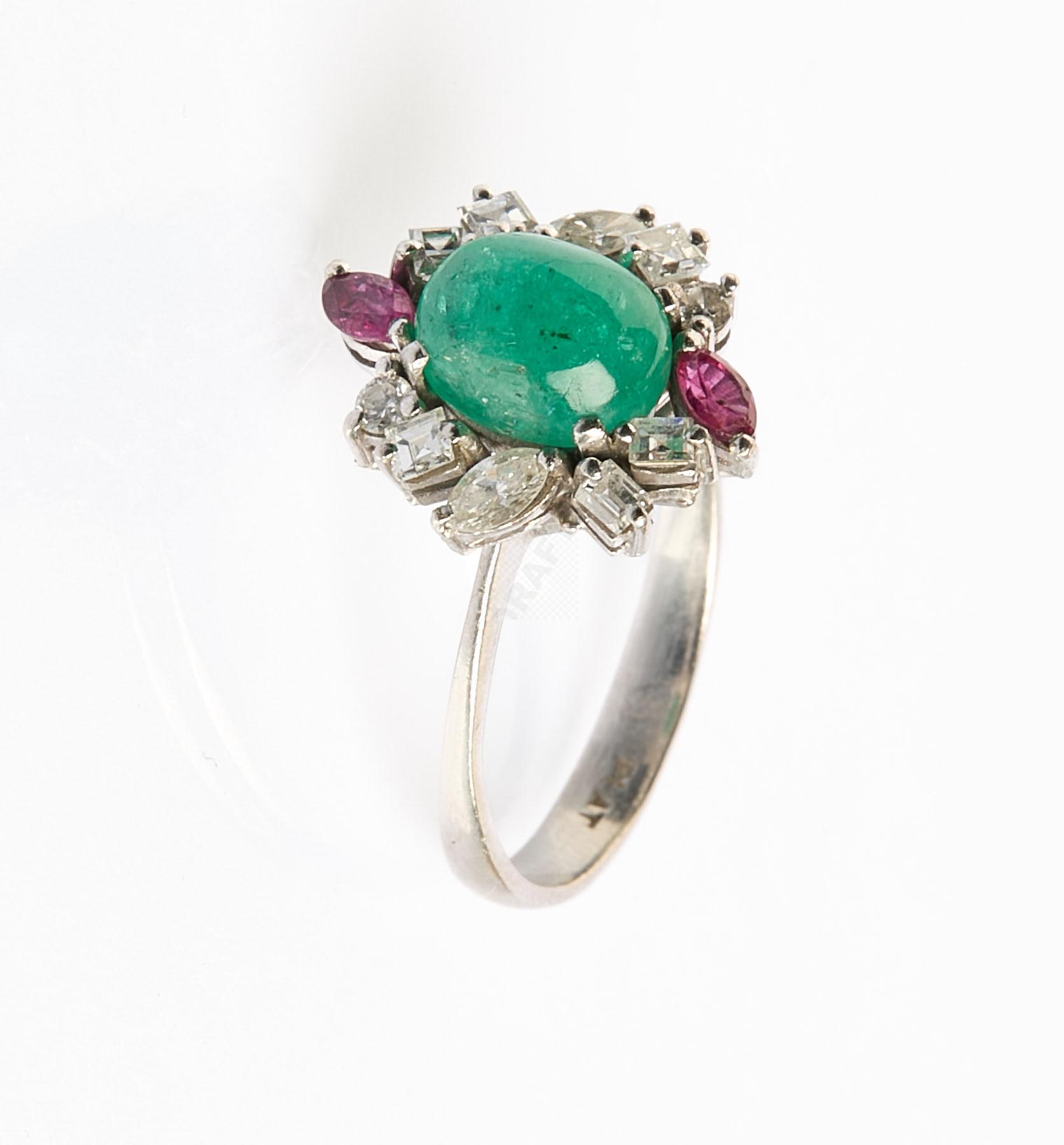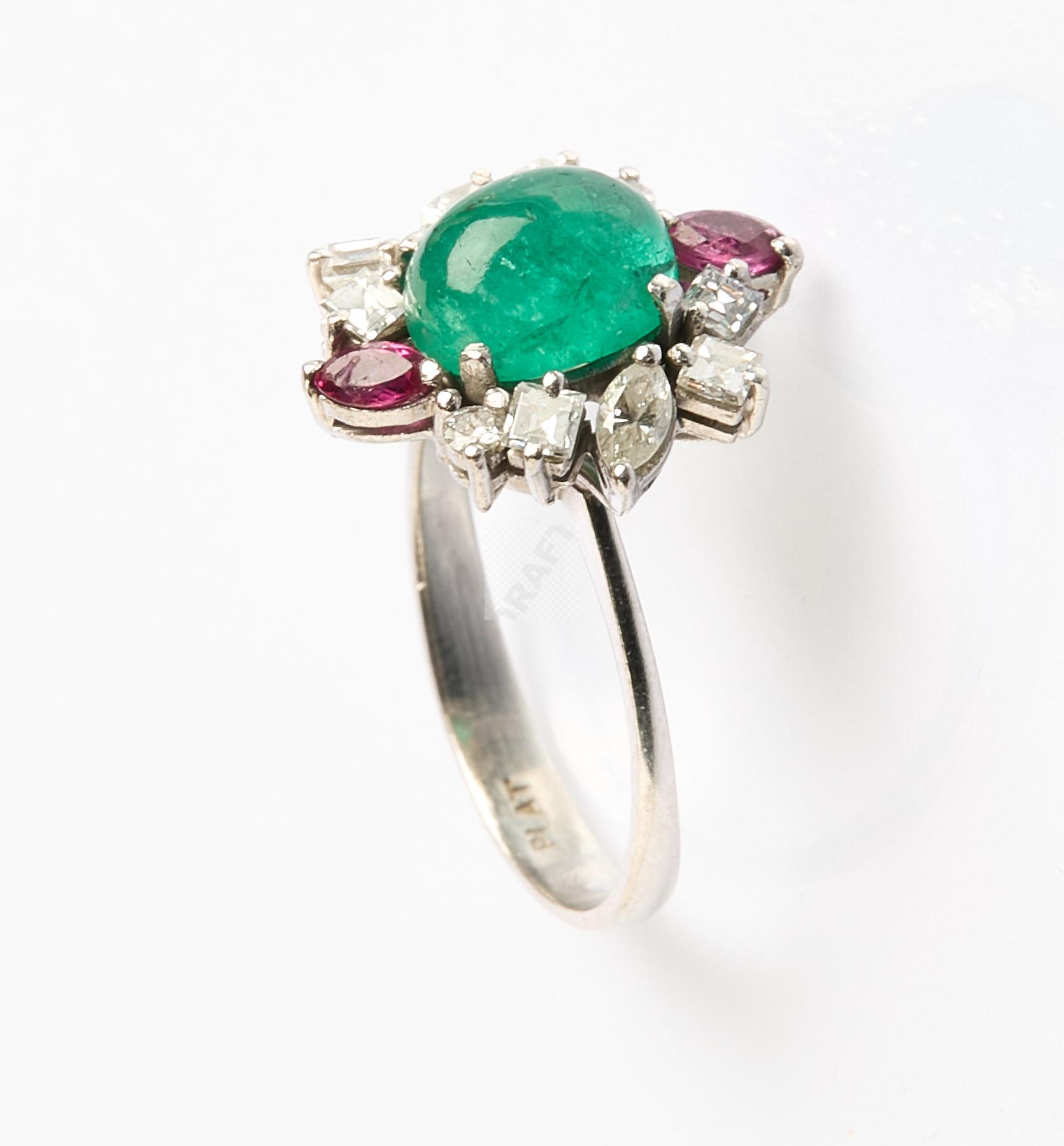 219 Bague fleur en platine, un cabochon d’émeraude en cœur entouré de diamants carrés, ronds, navettes et deux petites navettes de rubis, tour de doigt 55, poids 5 g