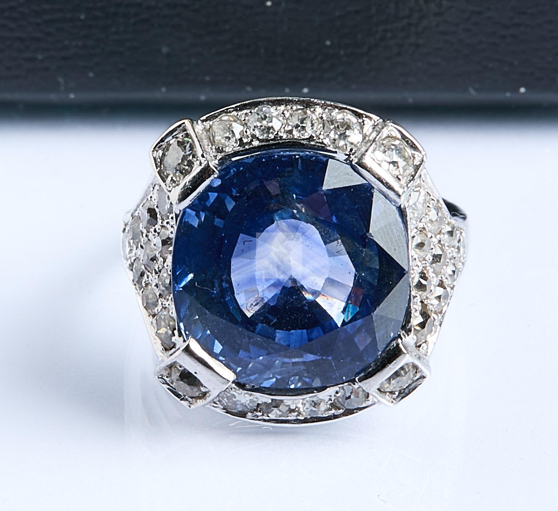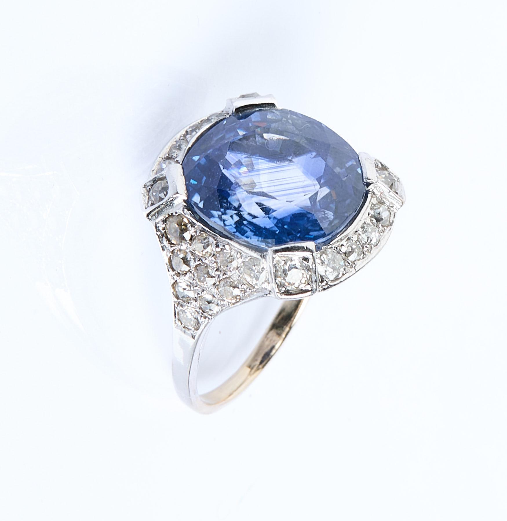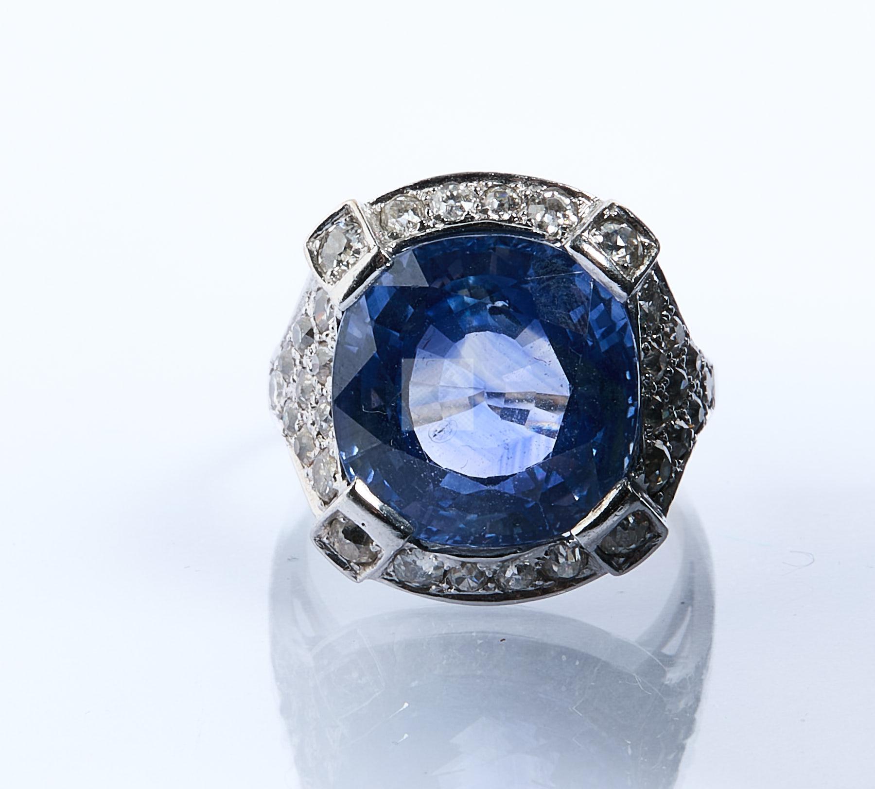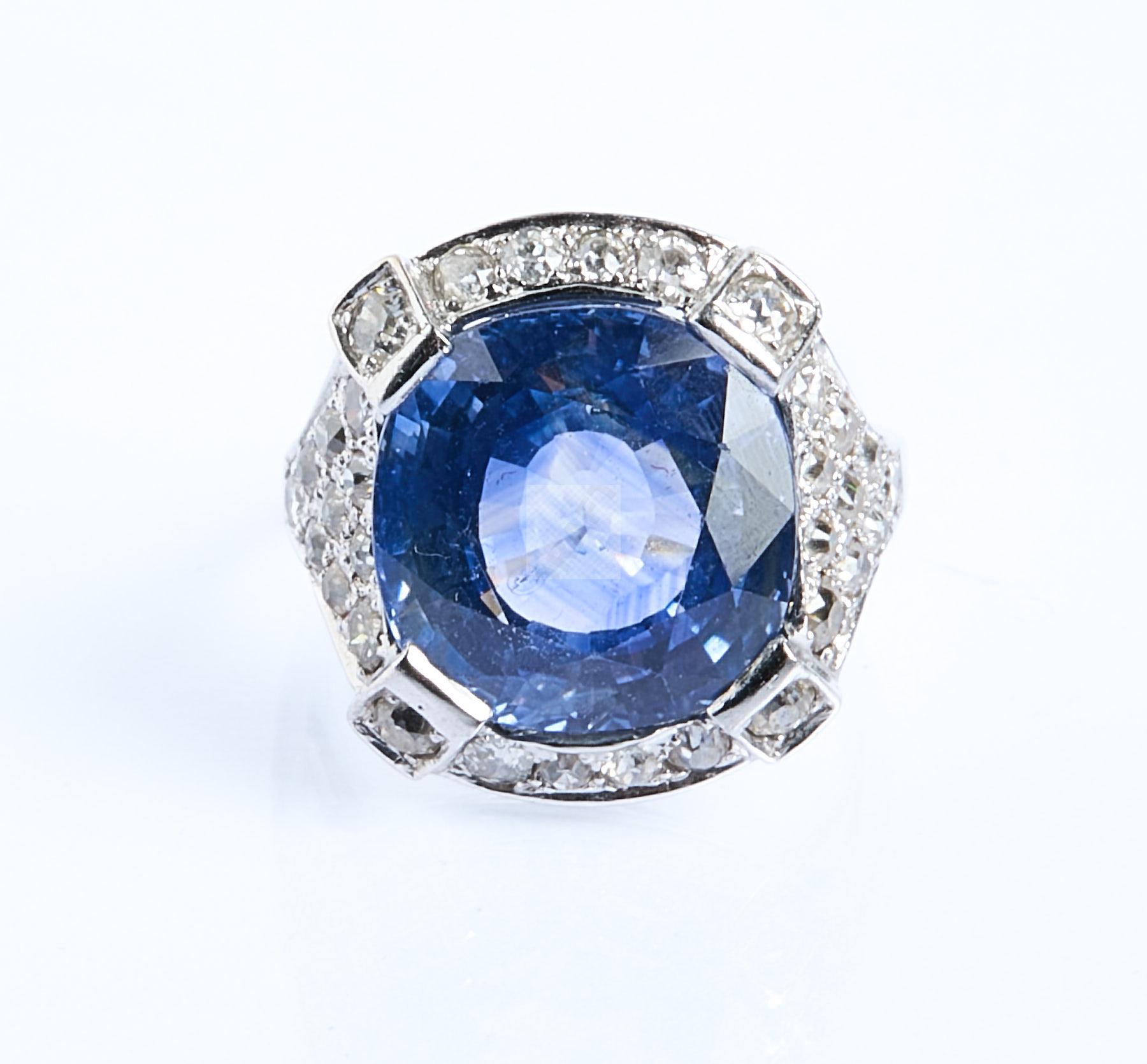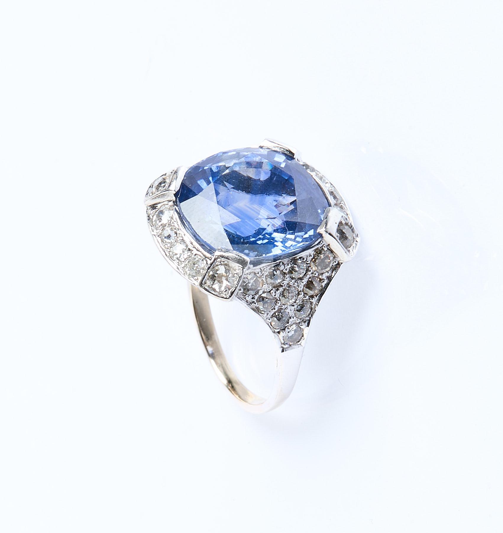 256 Bague en or gris ornée d’un important saphir de Ceylan d’un poids estimé à 15,50 carats sur un pavage de diamants de taille ancienne.