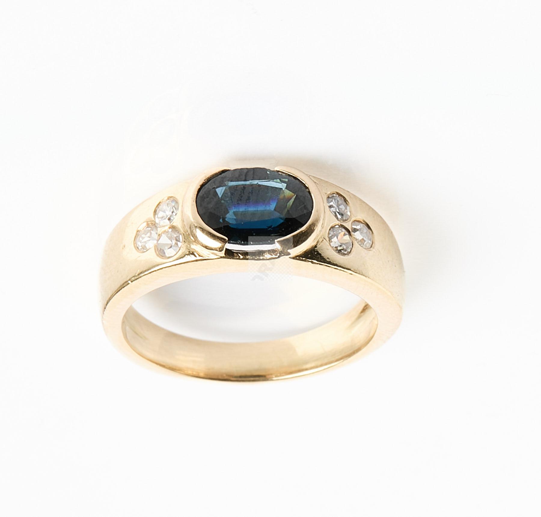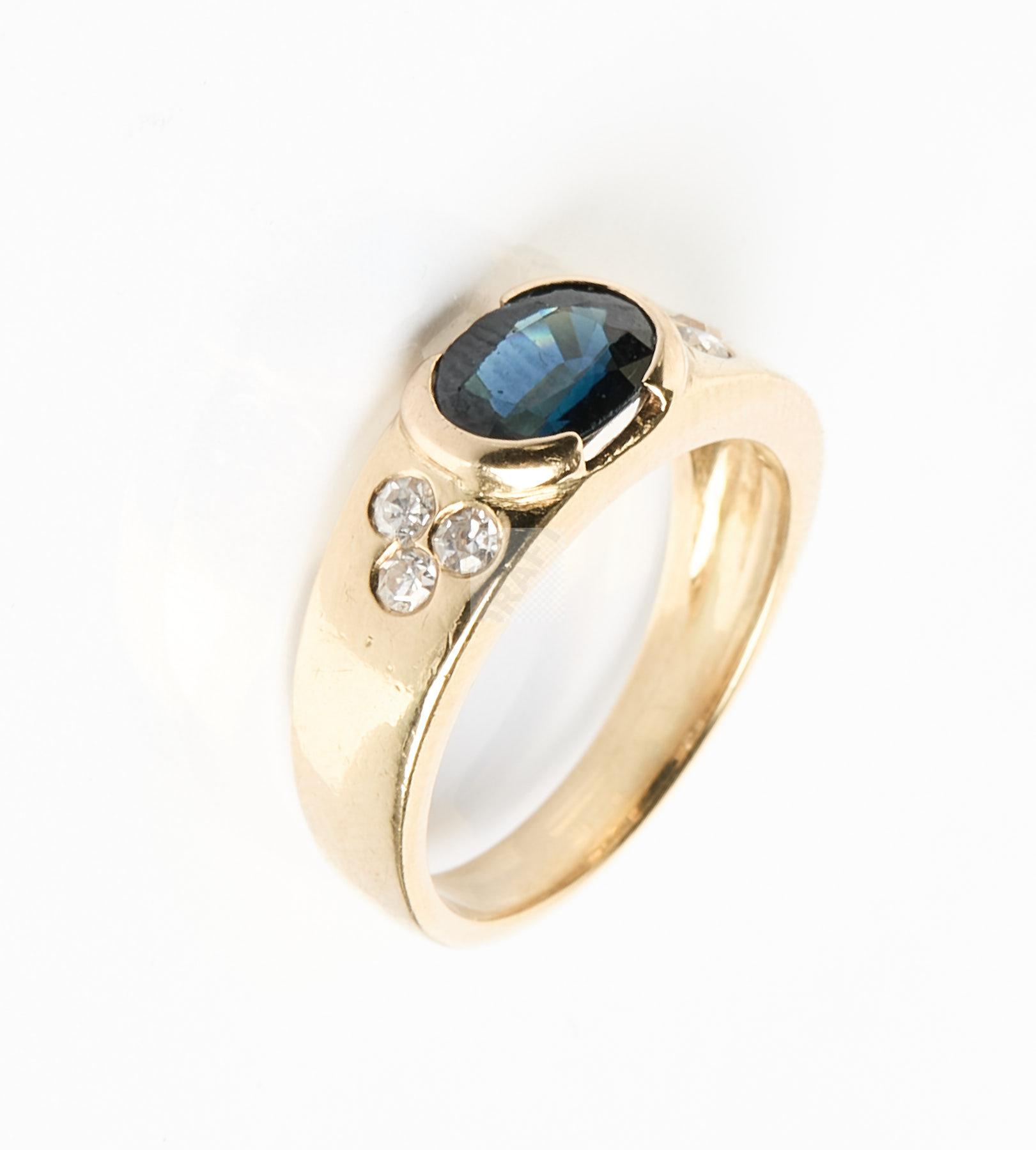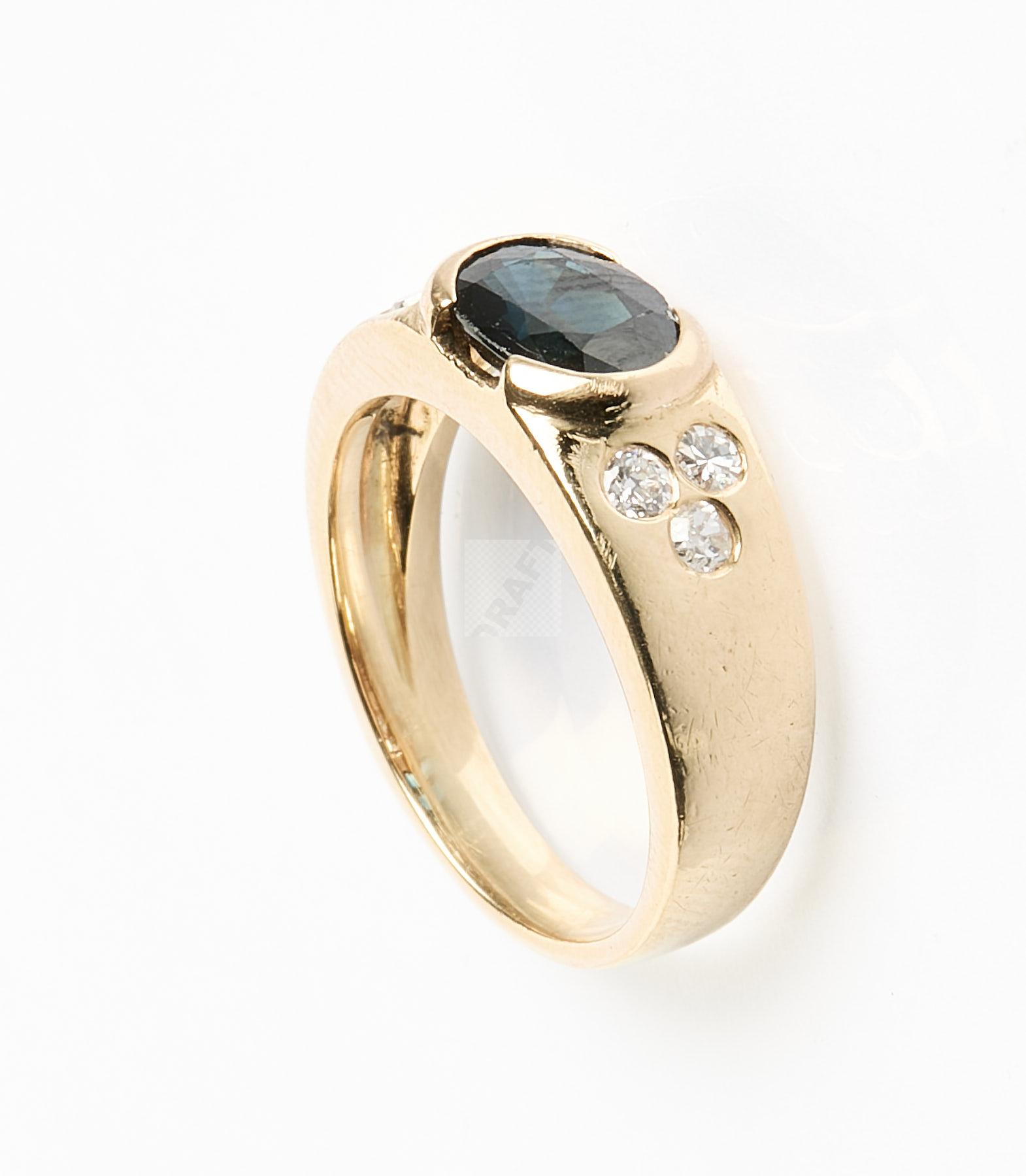 265 Bague jonc plat en or jaune sertie demi-clôt d’un saphir d’un poids estimé à 1,50 ct épaulé de 6 diamants taille 8/8, tour de doigt 52, poids 5,9 g 1347