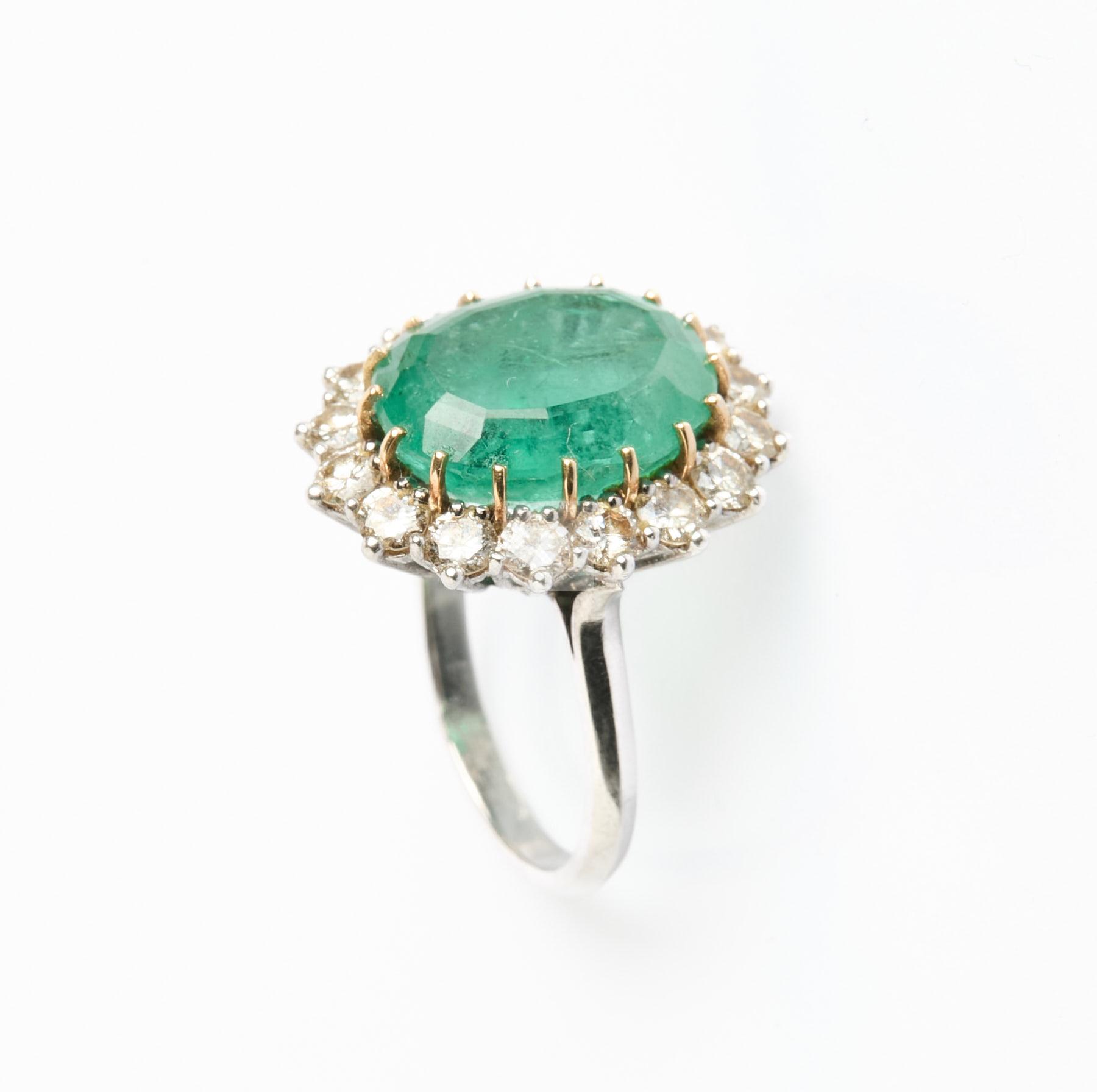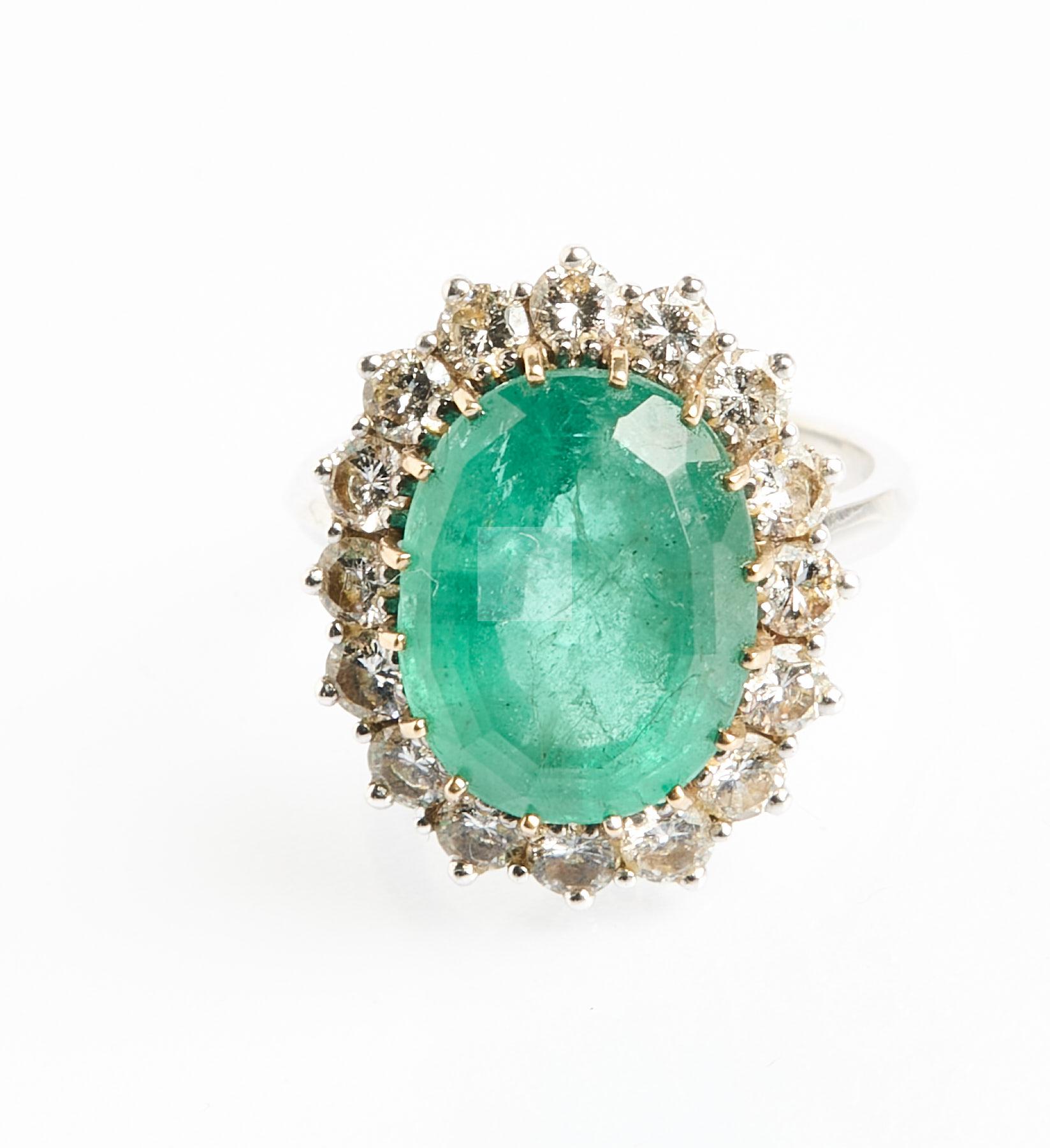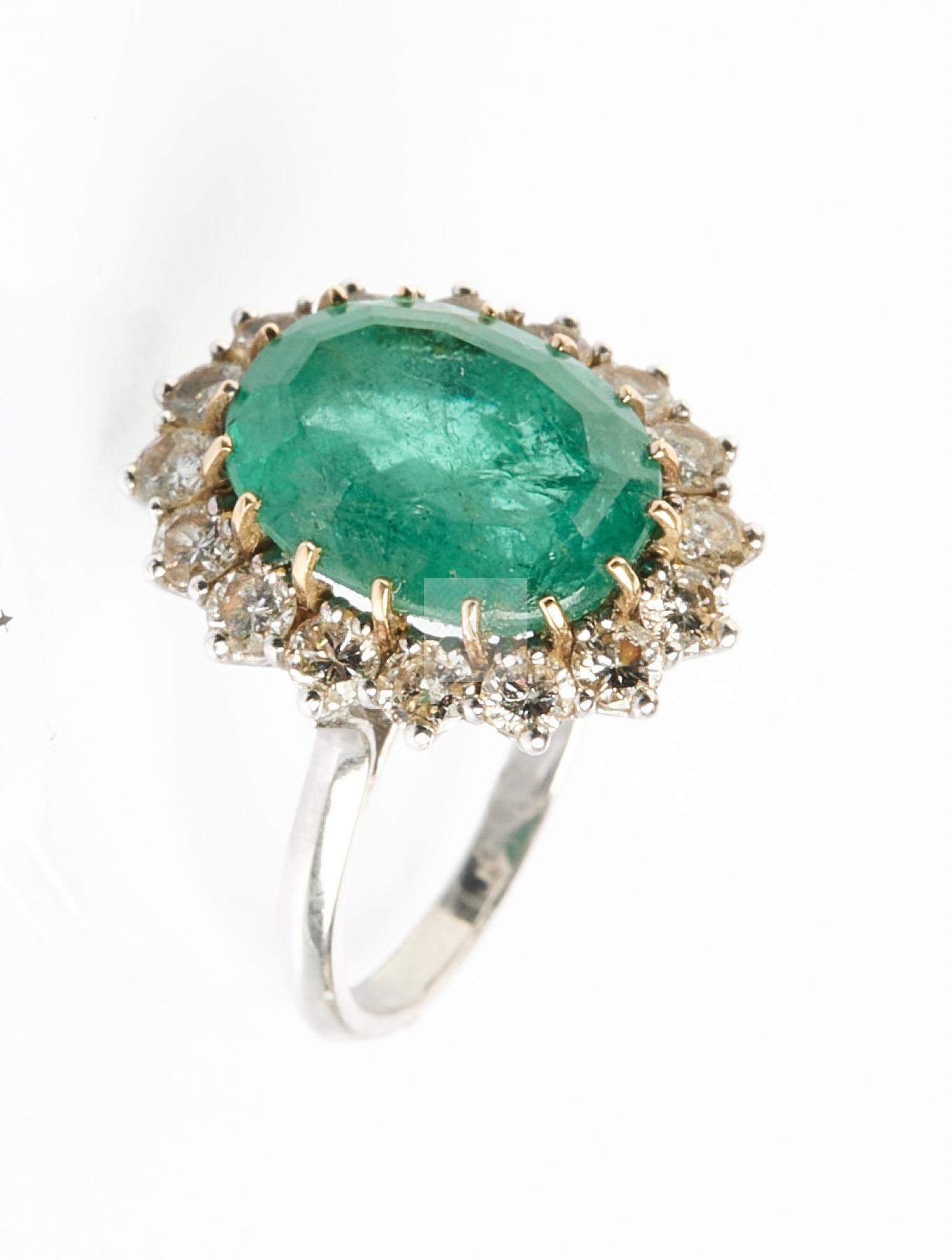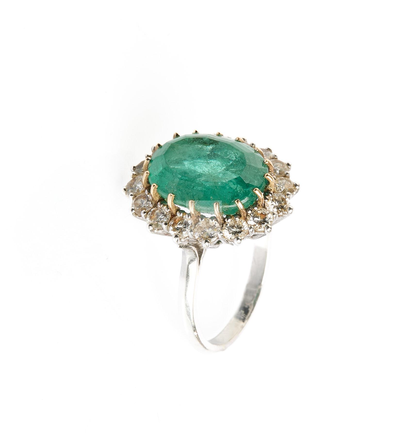 269 GARDÈS : Bague en or gris sertie d’une émeraude ovale d’un poids estimé à 6 ct, entourée de 16 diamants brillantés totalisant environ 1 ct , tour de doigt 51, poids 6,75 g