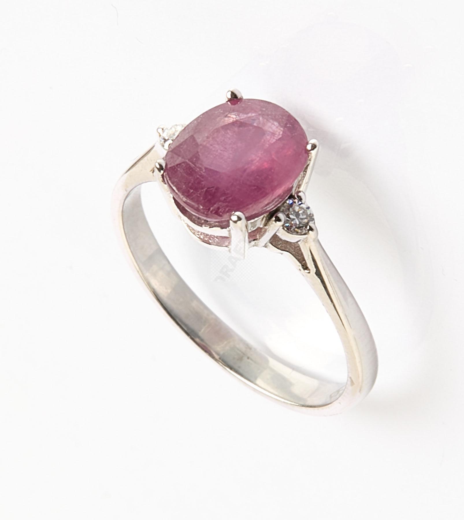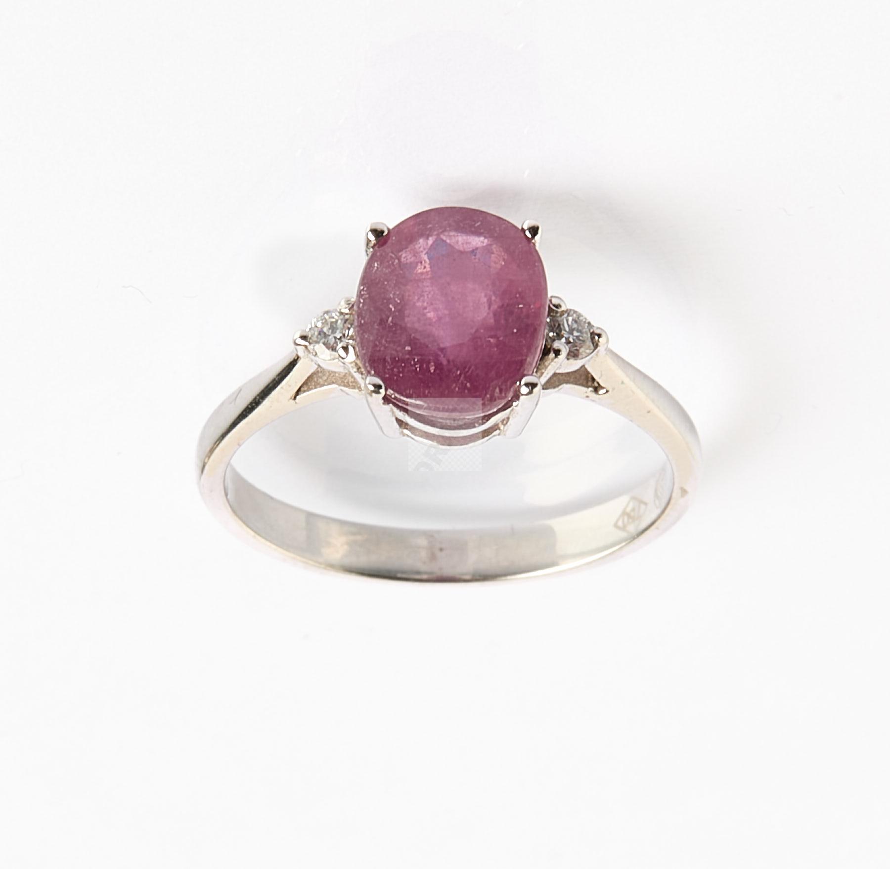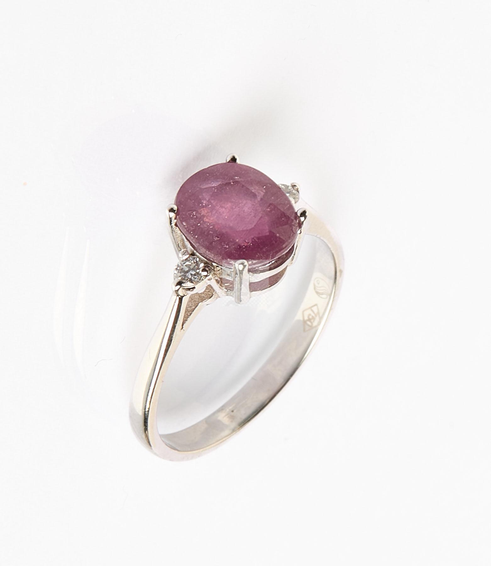Lot n°304 - 304 Bague en or gris 750 ‰ sertie d’un rubis et deux diamants, tour de doigt 54,