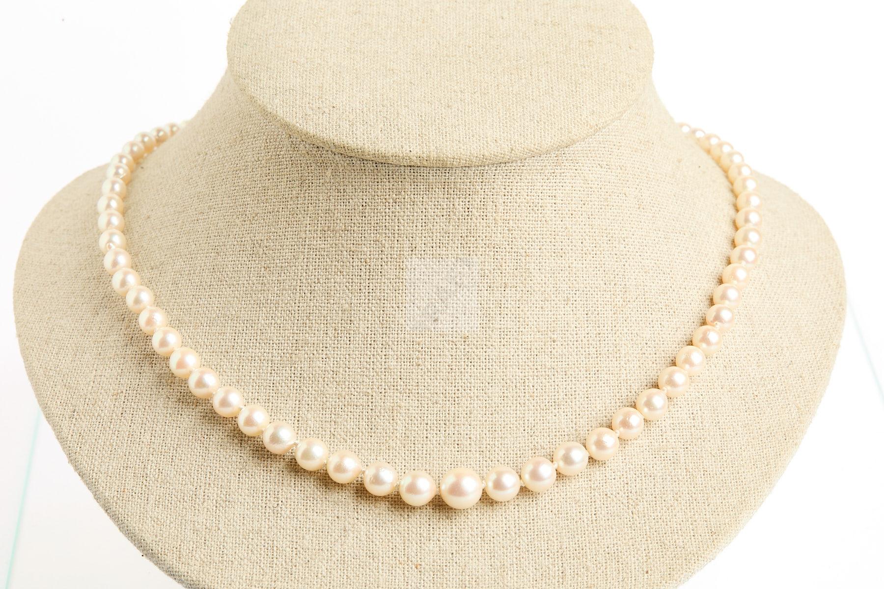 314 Collier de 83 perles de culture en chute de 4 à 8,2 mm, le fermoir fusée en or jaune 750‰ avec chainette de sécurité, longueur 52 cm, poids brut 20,7 g
