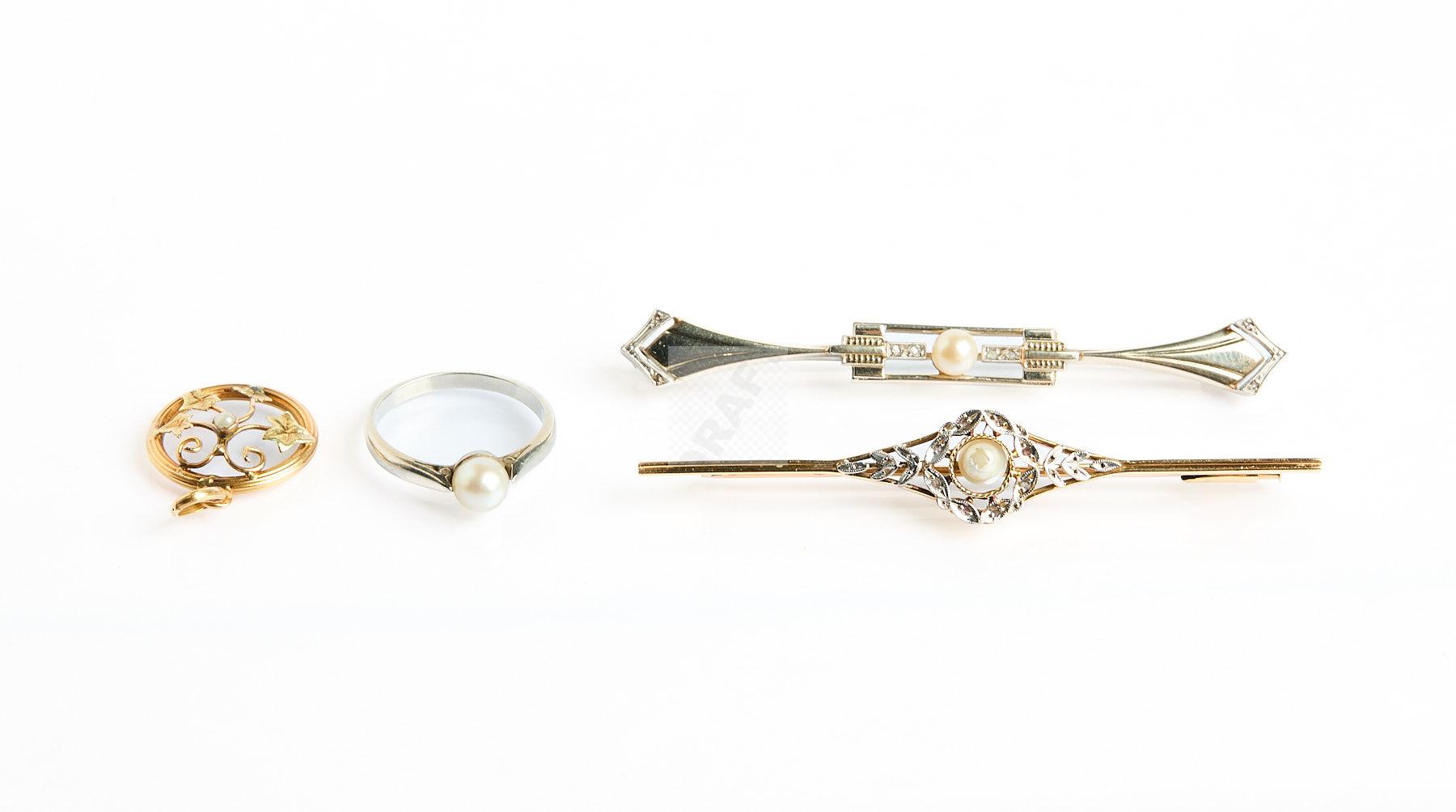 316 Deux barrettes, une bague, un pendentif or gris, or jaune 750 ‰, petites perles (usures), 1910-1920, poids 10 g
