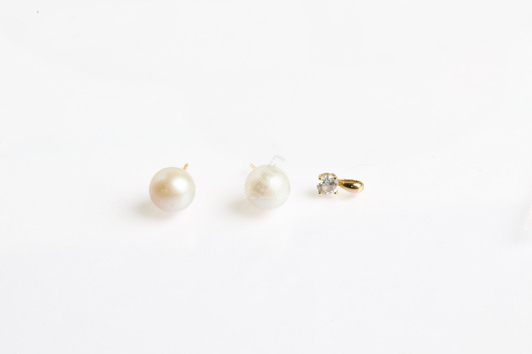327 Paire de clous d’oreilles perles de culture de 8,4 mm sur tiges or 750 ‰ poids brut 1,9 g (manquent les systèmes) on joint un pendentif or et pierre blanche, poids 0,20 g