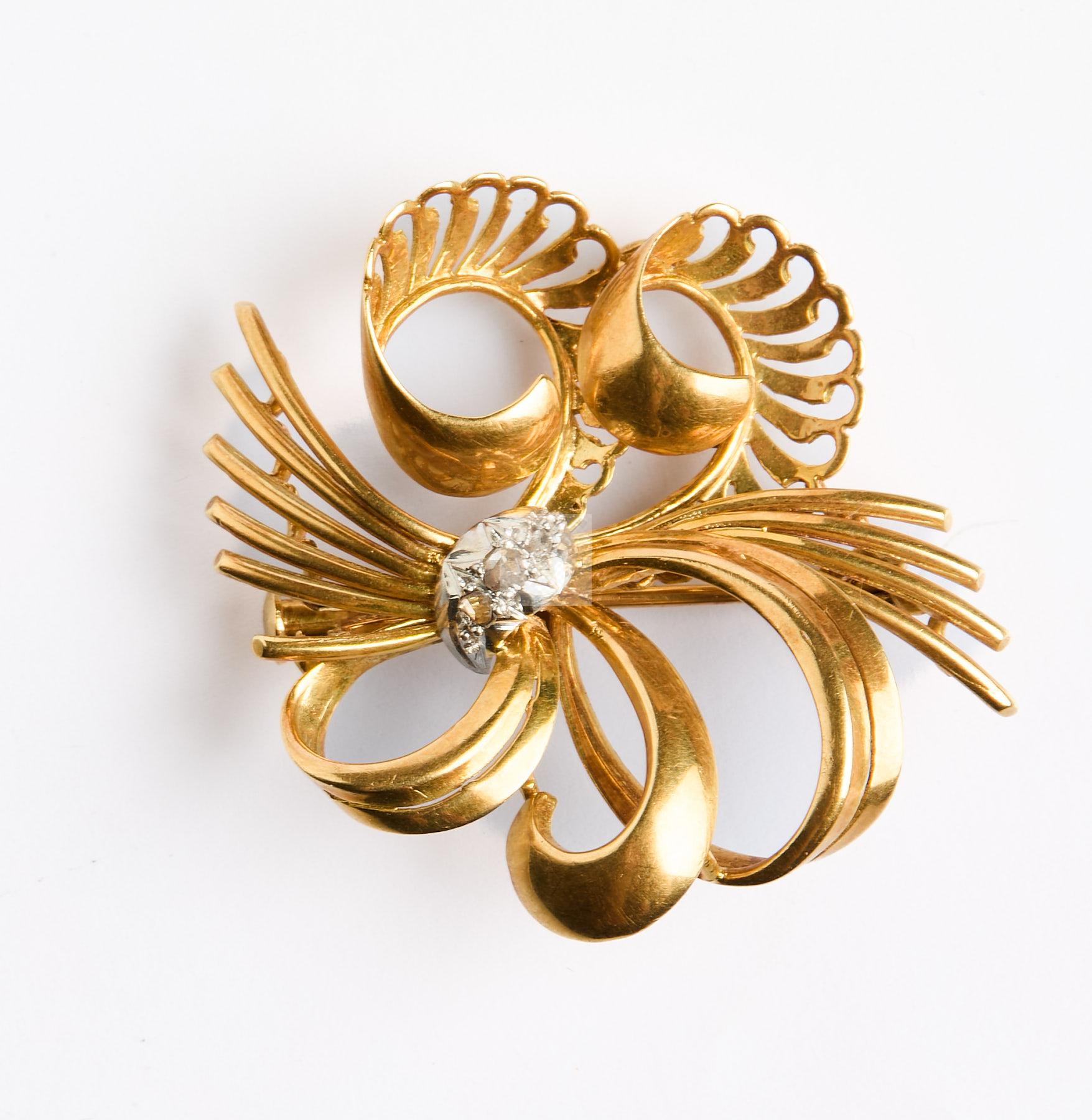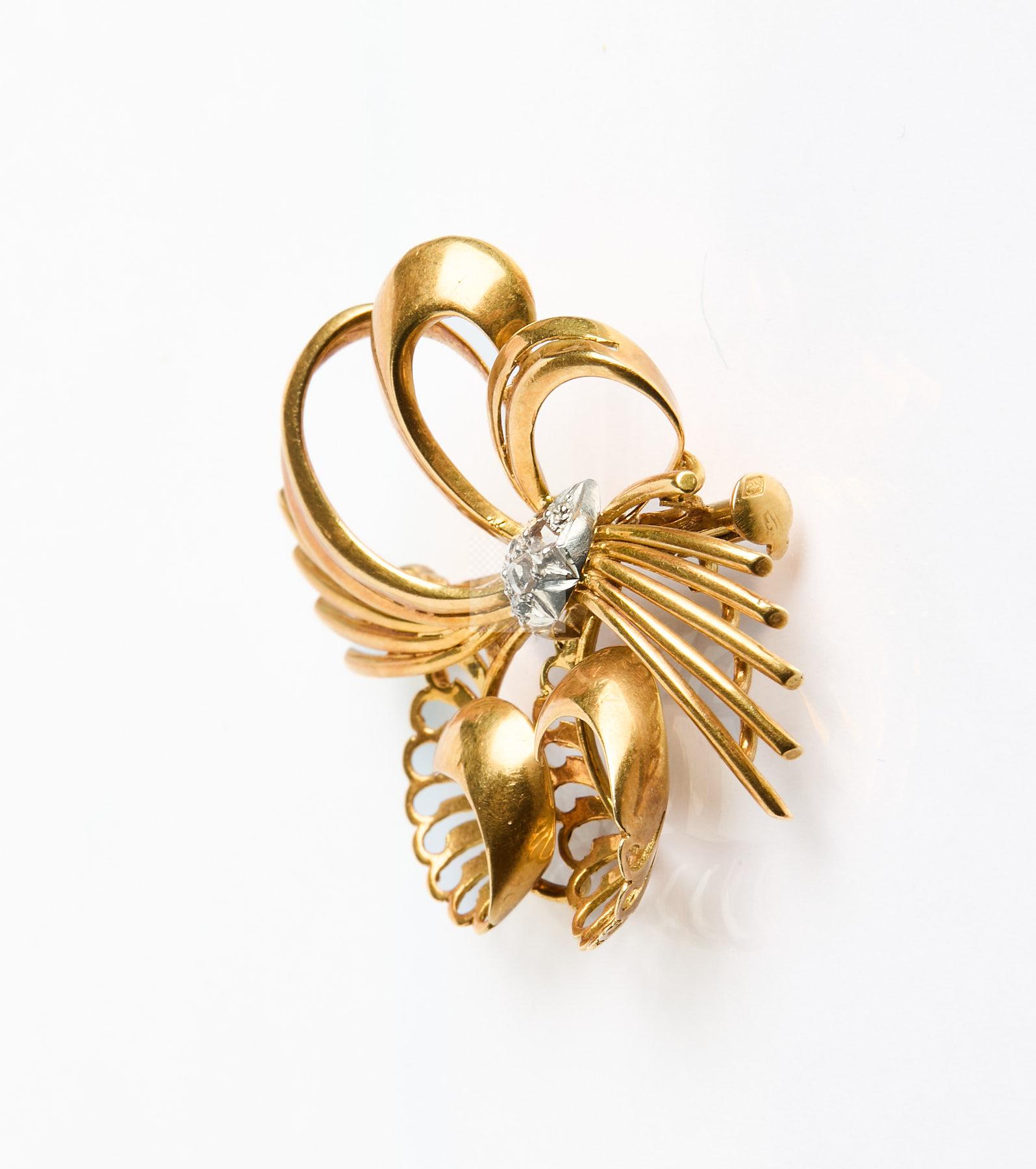 Lot n°329 - 329 Broche bouquet en or 750 ‰ et petite rose de diamant, poids 9,3 g