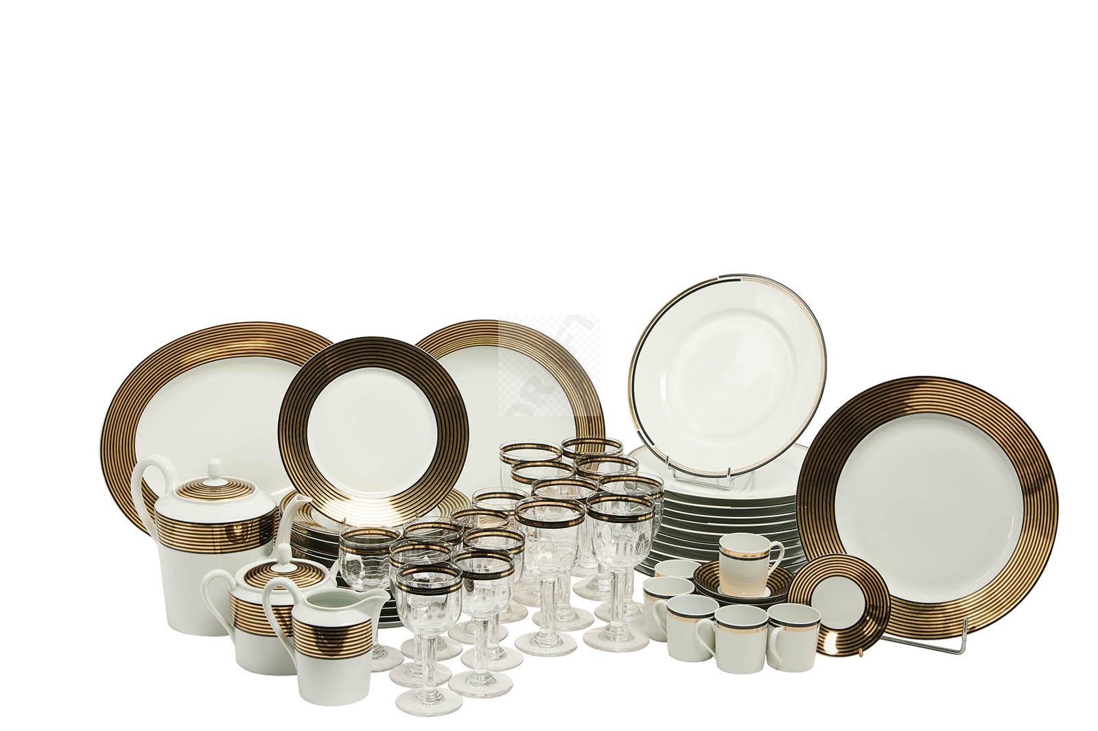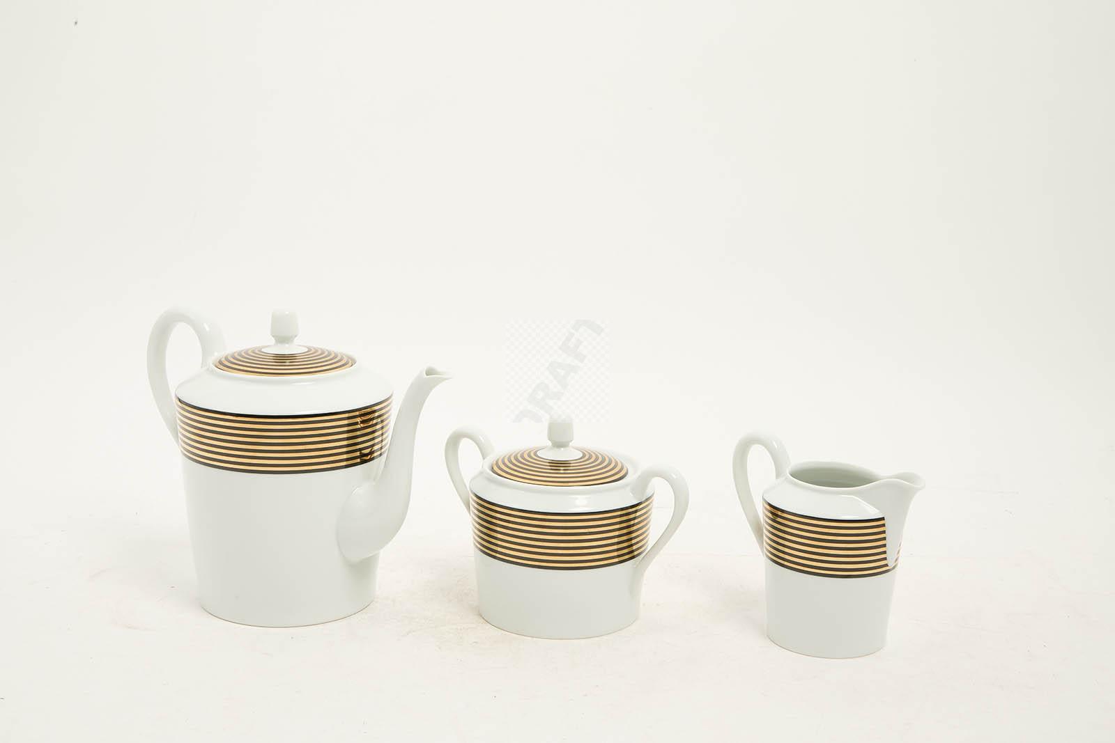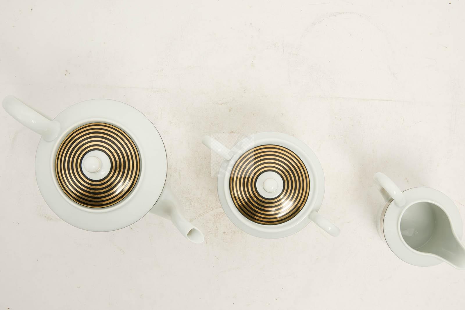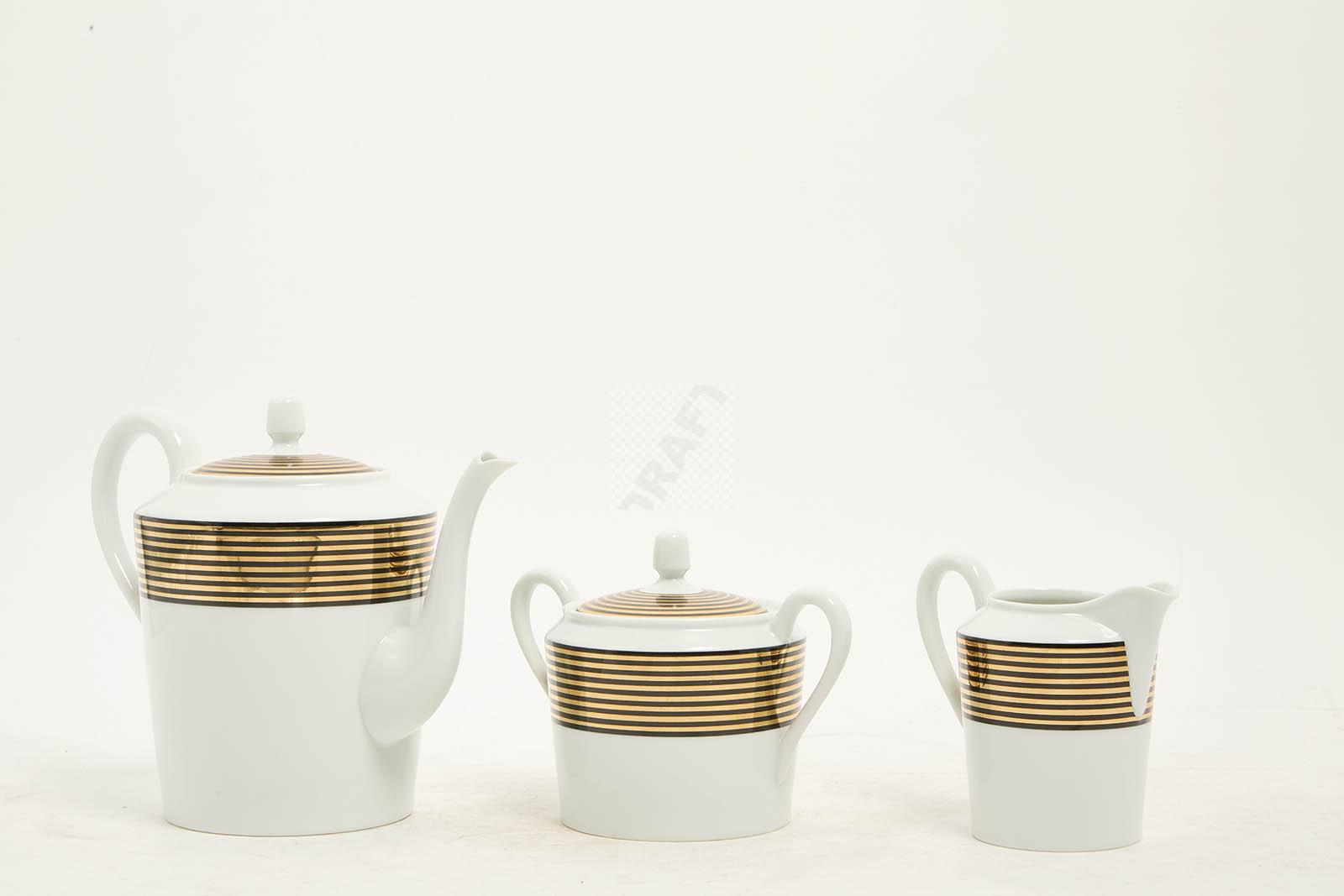 Importante et rare partie de service en porcelaine à décor style Art Déco noir et or à motifs géométriques alternés.