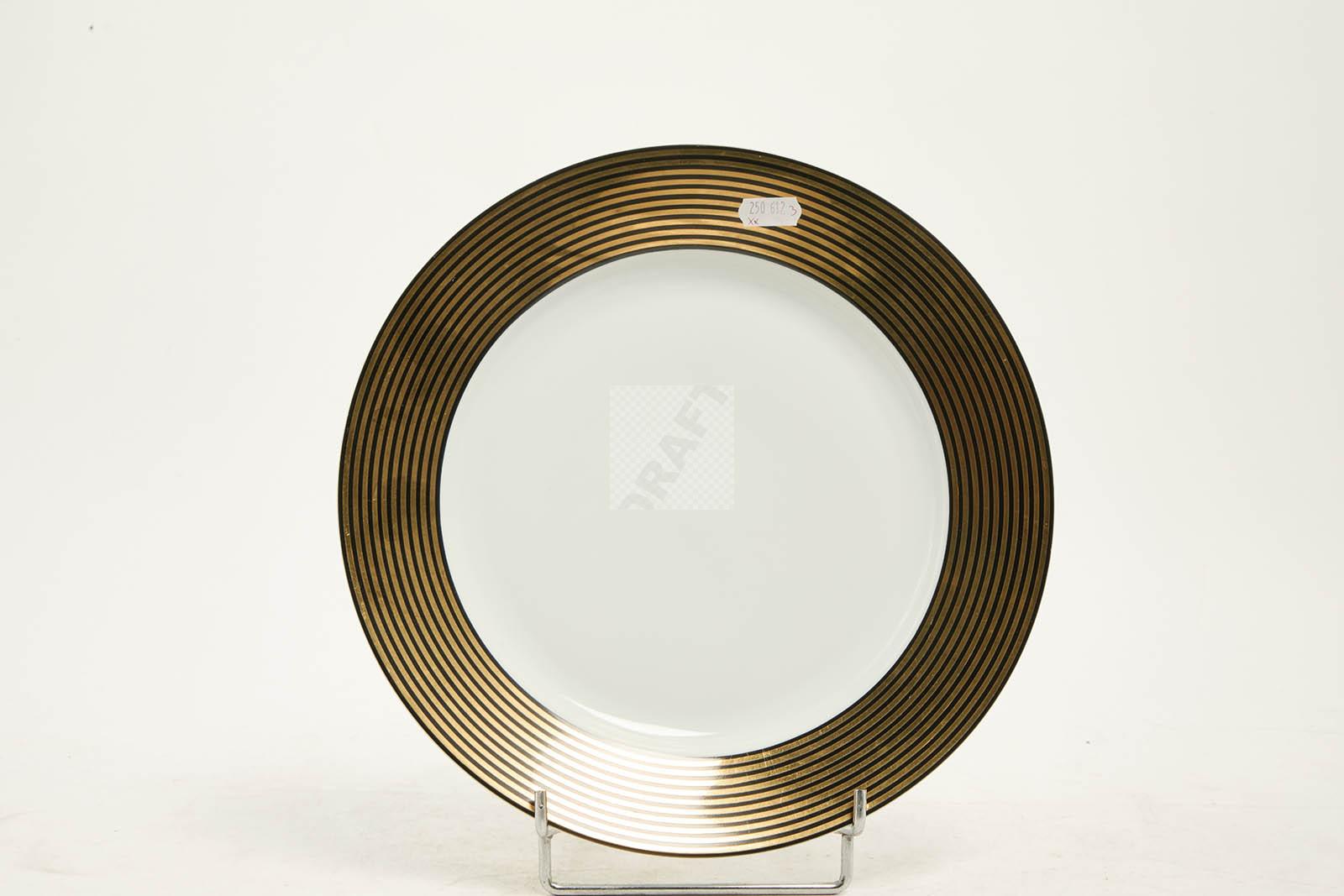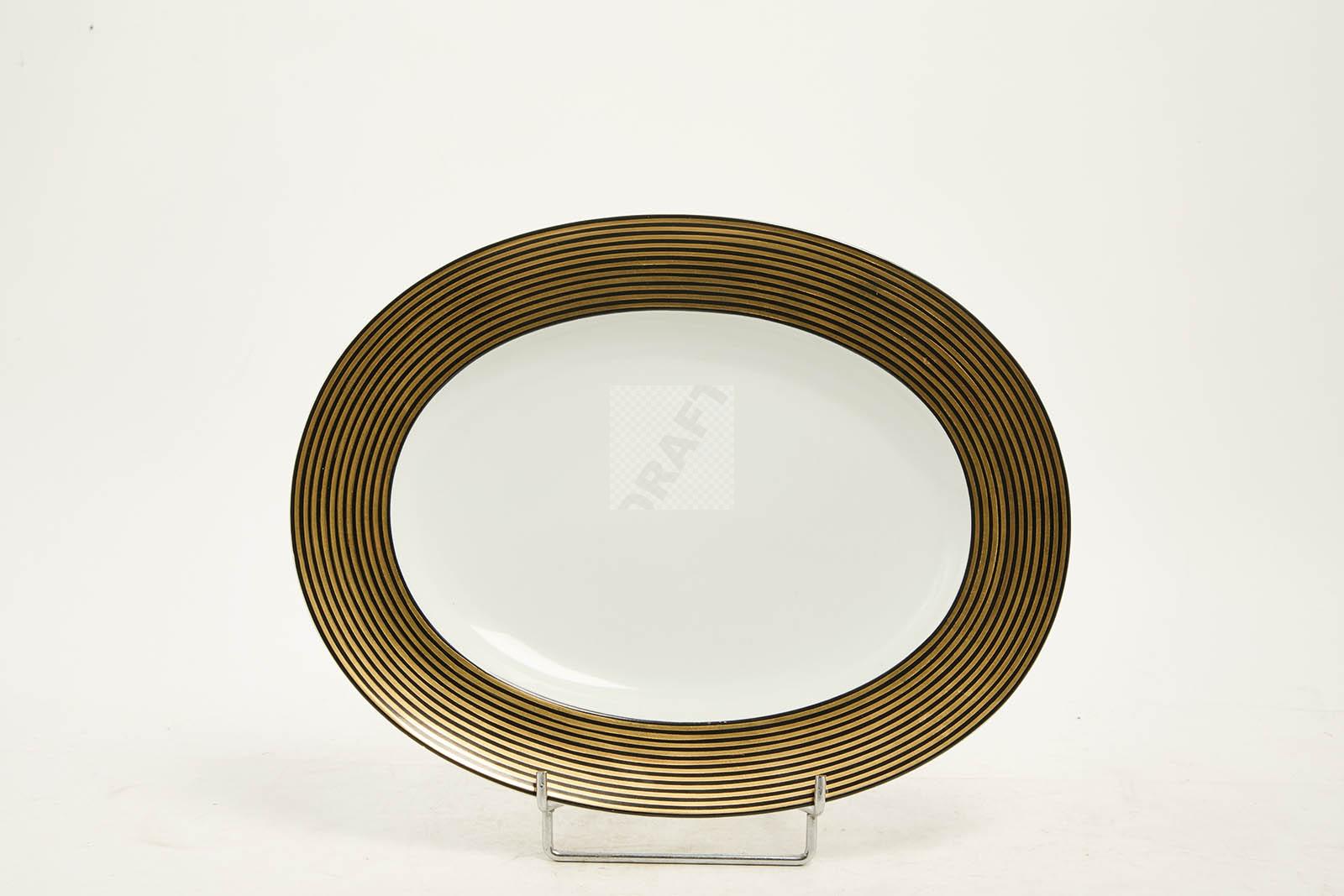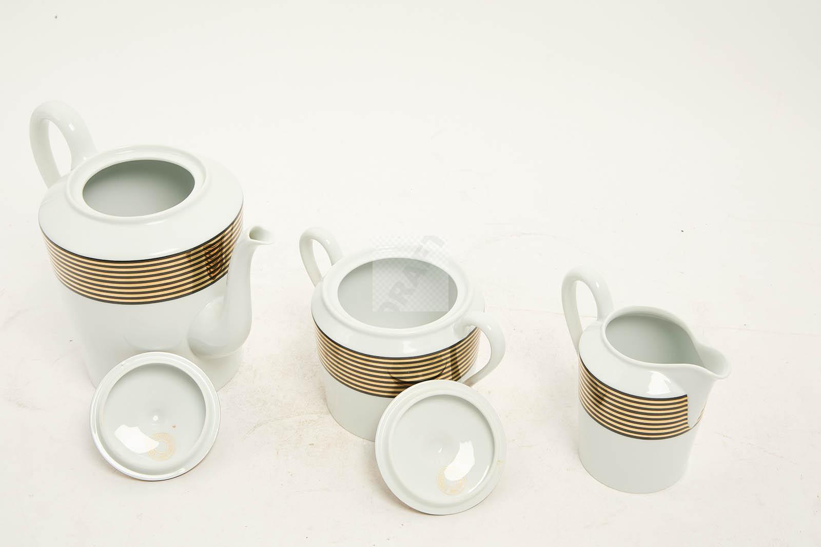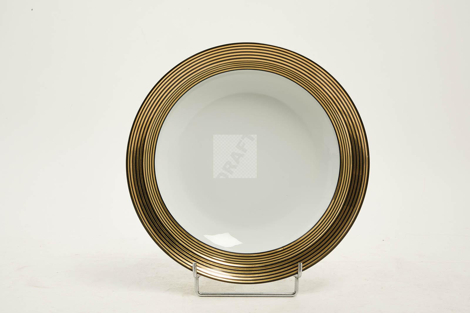 Importante et rare partie de service en porcelaine à décor style Art Déco noir et or à motifs géométriques alternés.