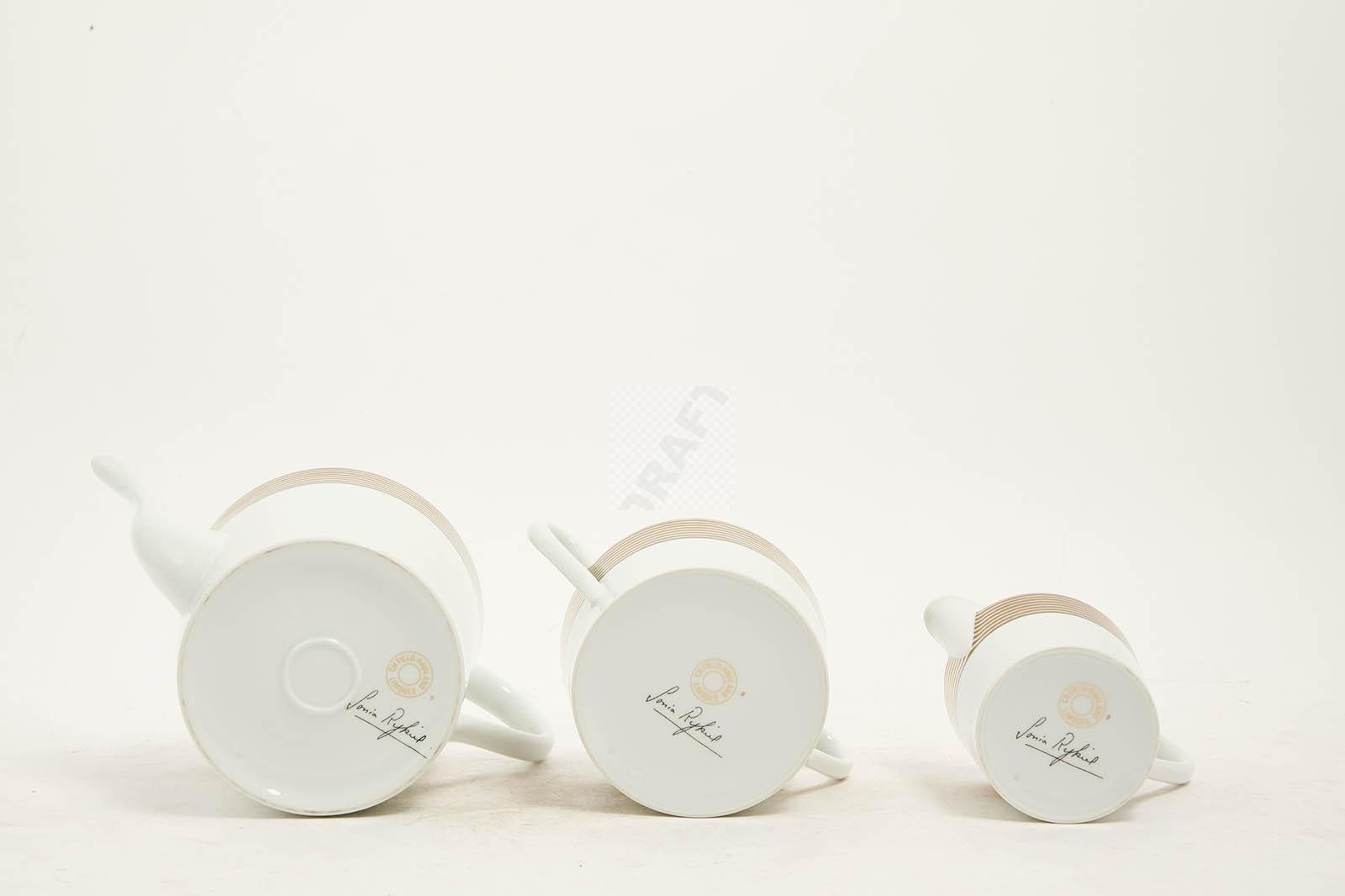 Comprend un service à café (8 sous-tassses, 6 tasses, sucrier, pot à lait, Cafetière), et une partie de service de table avec deux plats ronds creux, un plat ovale, 12 grandes assiettes et 12 assiettes à dessert.