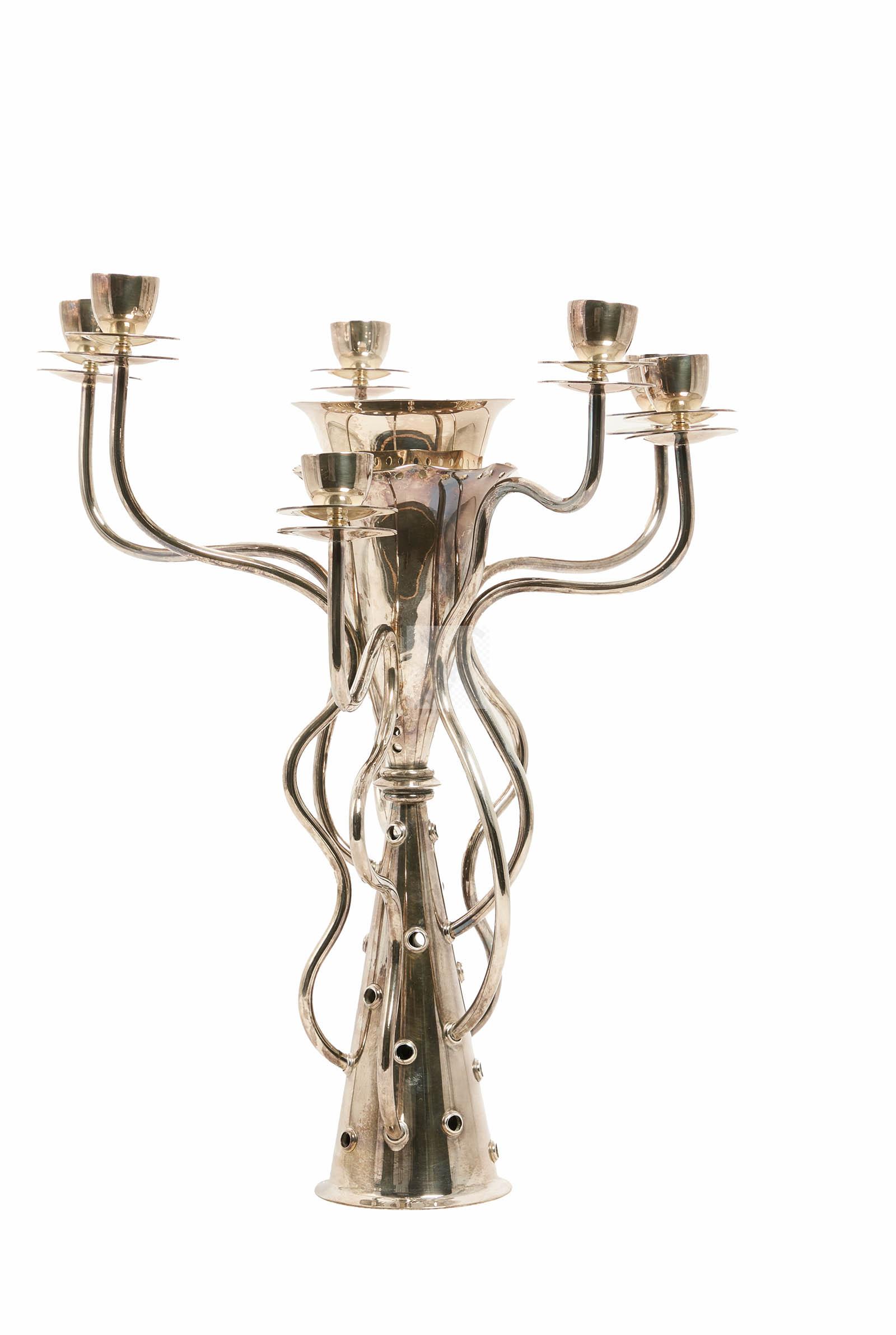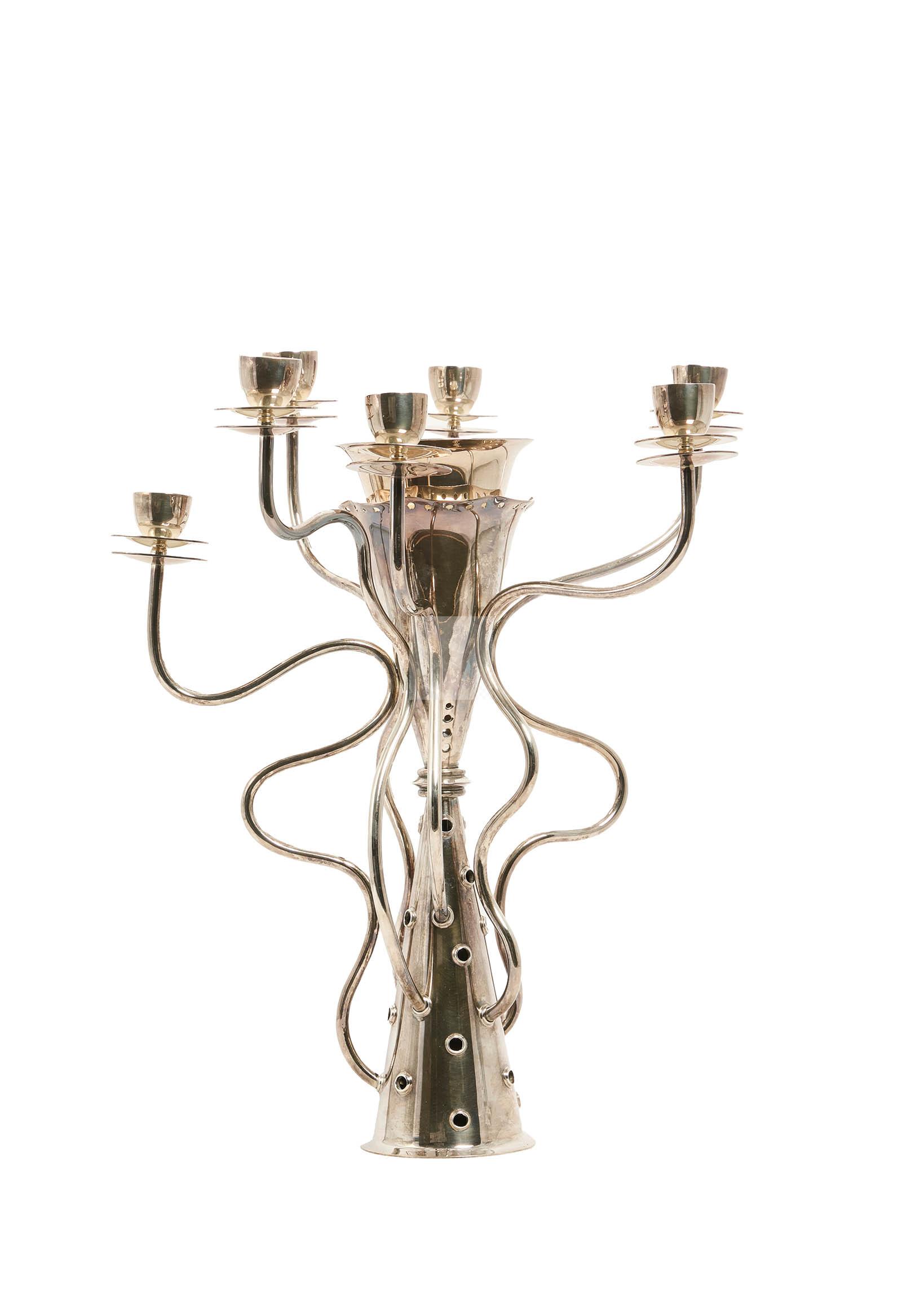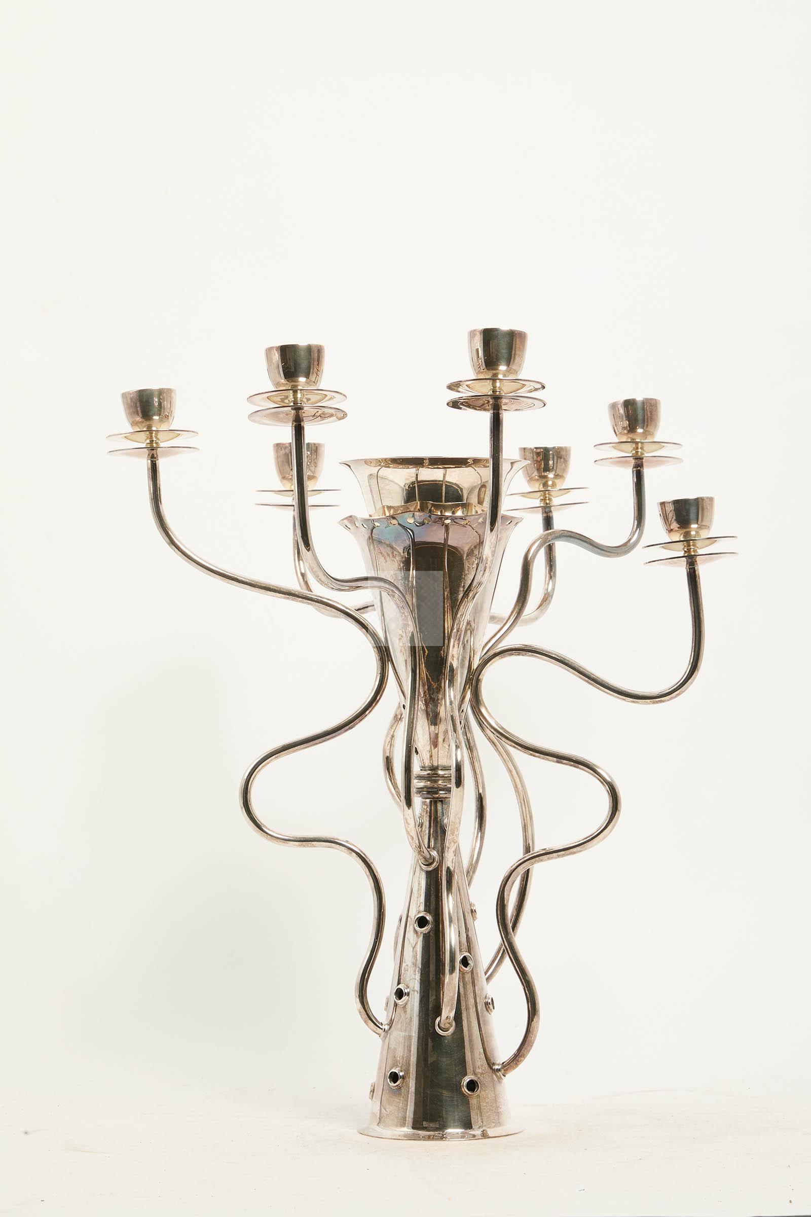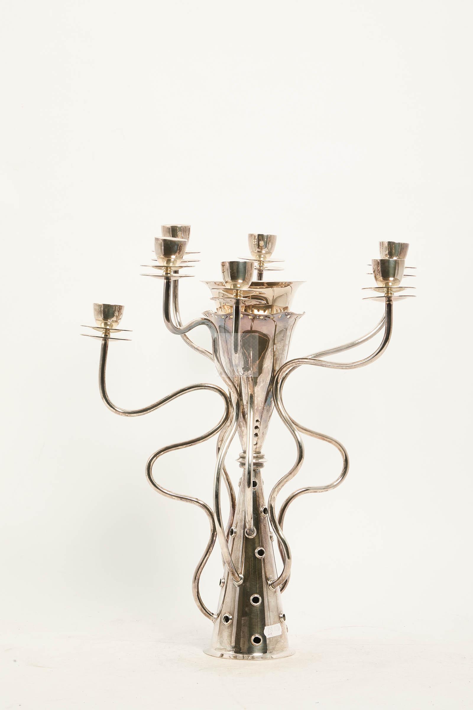 Candélabre « Simon » en métal argenté, double fût conique, et 7 bras de lumière mouvementés.