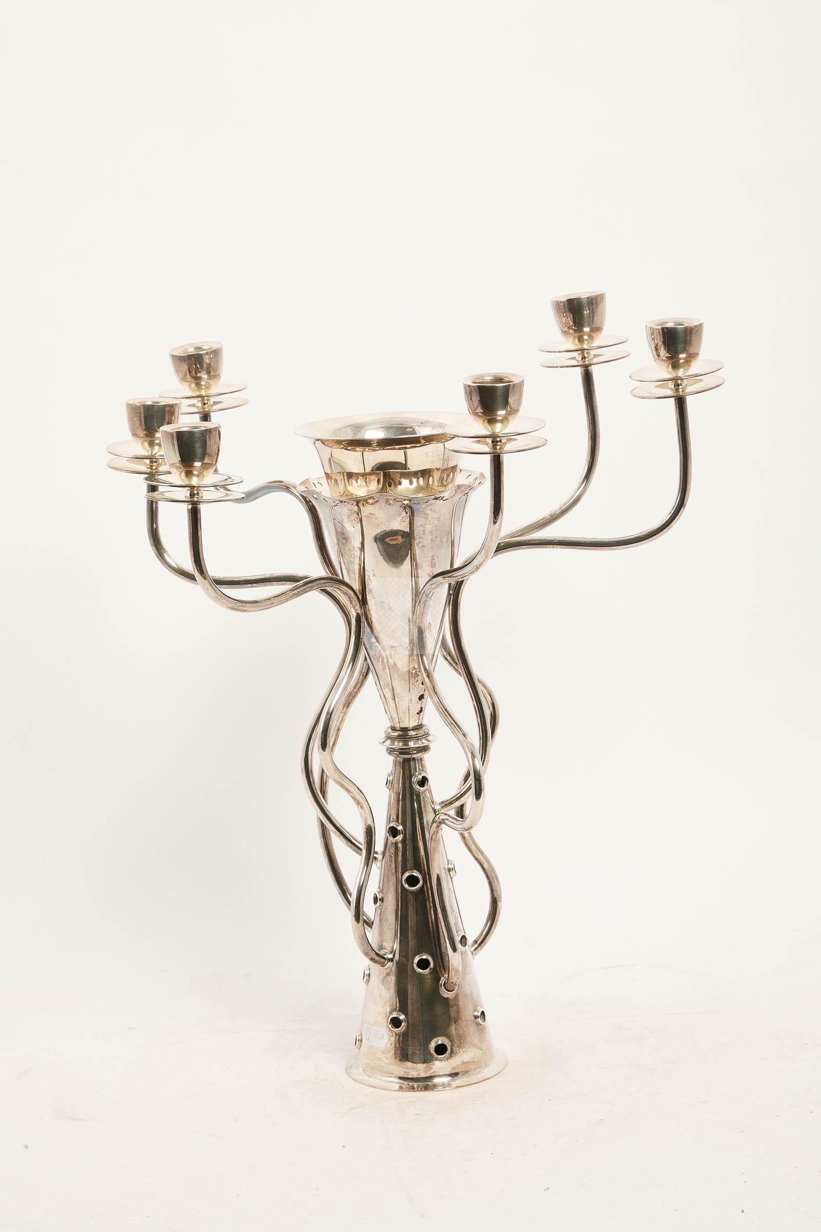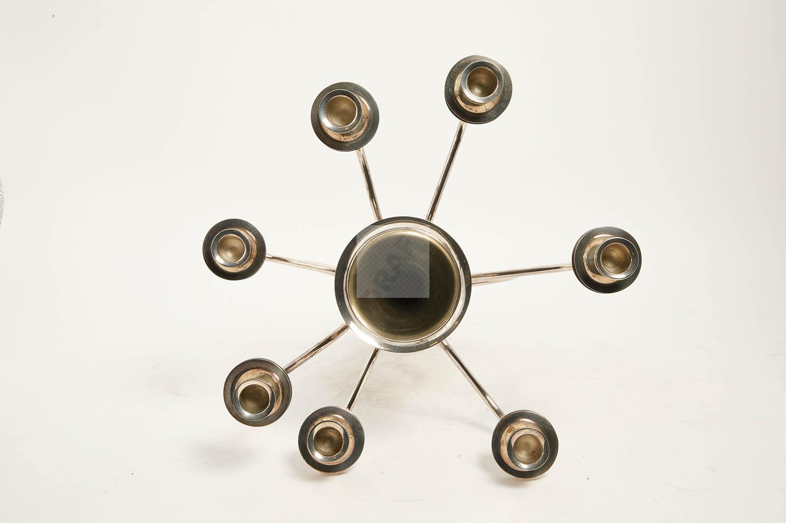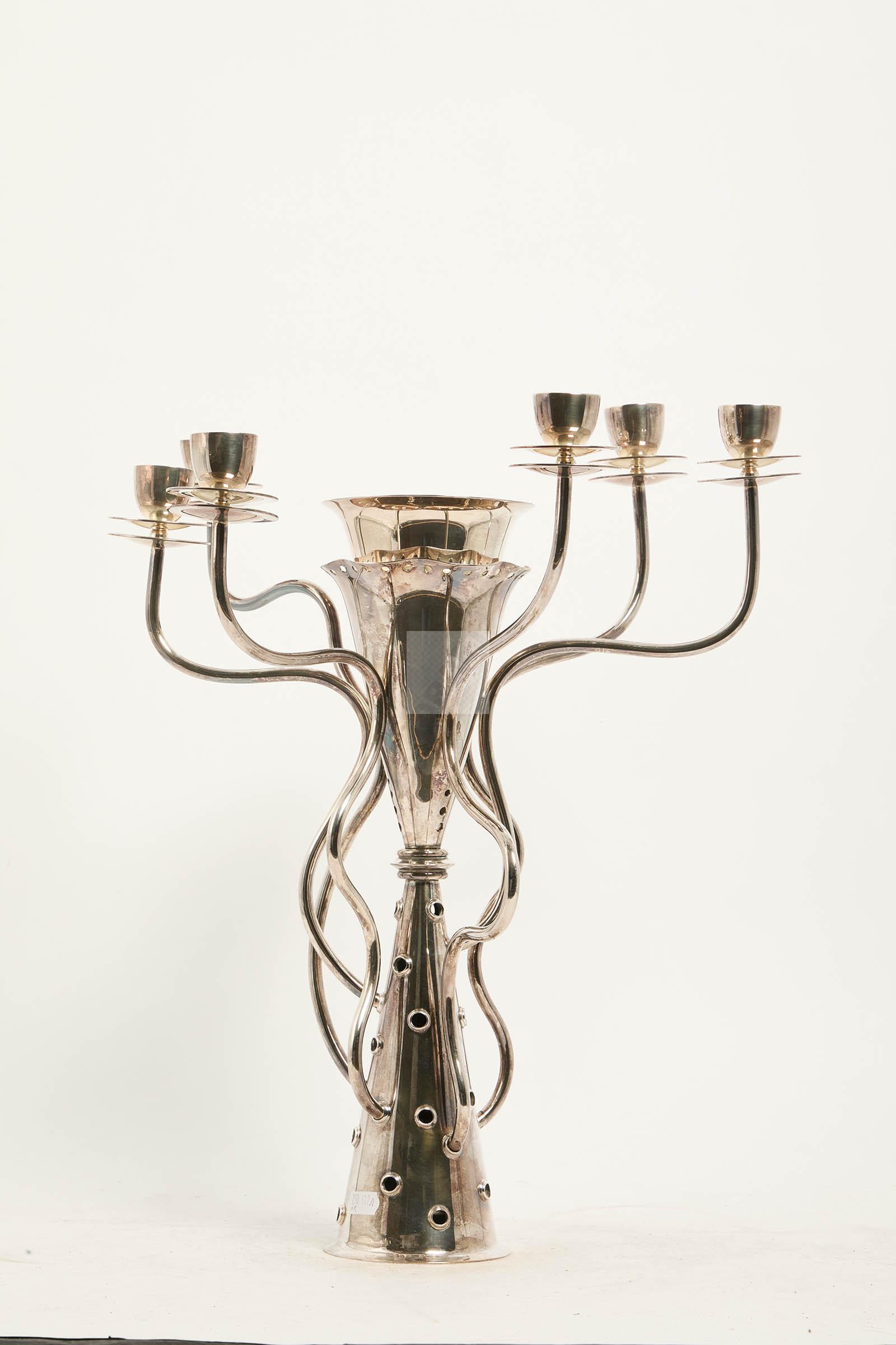 Candélabre « Simon » en métal argenté, double fût conique, et 7 bras de lumière mouvementés.