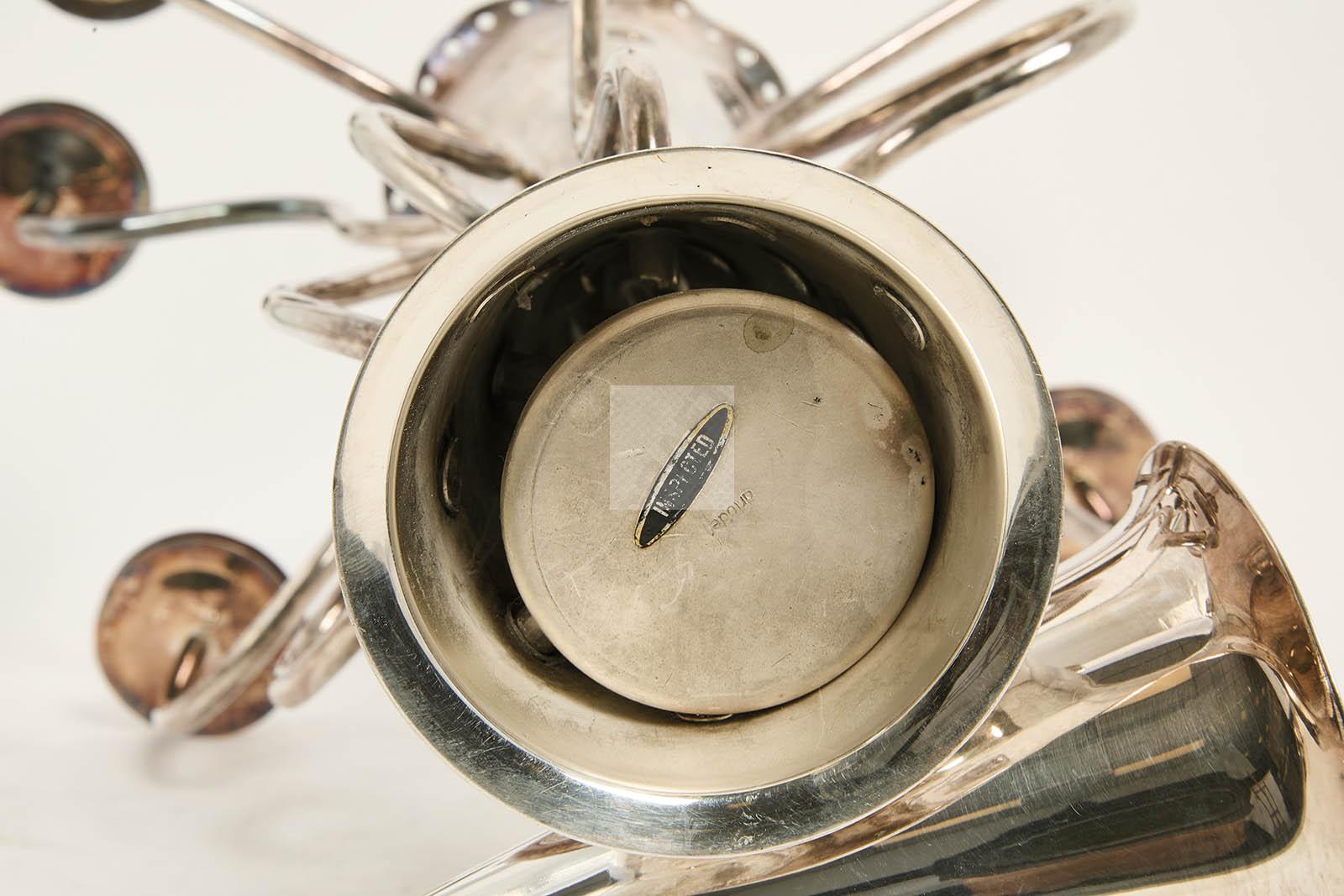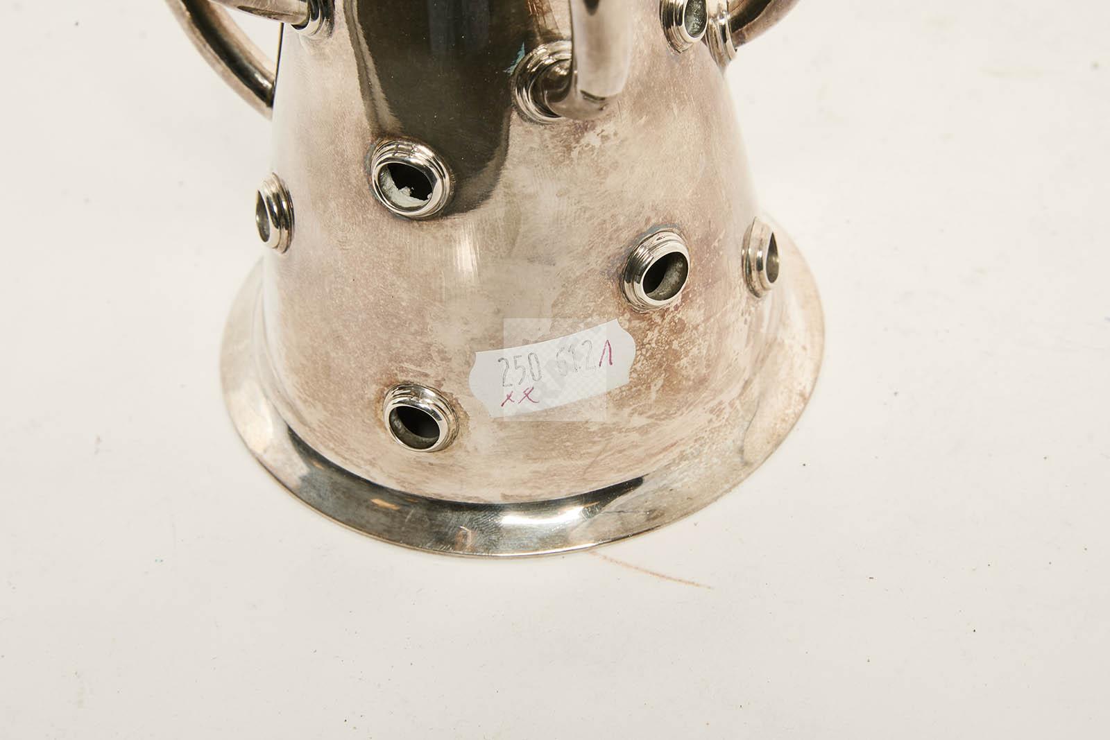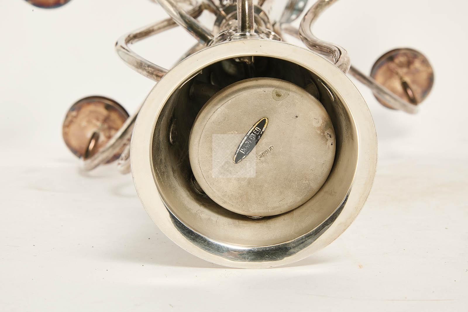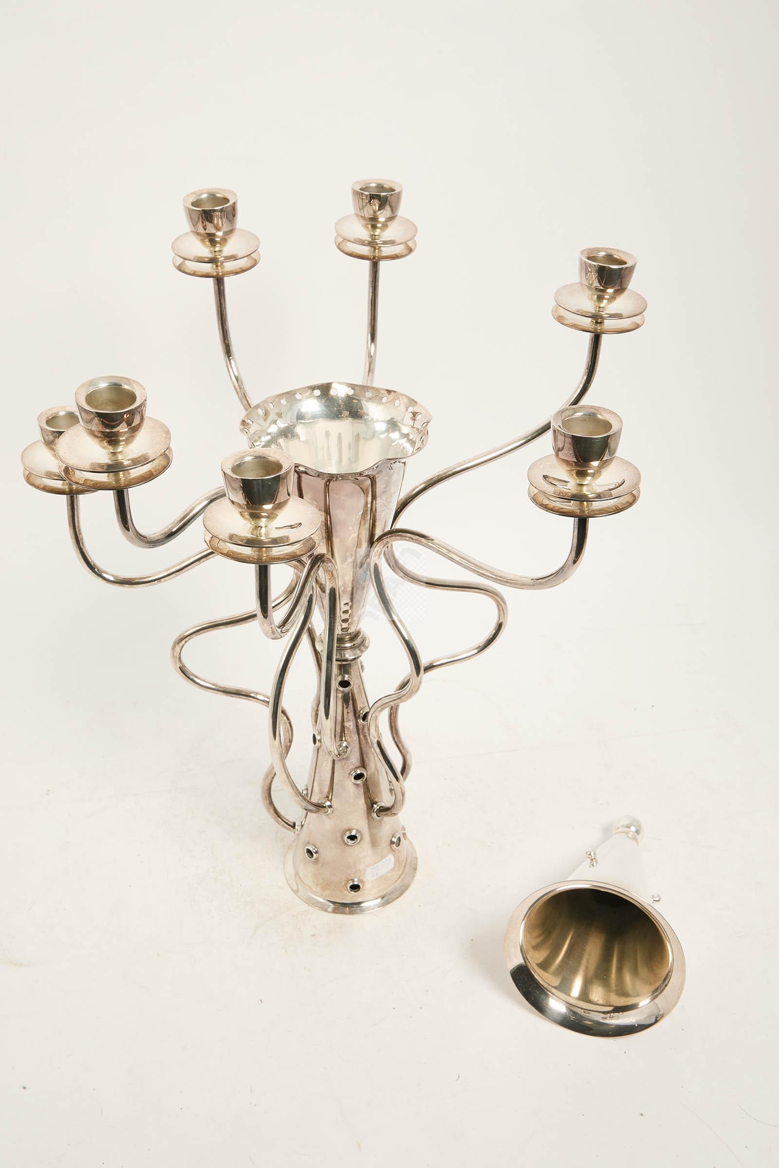 Candélabre « Simon » en métal argenté, double fût conique, et 7 bras de lumière mouvementés.
