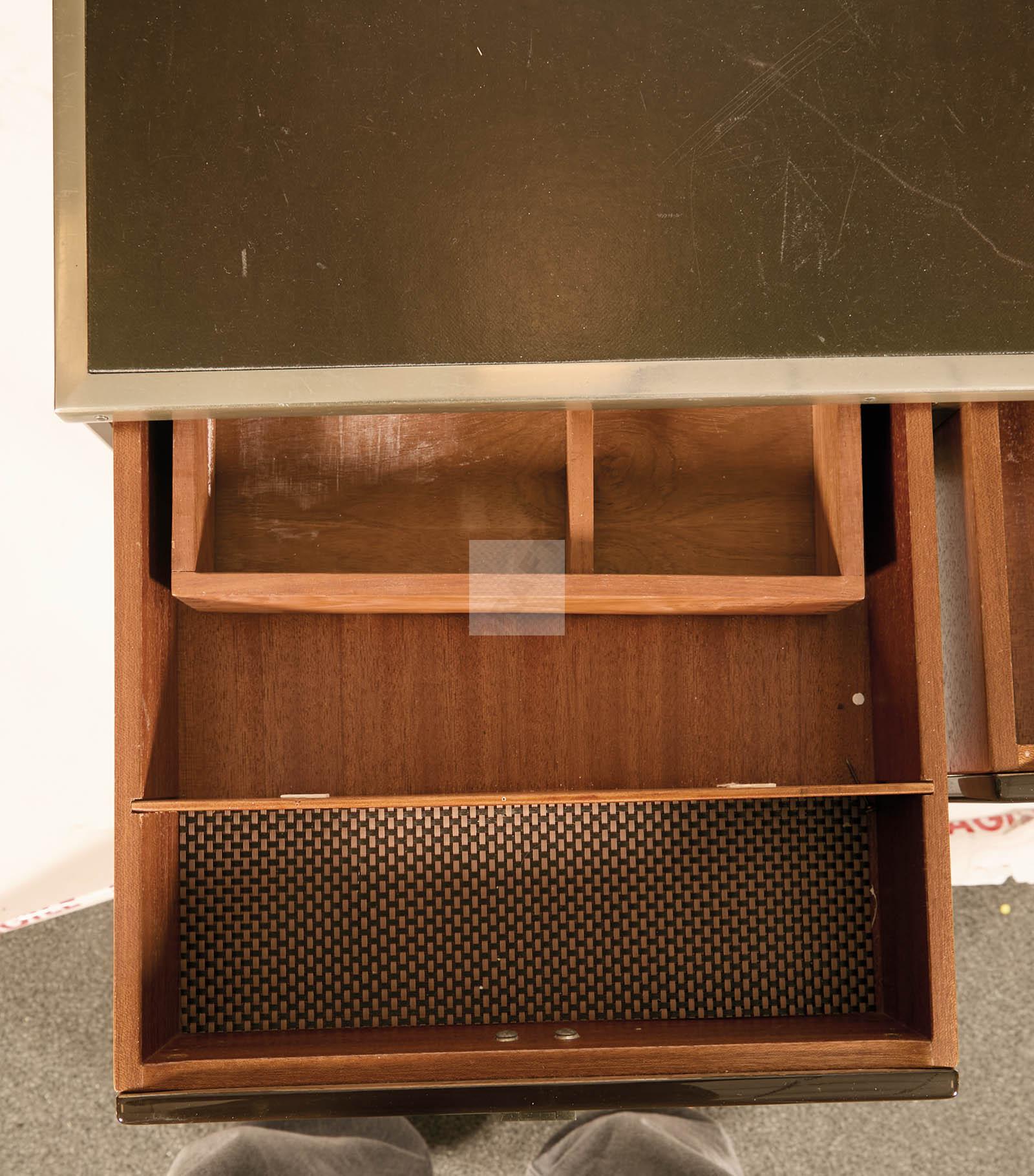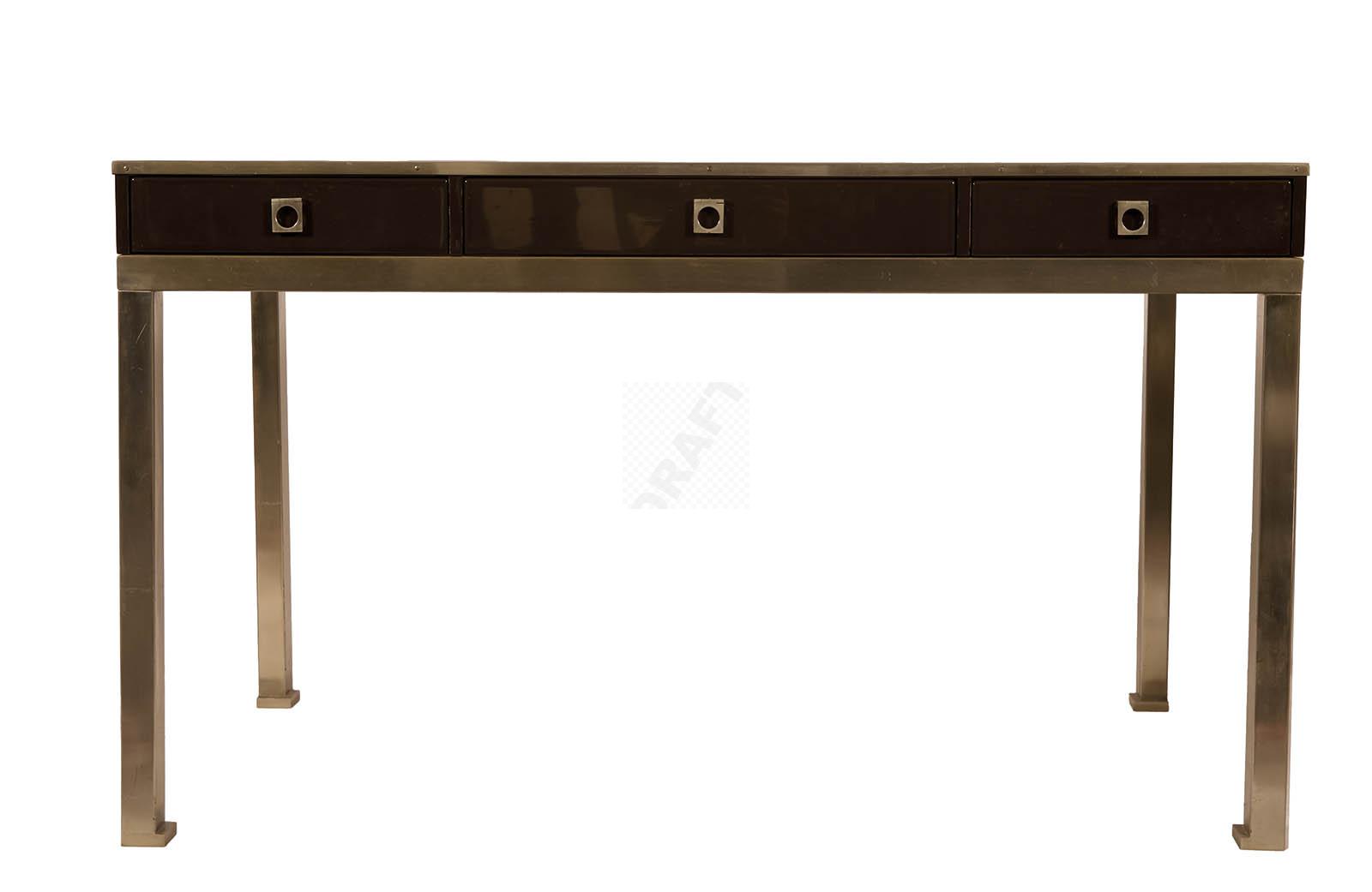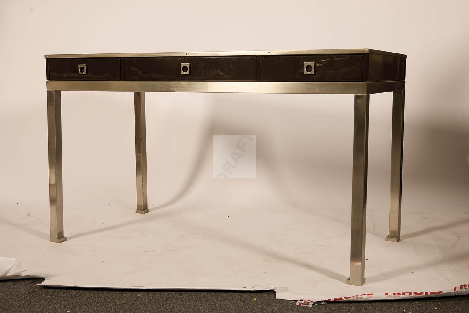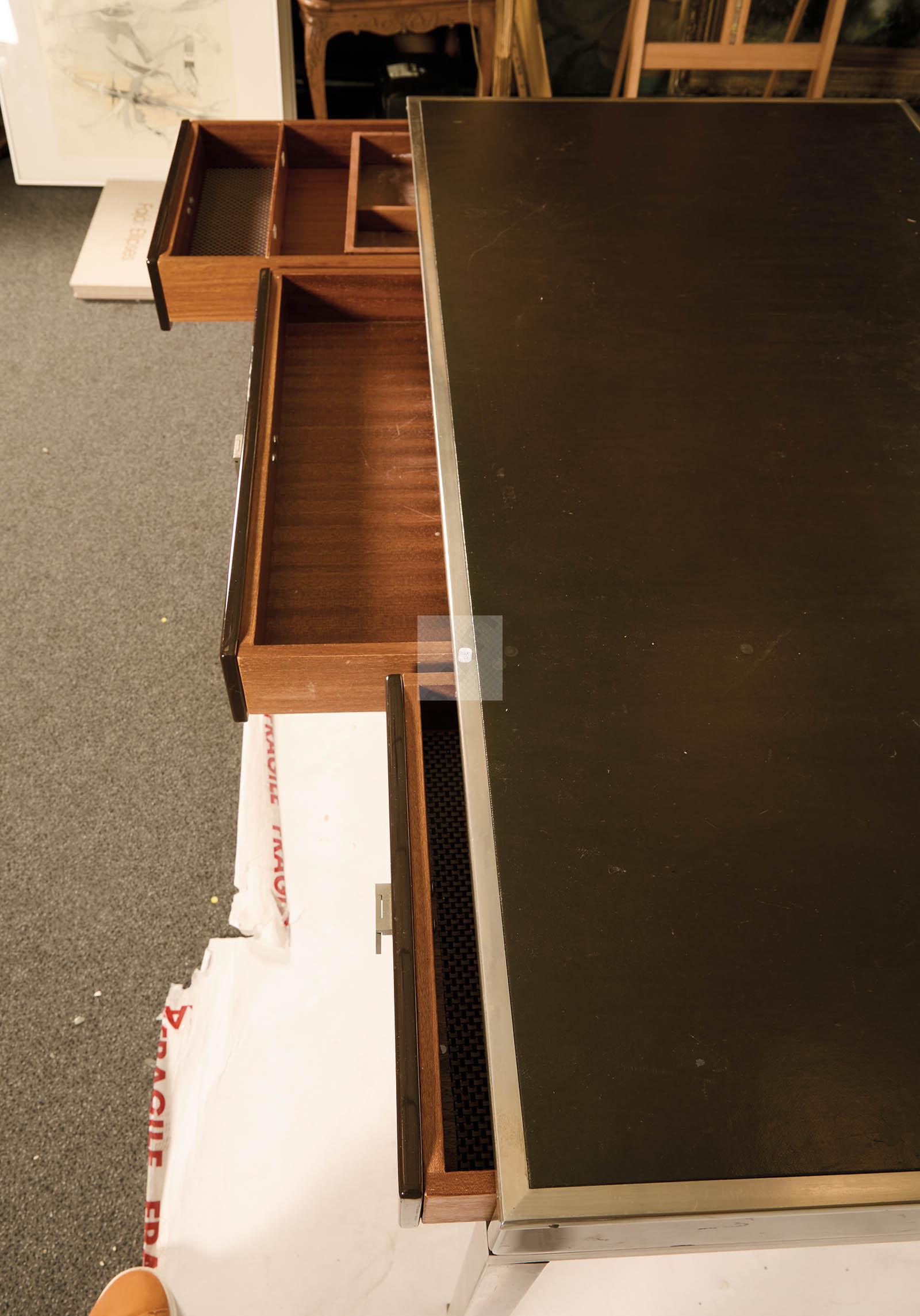 Bureau plat en métal chromé, laqué, plateau gainé de cuir